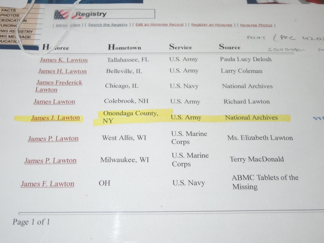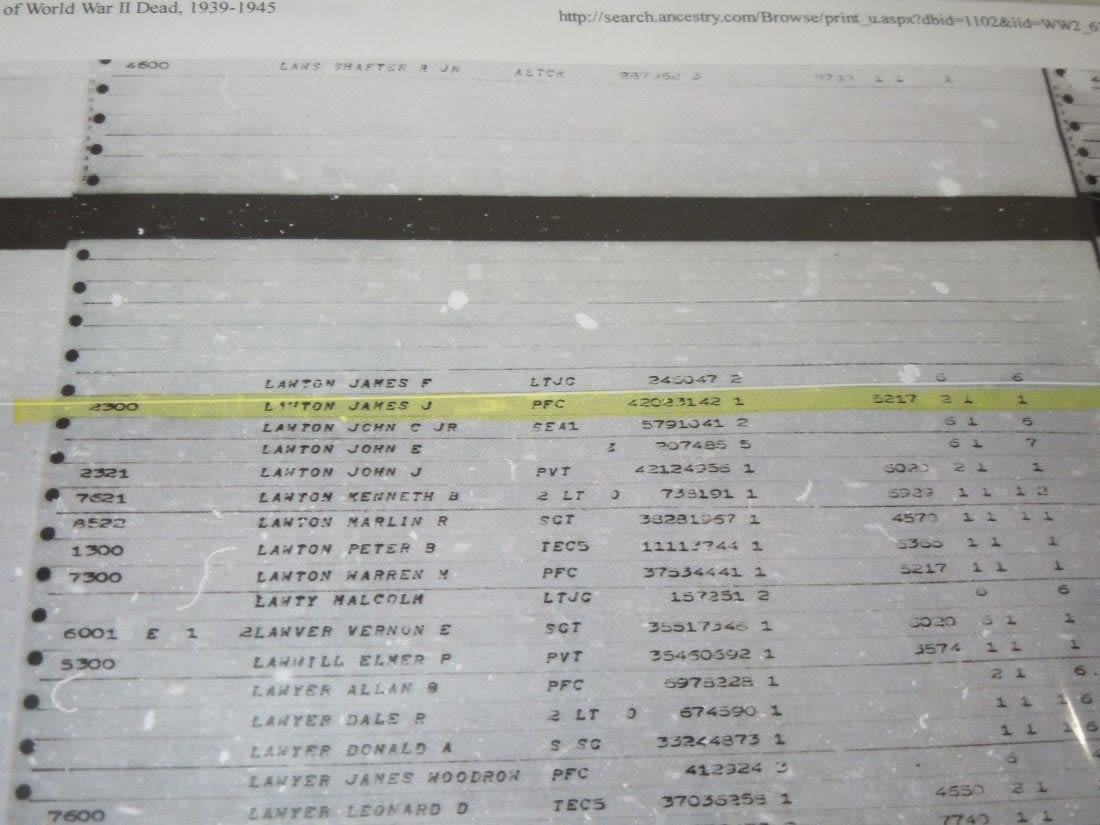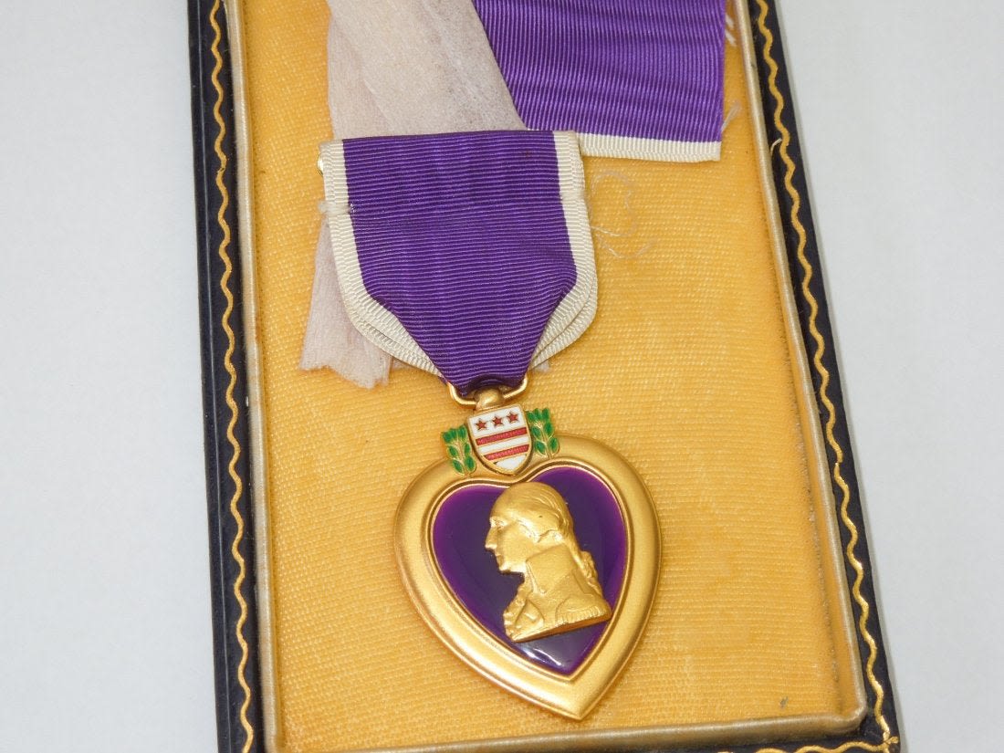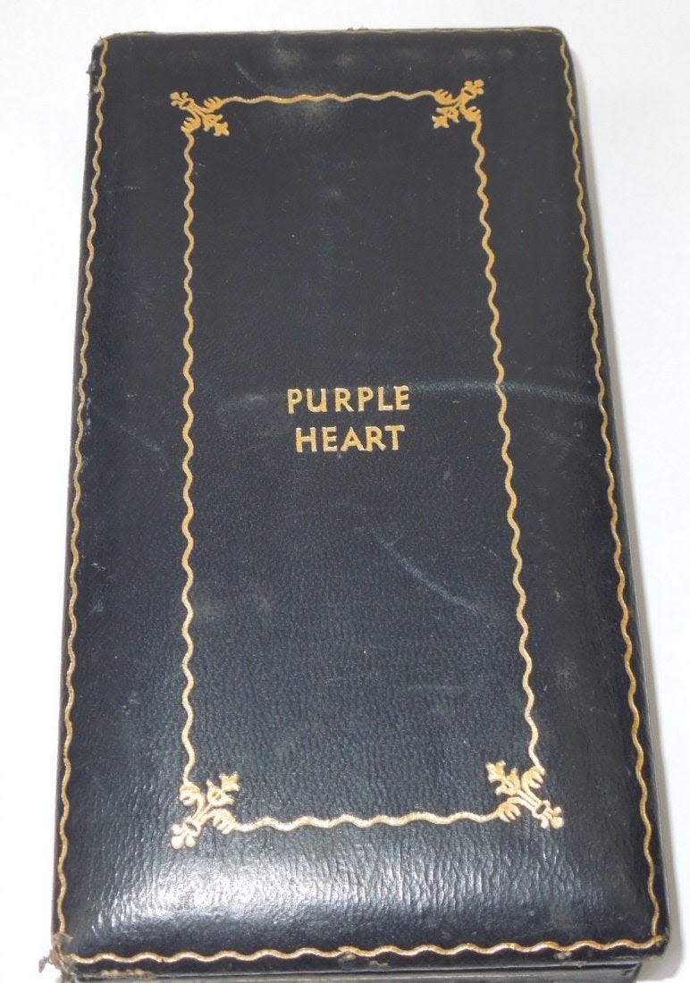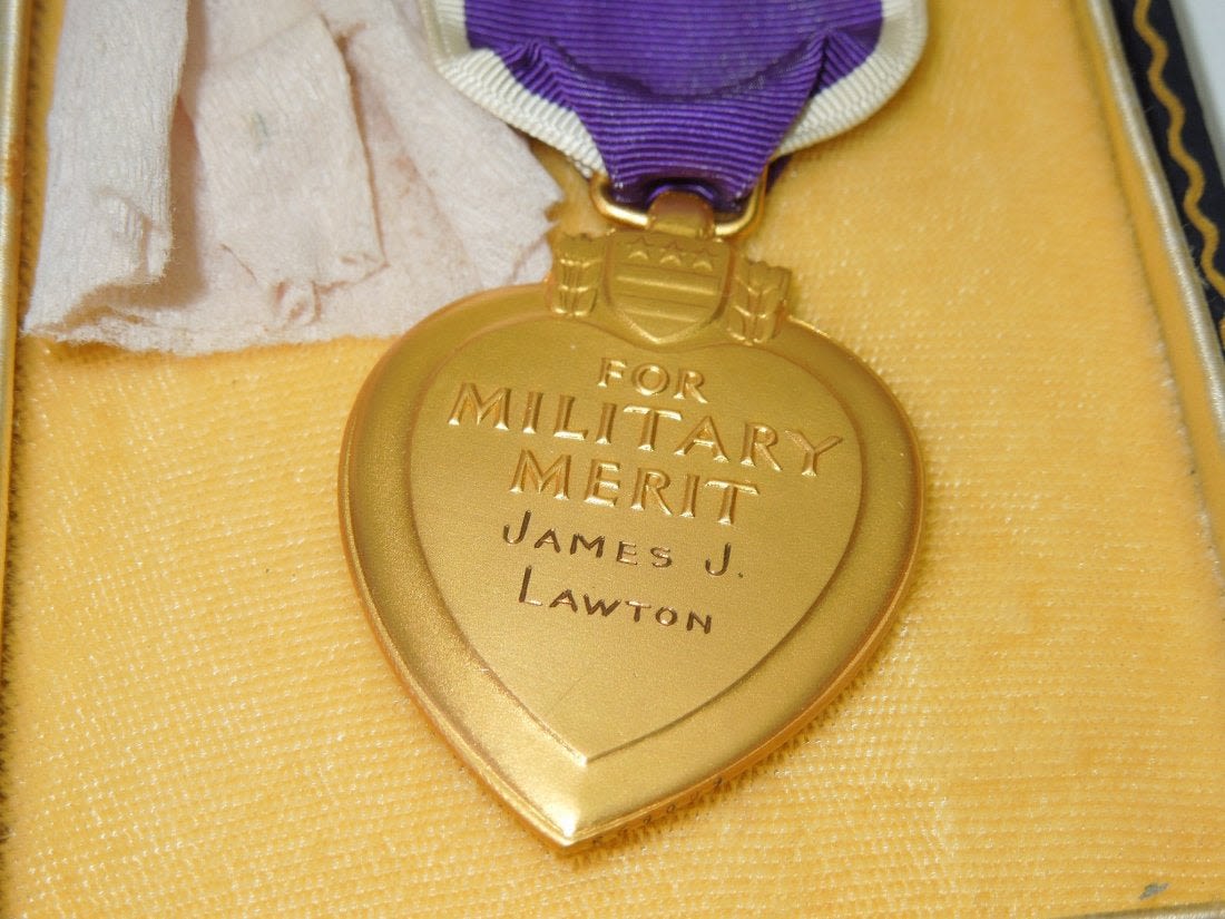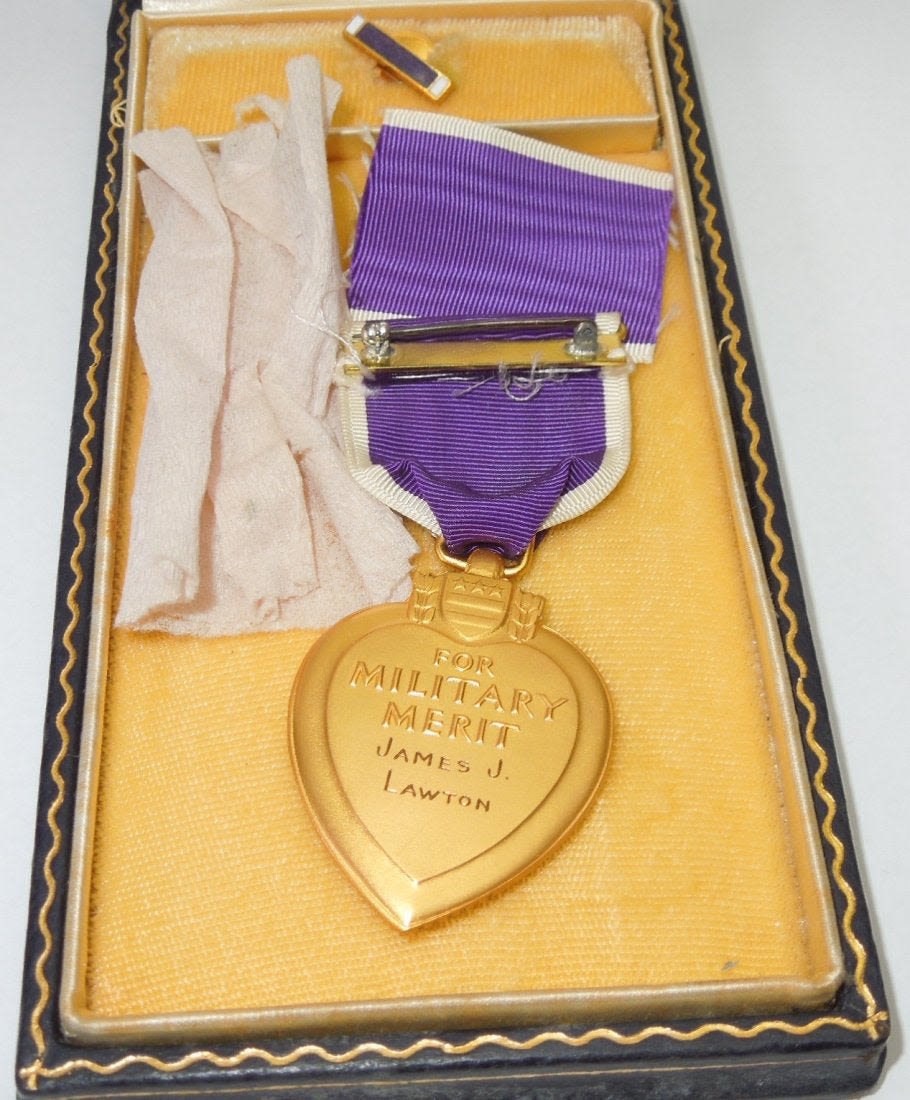 WWII original government issued engraved Purple Heart Medal to Pfc. James J. Lawton of Syracuse, New York. He entered the Army in August 1943, went overseas as an Infantryman with the 339th Infantry Regiment, 85th Infantry Division in March 1944, and was Killed in Action near Firenzuola, Italy on September 17, 1944. He had previously earned a Purple Heart for wounds received in May 1944 was in a hospital for a month before returning to combat duty. Lot comes with some pages of research.