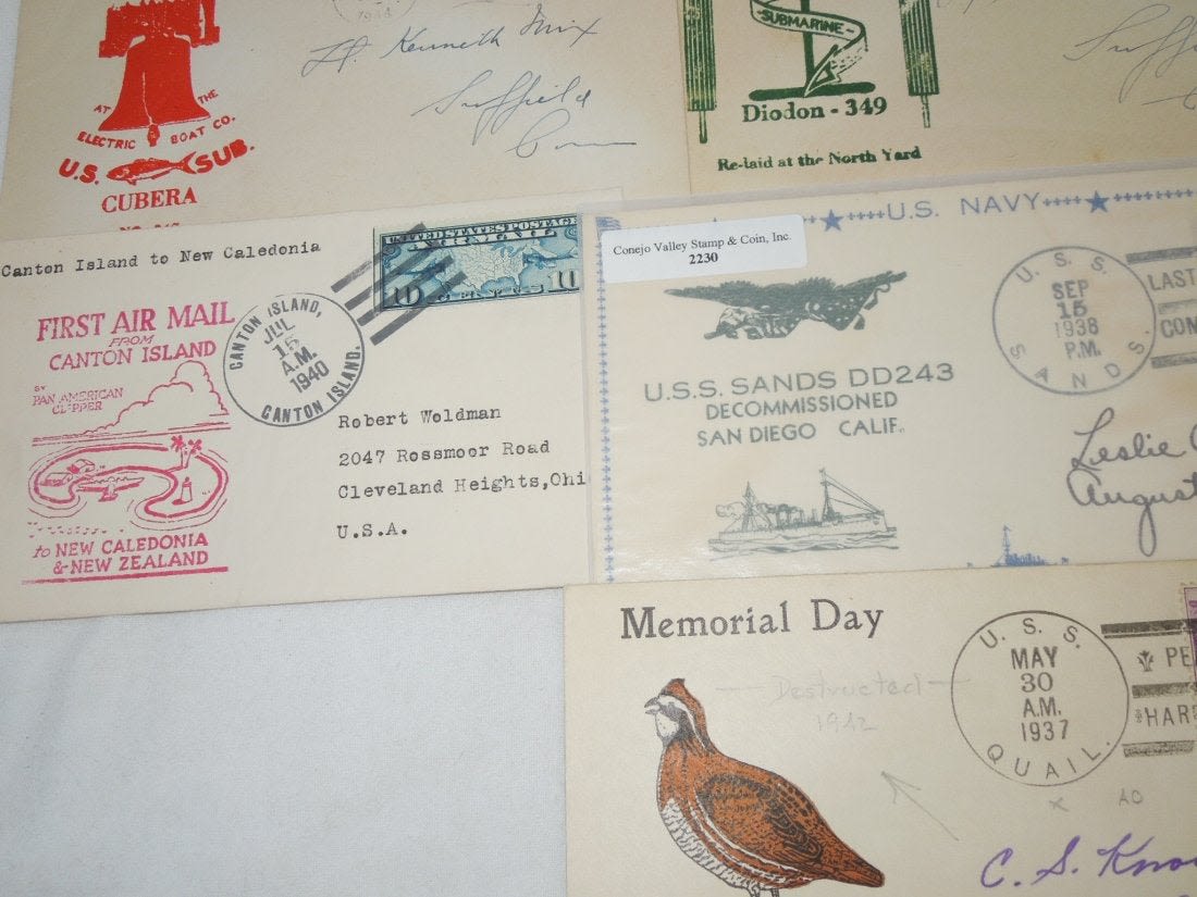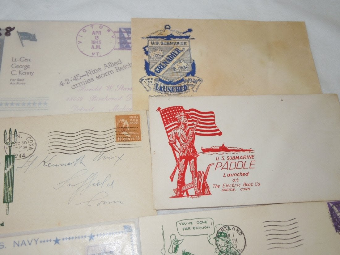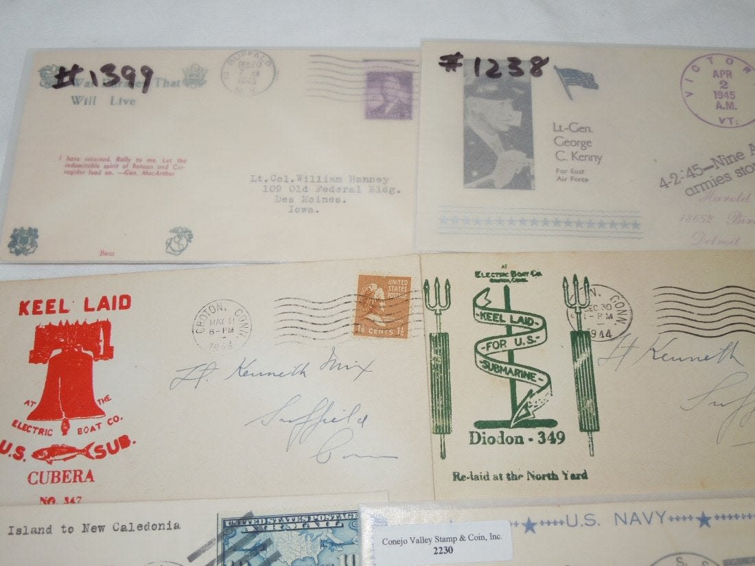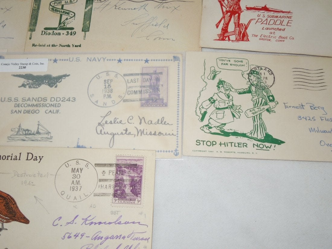 (10) WWII Era First Day & Postal Covers (FDC) Lot Hitler, Submarines, etc. You will receive the following (10) WWII Era First Day & Postal Covers (FDC): 1943 Portland, Oreg "Stop Hitler Now", 1945 Buffalo, NY "War Phrases That Will Live MacArthur" Baur, 1945 Victory, VT "Lt. Gen George C. Kenny" (Cachet No. 876 Covers Issued 50 Cover No. 33), "U.S. Submarine Grenadier", "U.S. Submarine Paddle", 1944 Groton, Conn "Keel Laid For U.S. Submarine Diodon 349", 1944 Groton, Conn "Keel Laid U.S. Sub Cubera NO. 347", 1940 Canton Island, Canton Island, "Canton Island to New Caledonia First Air Mail From Canton Island", "1938 U.S.S. Sands DD243 Decommissioned San Diego, Calif", 1937 U.S.S. Quail "Memorial Day U.S.S. Quail". See pictures for each item condition. Note: The ones with marker numbers or stickers on them are in clear paper protective sleeves which are removable.
