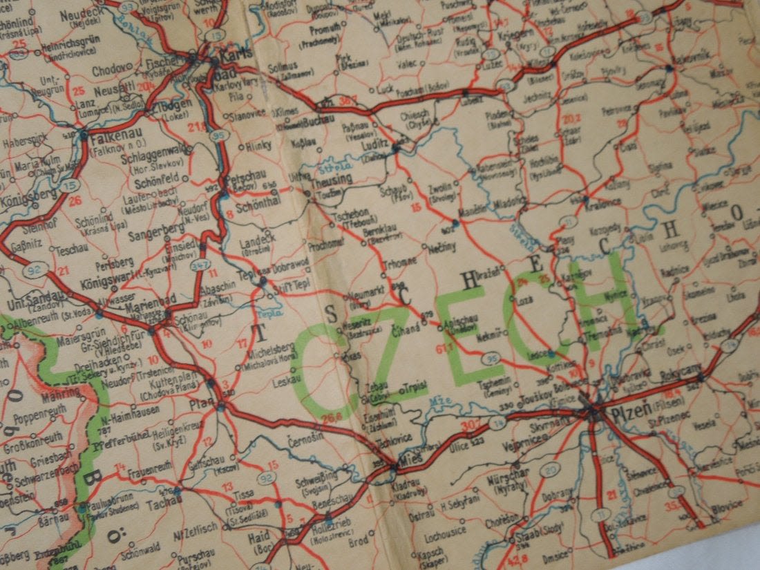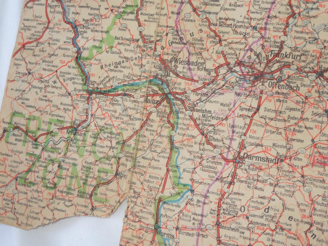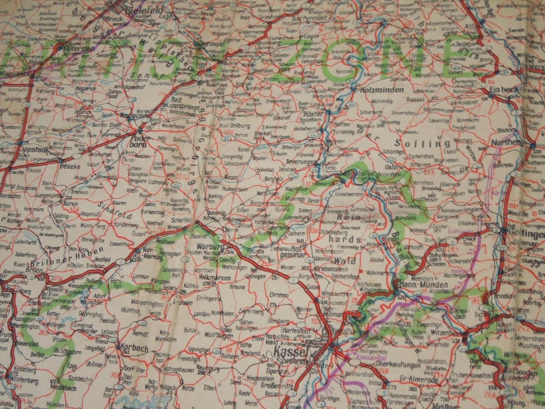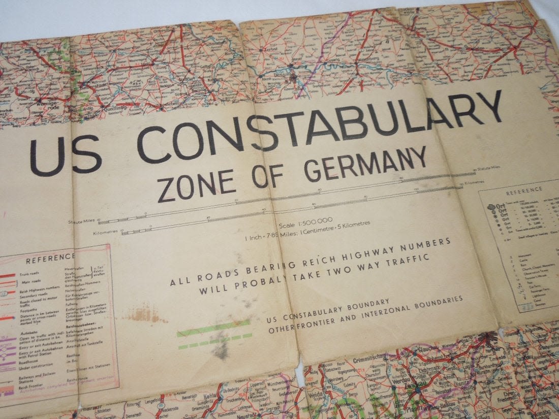 Nice color WWII Occupation era US Constabulary of Germany road / zone map showing different allied control areas. It appears to be cut down and is not dated. Well used piece with folds and some tears as shown.