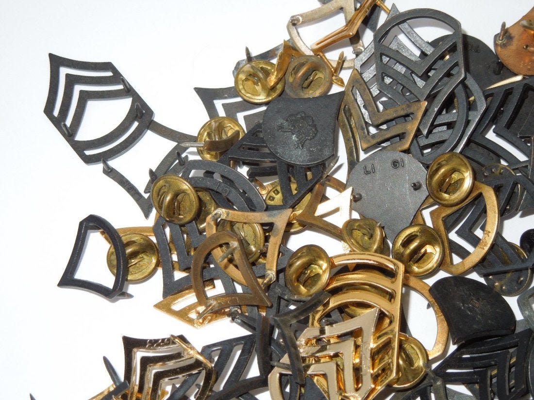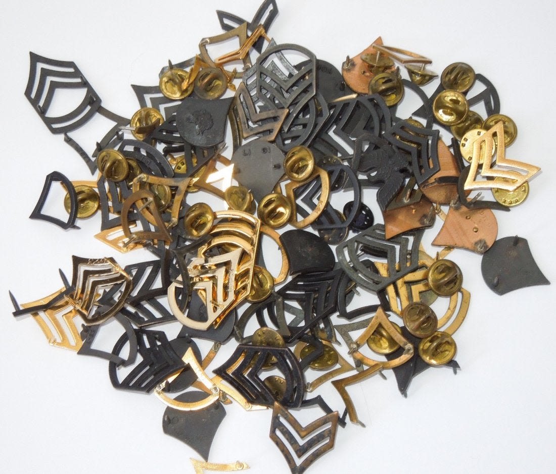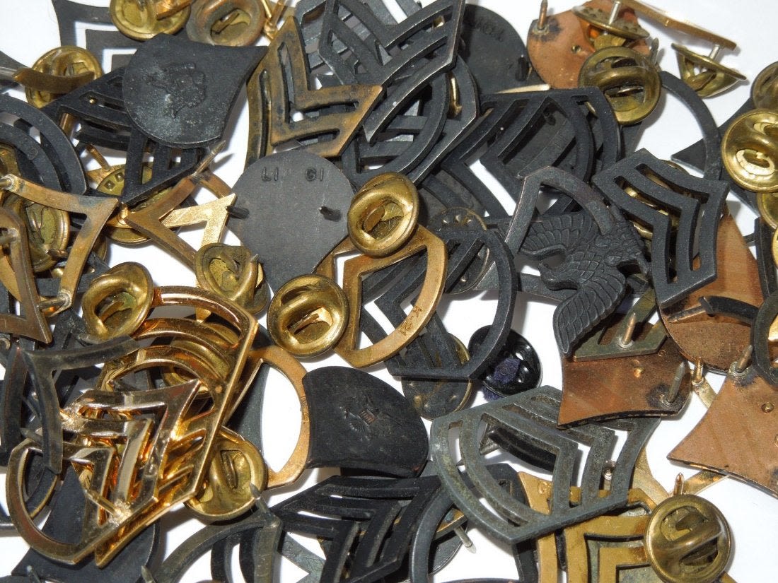 Lot of Vietnam to Modern era US Army enlisted rank insignia from Private all the way to senior Non Commissioned Officer / Sergeant ranks. Many are missing the clutches, but have their pin posts.
