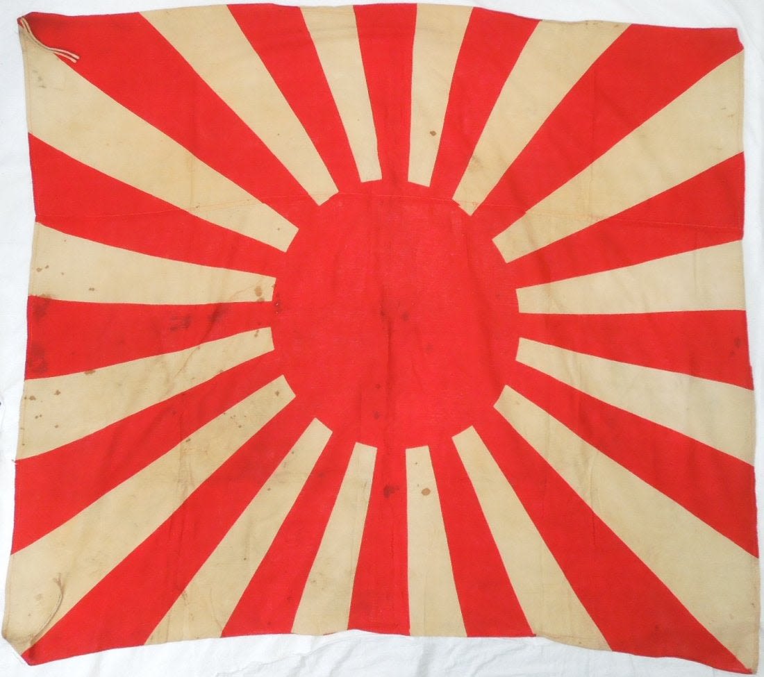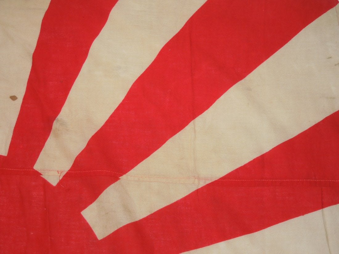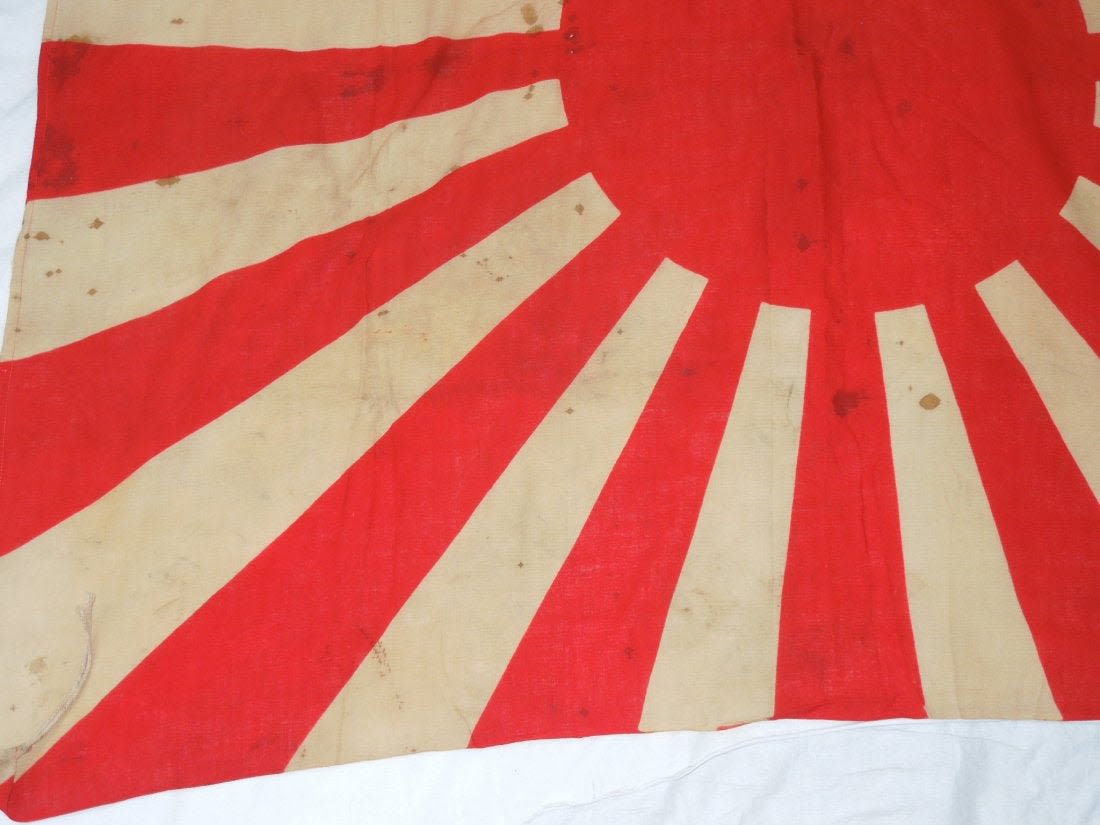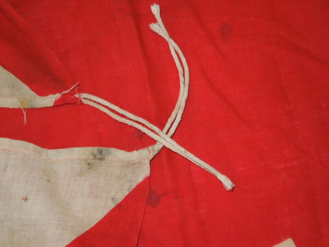 Original WWII cloth double sided Japanese Rising Sun Imperial Army flag measuring approximately 48 inches by 40 inches in size. Consignor noted that he bought it from a USMC veteran who claimed to have brought it back from the Battle of Okinawa, but has since lost the info he wrote down about it many years ago.