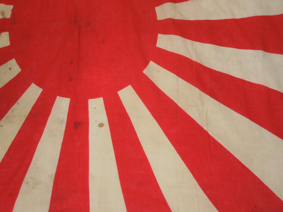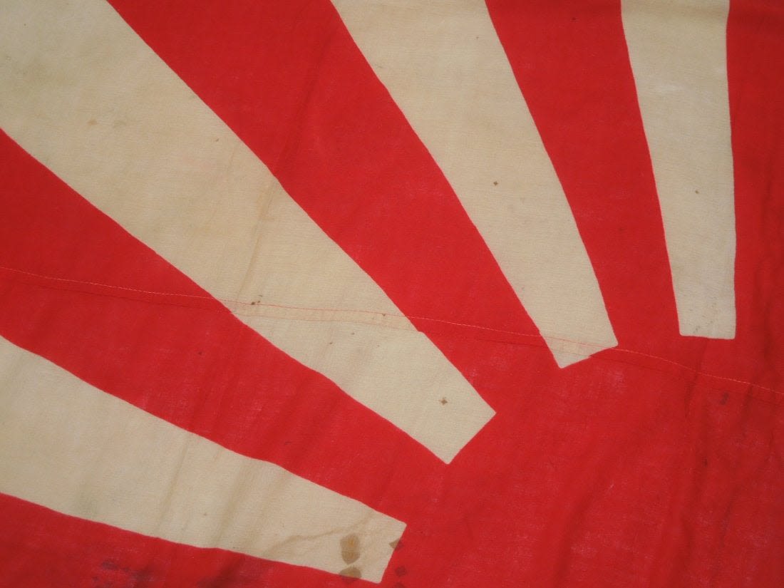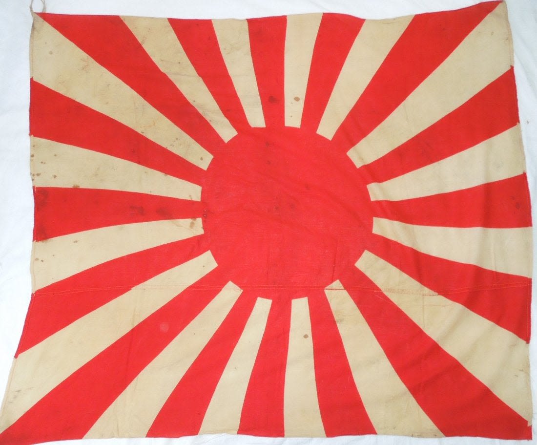 Original WWII cloth double sided Japanese Rising Sun Imperial Army flag measuring approximately 48 inches by 40 inches in size. Consignor noted that he bought it from a USMC veteran who claimed to have brought it back from the Battle of Okinawa, but has since lost the info he wrote down about it many years ago.