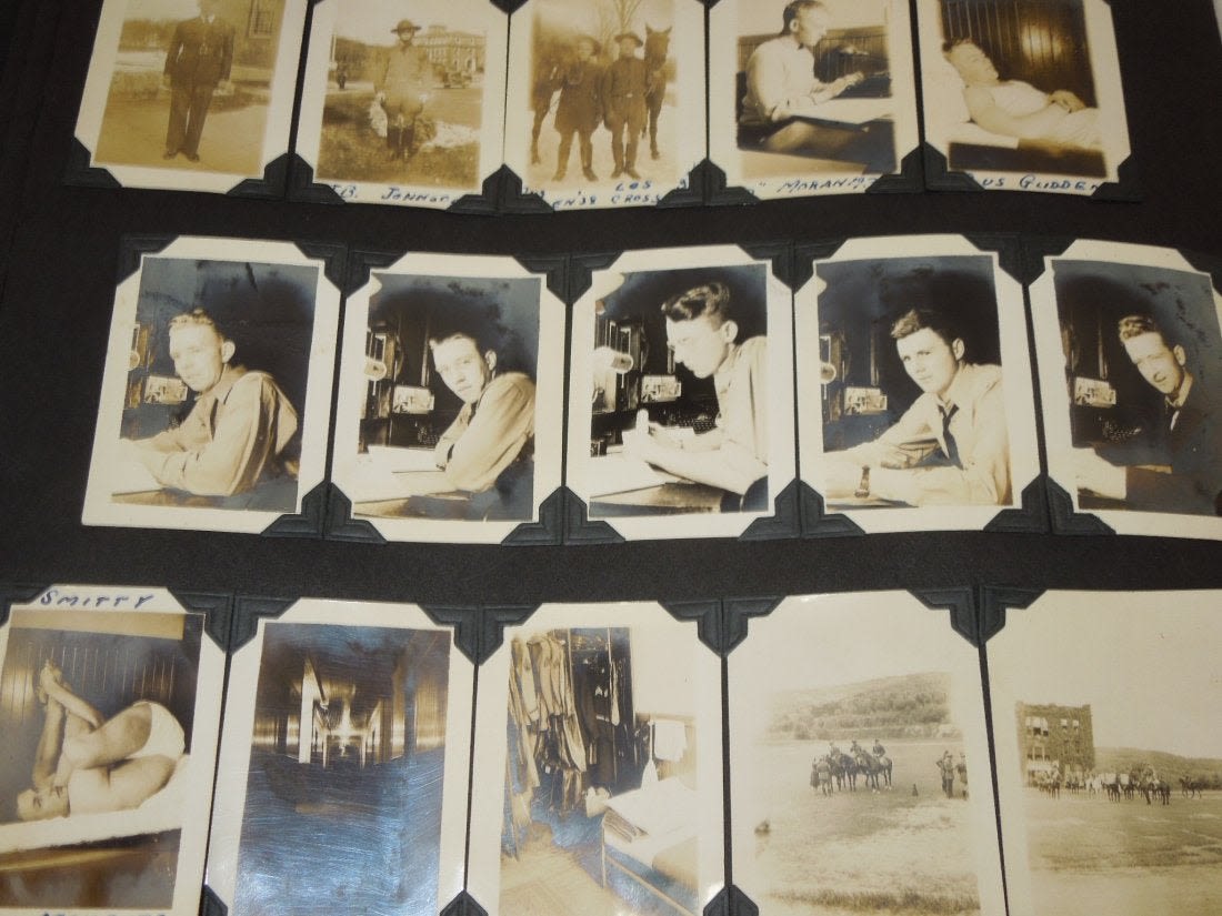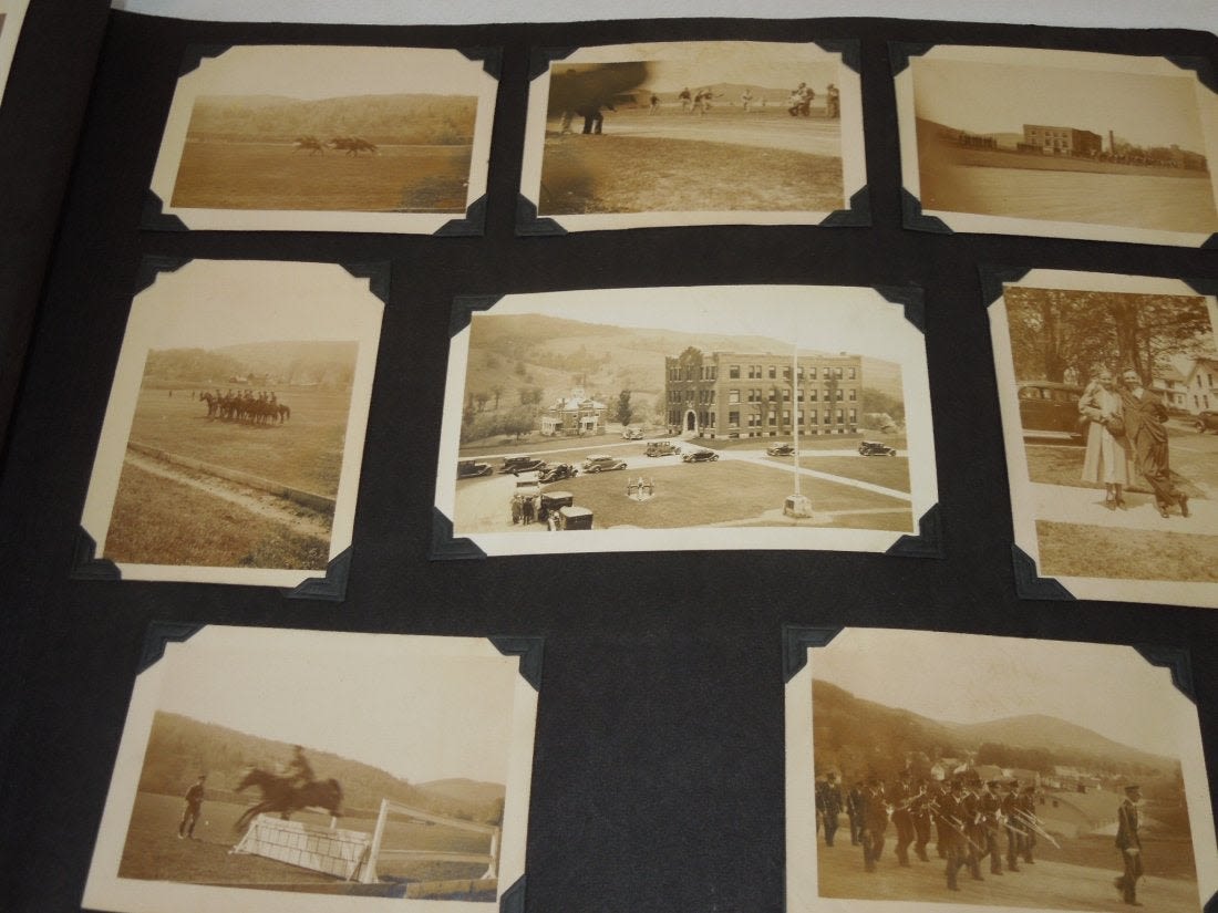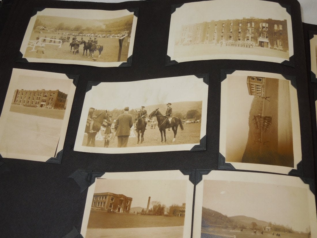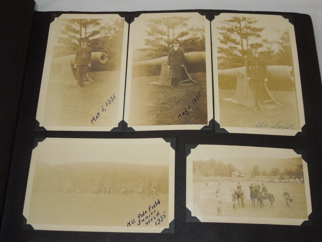 Album containing 73 photos believed to be Norwich University related due to the NU insignia. Photos of uniforms, scenery, horse riding, etc. Fair to good condition.