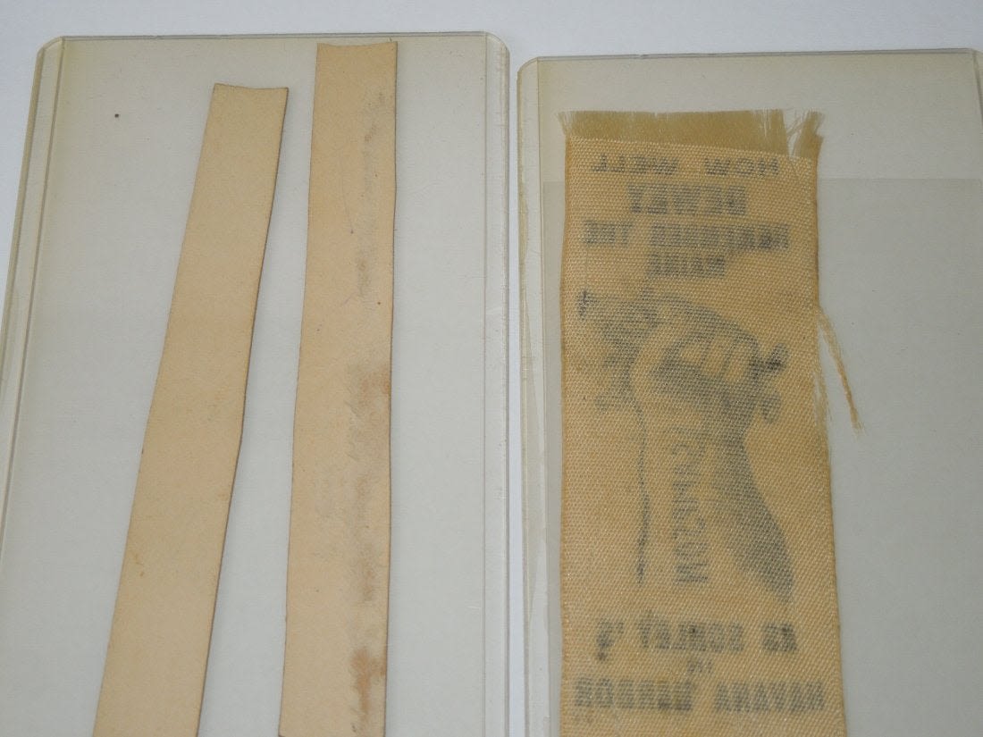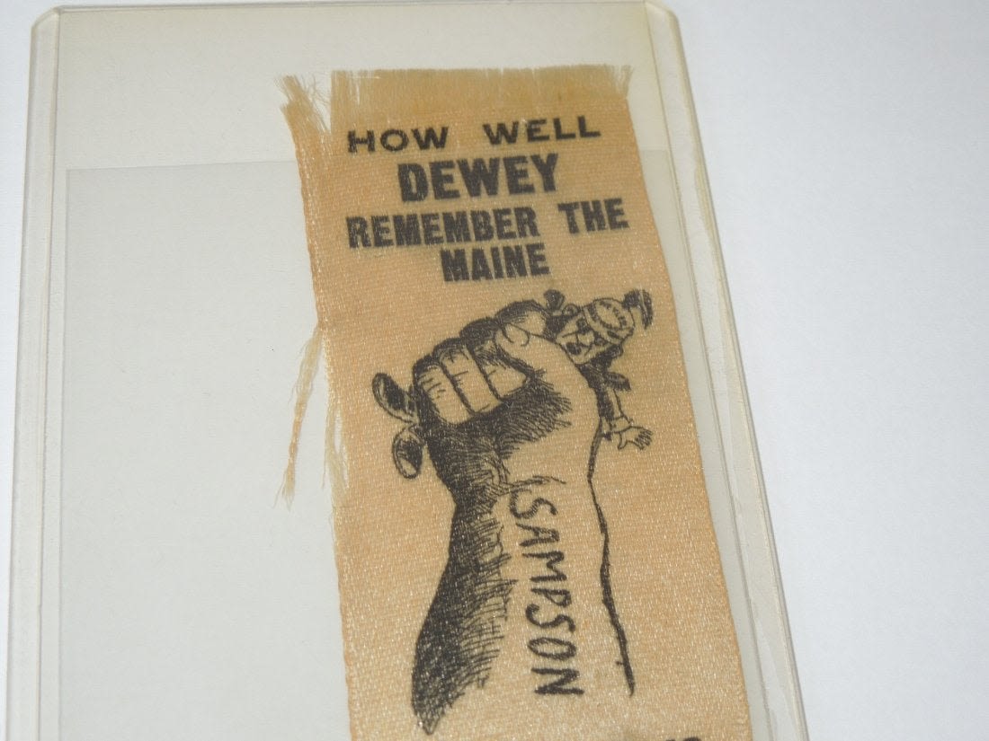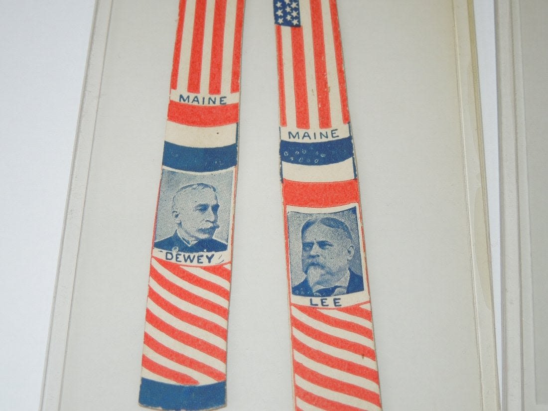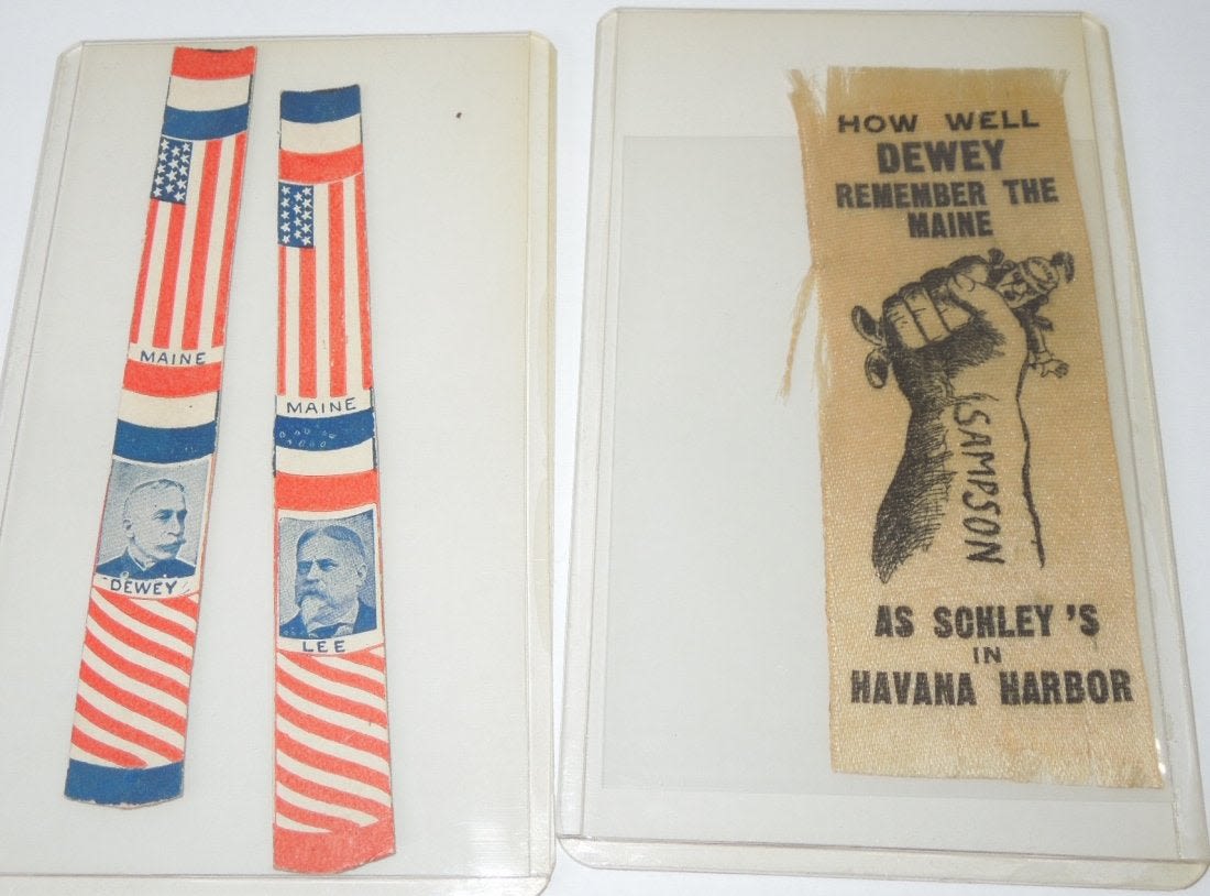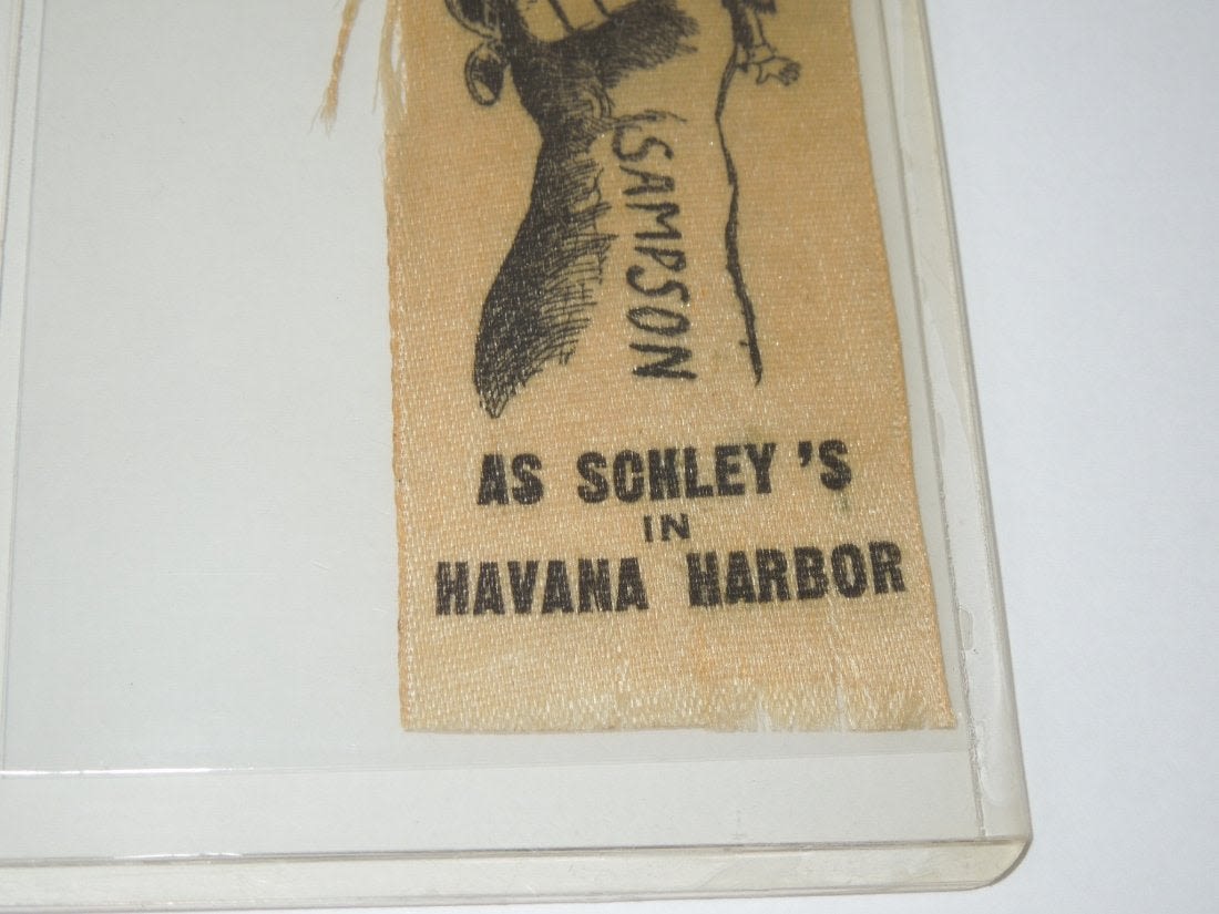 Spanish American War Adm. Dewey Ribbon & Dewey Lee Stick Cards. You will receive 3 items. The ribbon reads, How Well Dewey Remember The Maine As Schleys in Havana Harbor. The arm reads, SAMPSON and the helmet reads, WEYLER. Size is 1.5 x 4.25 inches. Condition is frayed edges, but what one would expect for its age. The other item is 2 cards that depict the photo of Admiral Dewey and General Lee with both having the writing of Maine in the middle. Size is 4.4 inches in length. Condition is good.