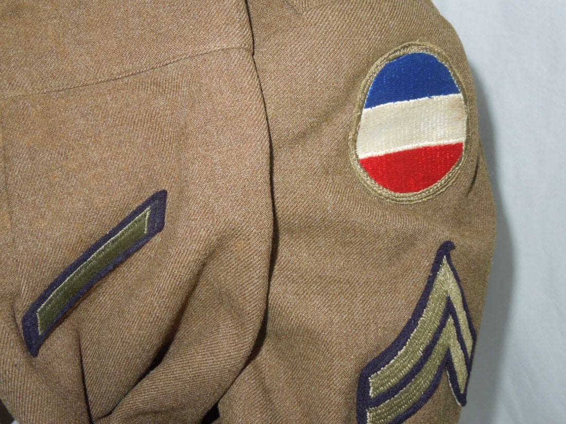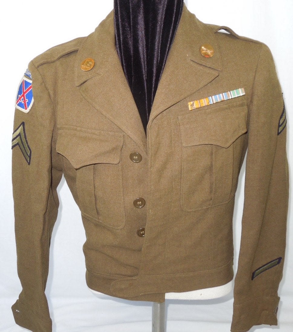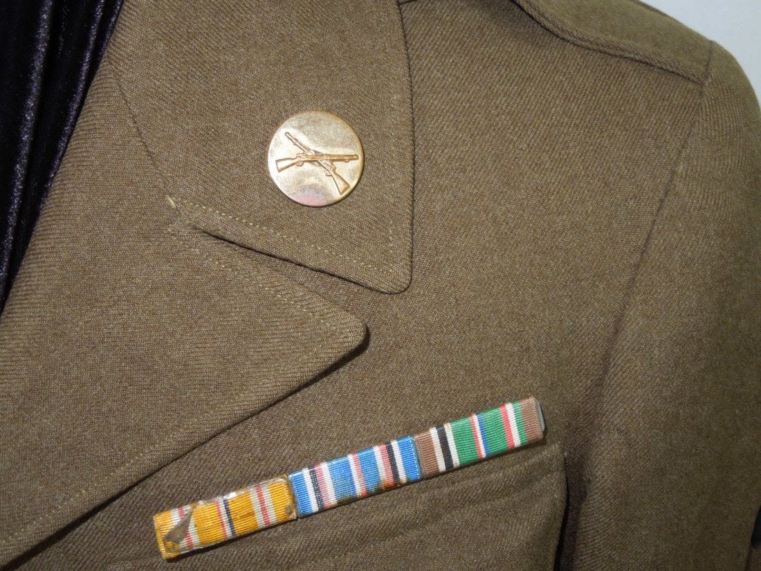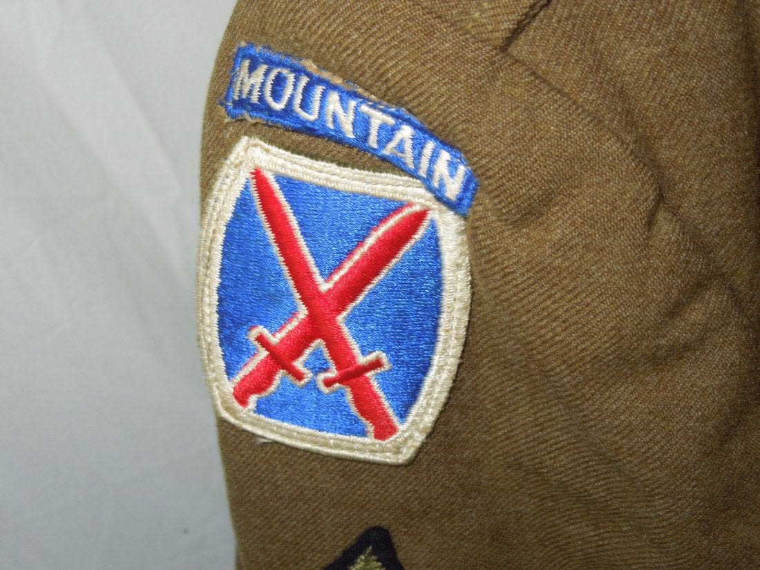 WWII 10th Mountain Division and Army Ground Forces patched Ike jacket with a three place ribbon bar showing European and Pacific service. The consignor noted that he bought it from the niece of the vet years ago, but never got the name. He stated the CIB, Good Conduct, and a Bronze Star ribbon was retained by the family, and not included with the uniform.