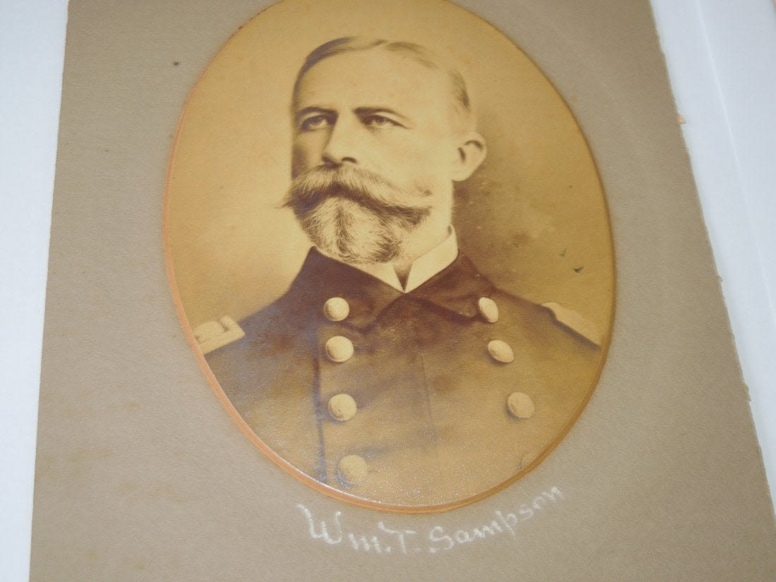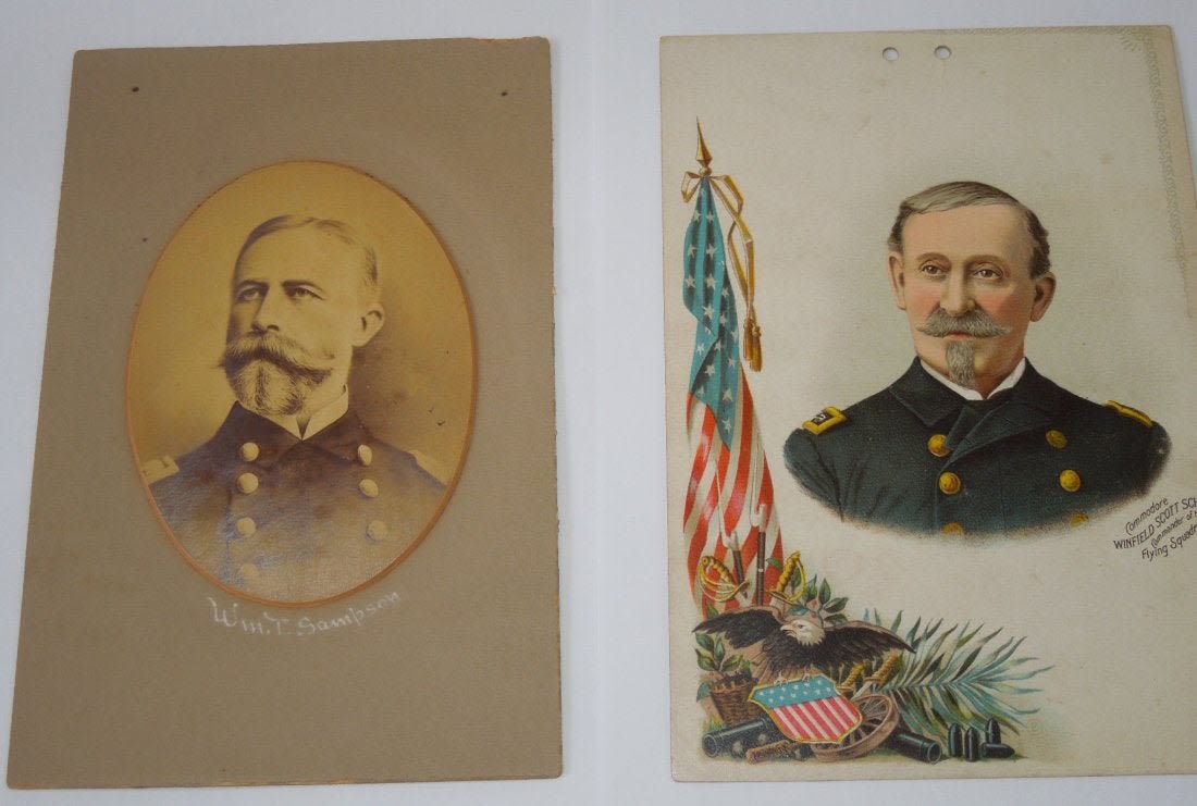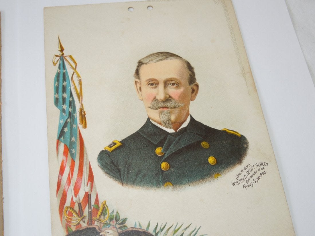 Spanish American War Adm. Sampson & Commodore Schley Photo Cards. You will receive two Spanish American Wars Photo Cards. Navy Admiral William T. Sampson RAISED photo on card. The card measures 5.5 x 8.5 inches. The photo itself is 3.75 x 5 inches. The other card depicts Commodore (later Admiral) Winfield Scott Schley Commander of the Flying Squadron. Size is 6 x 8.5 inches. Condition has holes on the top middle and small creases. Still a very nice photo of Schley.