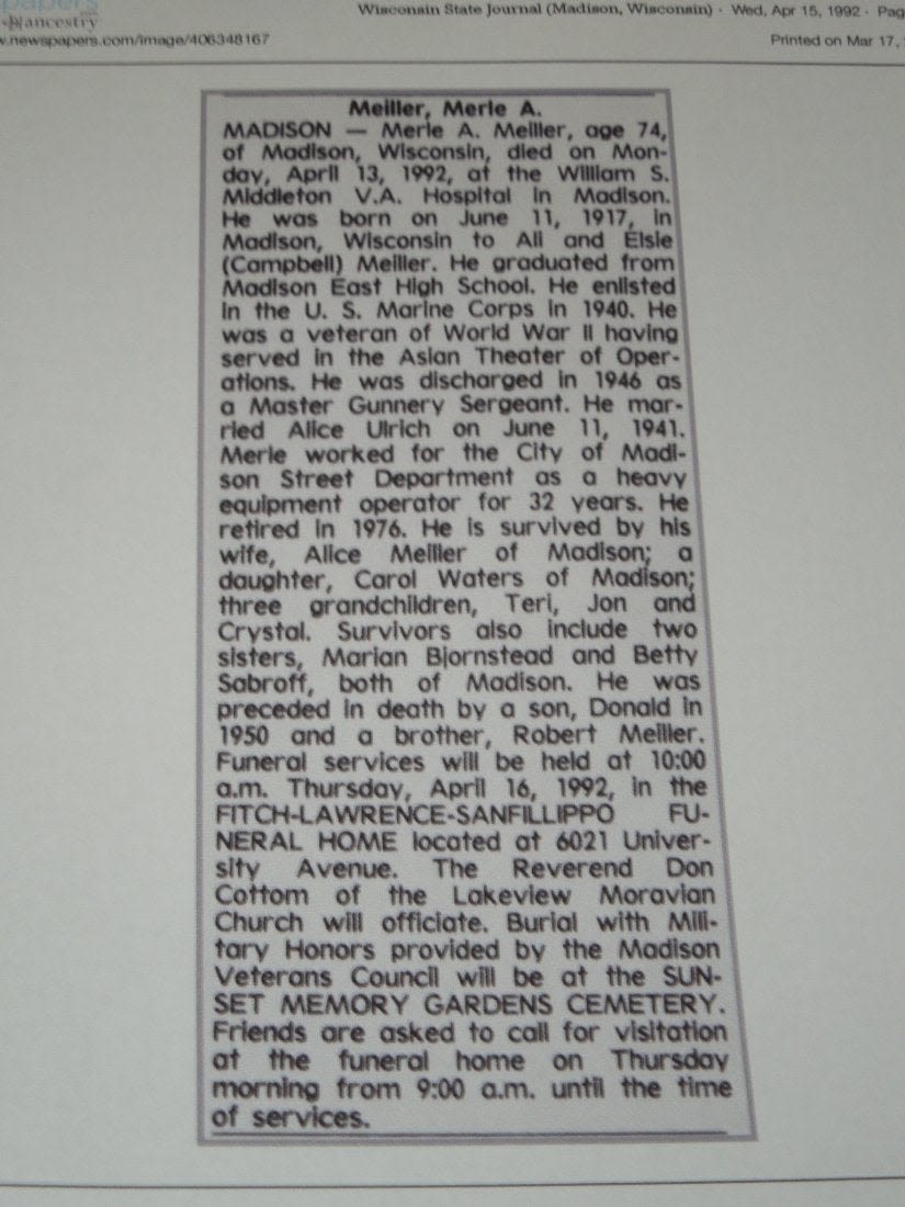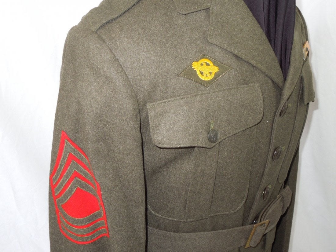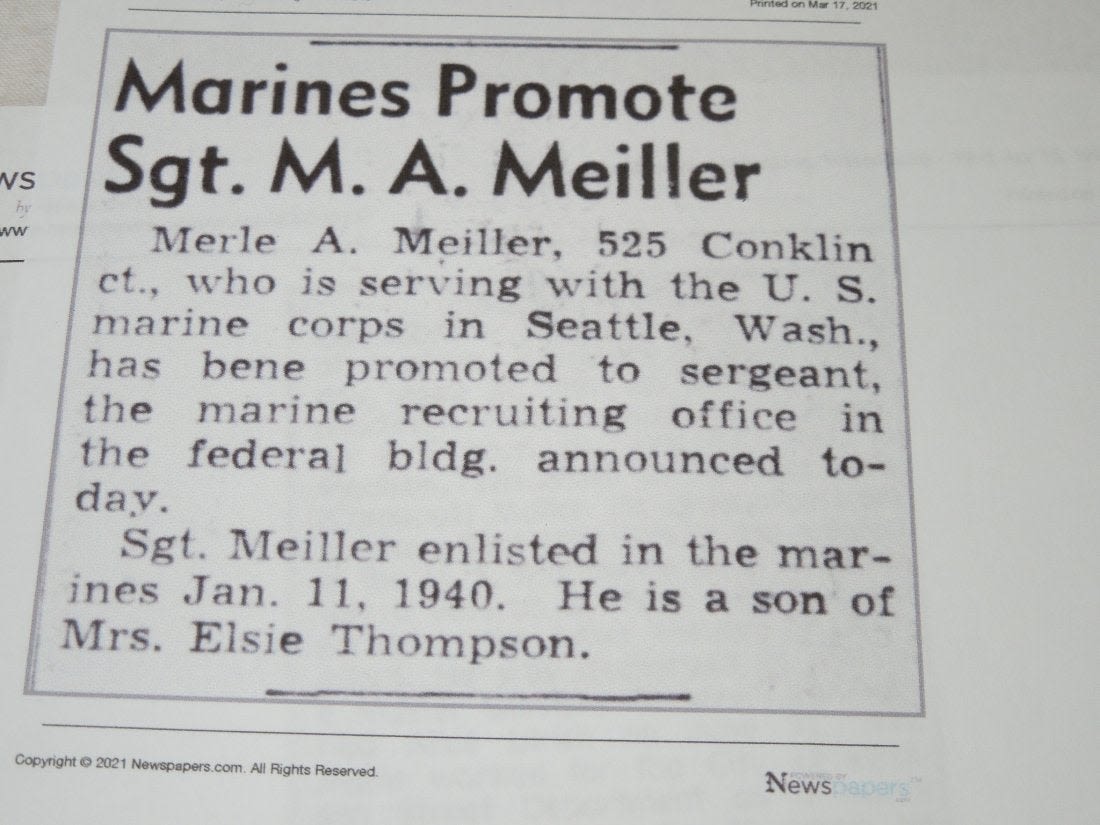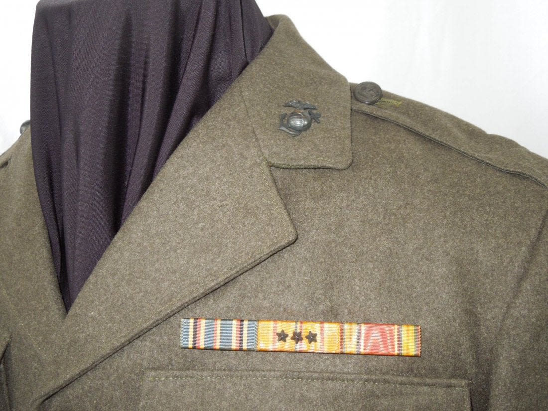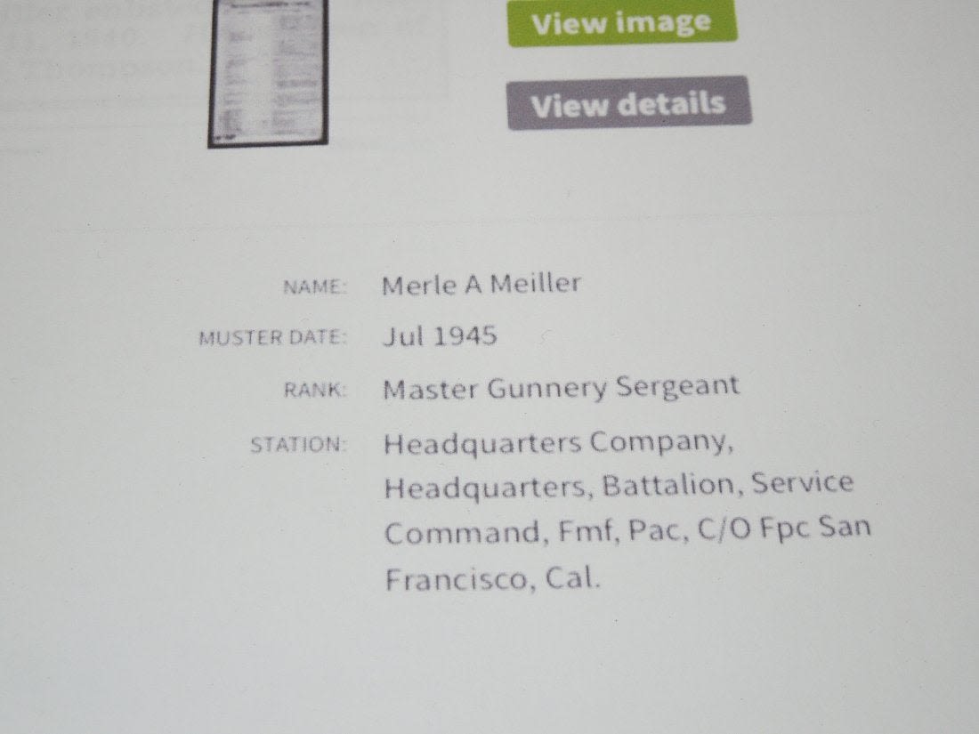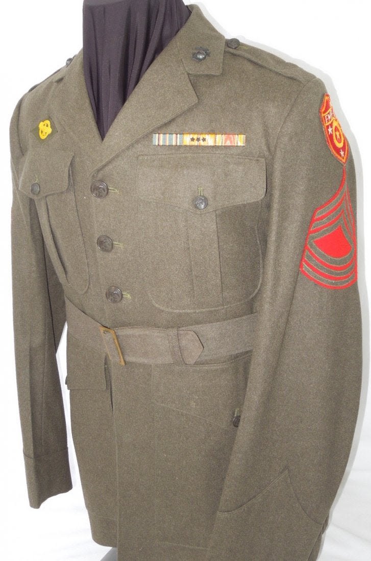 WWII named USMC uniform to Master Gunnery Sergeant Merle A. Meiller of Madison, Wisconsin. He served as a recruiter in WWII, also spending time in the Pacific Theater of Operations late in the War. Comes with the original patches and wide ribbon bar as shown. Also has several pages of copied research on him.