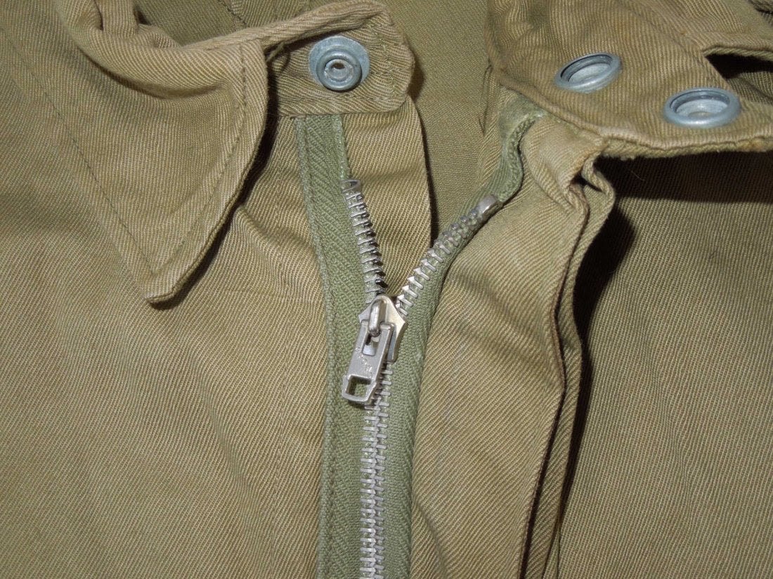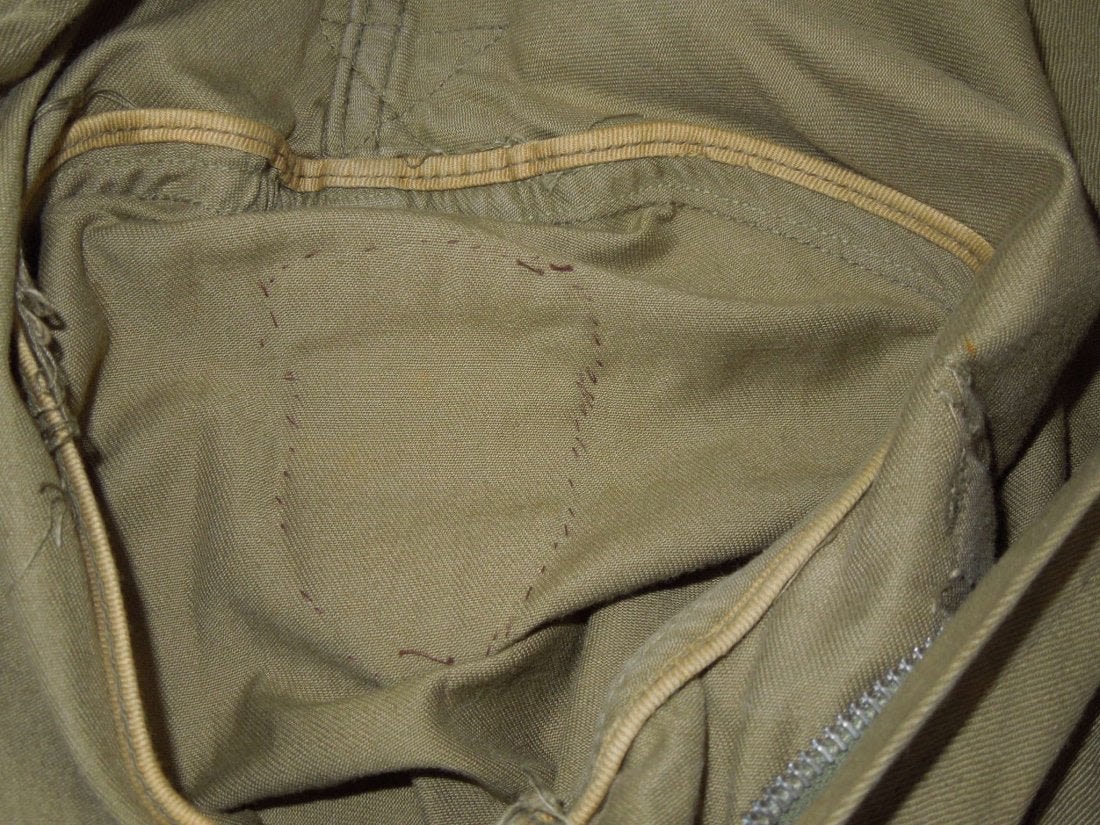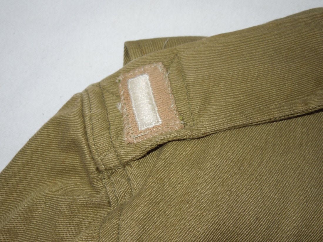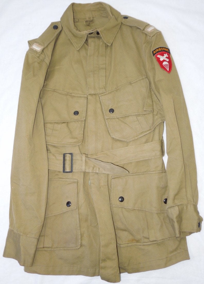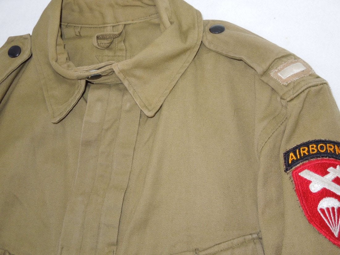 WWII Original M42 jump jacket with sewn on Lieutenant rank and Airborne Command patch. Not named or numbered inside, and the tag is washed out.