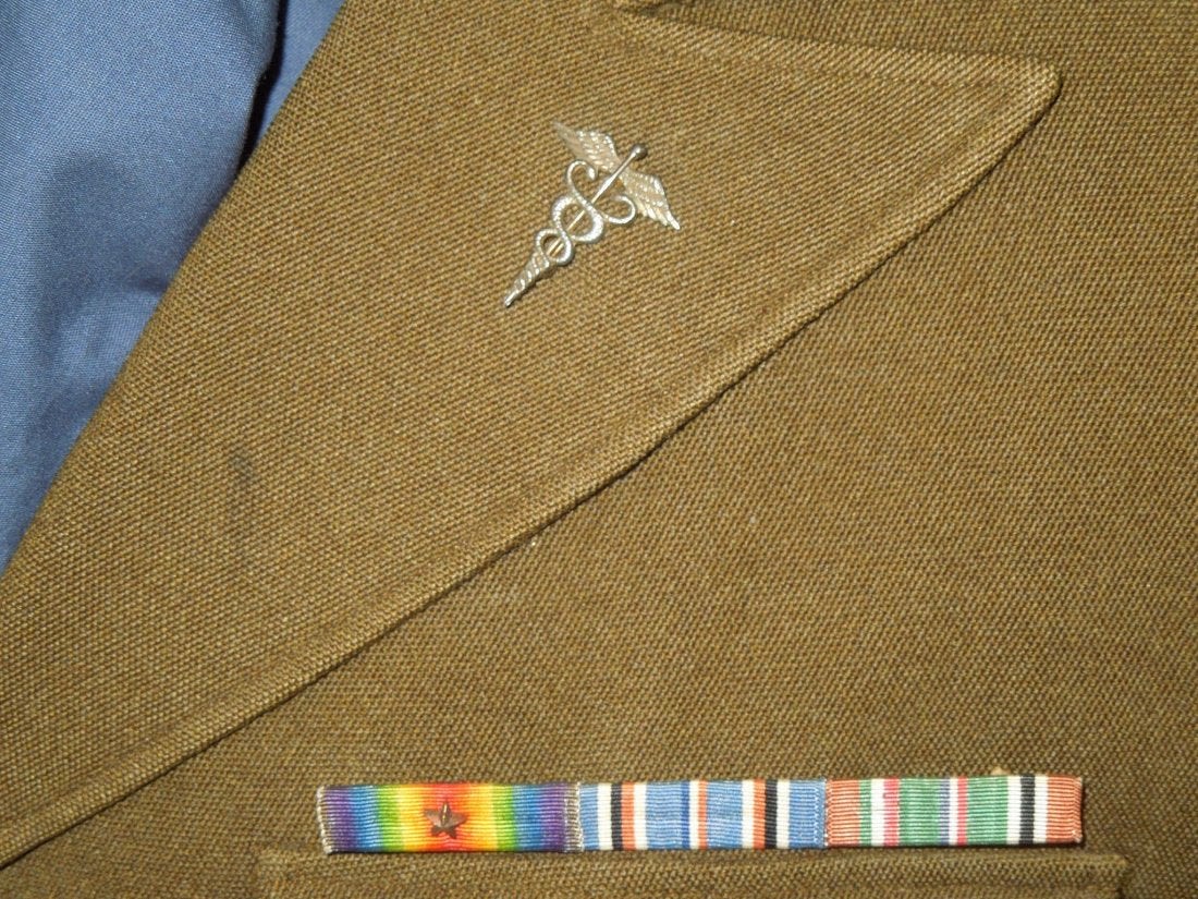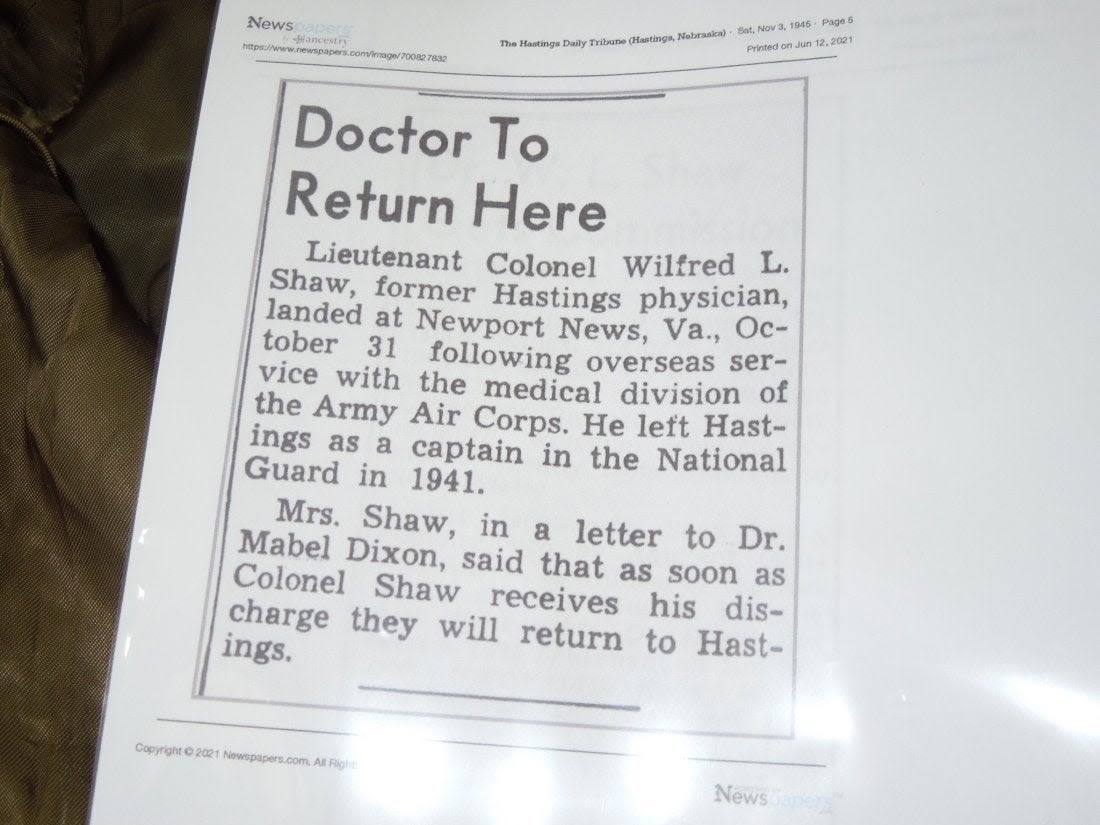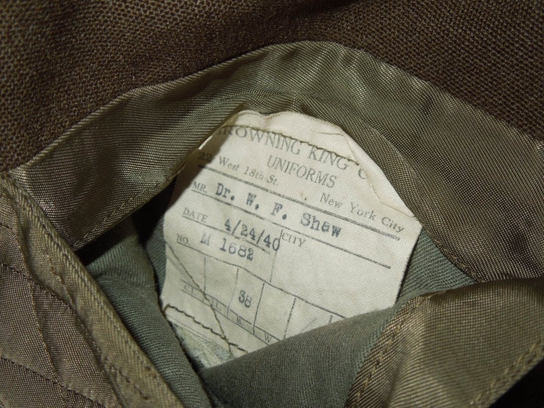 WWI – WWII US Army Lt. Colonel Dr. Wilfred L. Shaw uniform jacket. He was with Naval Aviation overseas in WWI and then in WWII as a medical doctor became an Army Officer stationed with the 12th AAF and Mediterranean Army Air Forces. Jacket features a custom made pin on ribbon bar, bullion rank insignia, WWI and WWII overseas chevrons. One pinback medical device is missing, and there is an outline of a 12th Air Force patch missing on the right shoulder. Comes with some copied articles about his service.