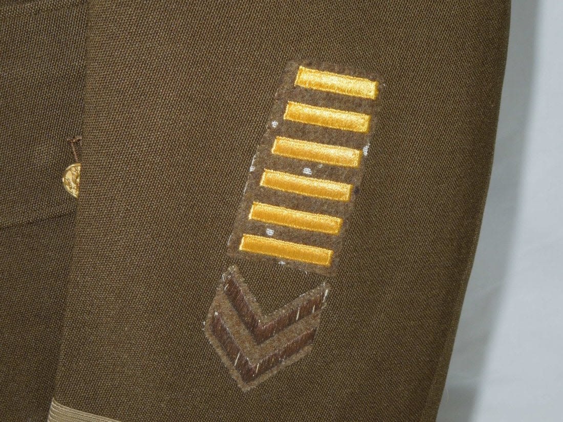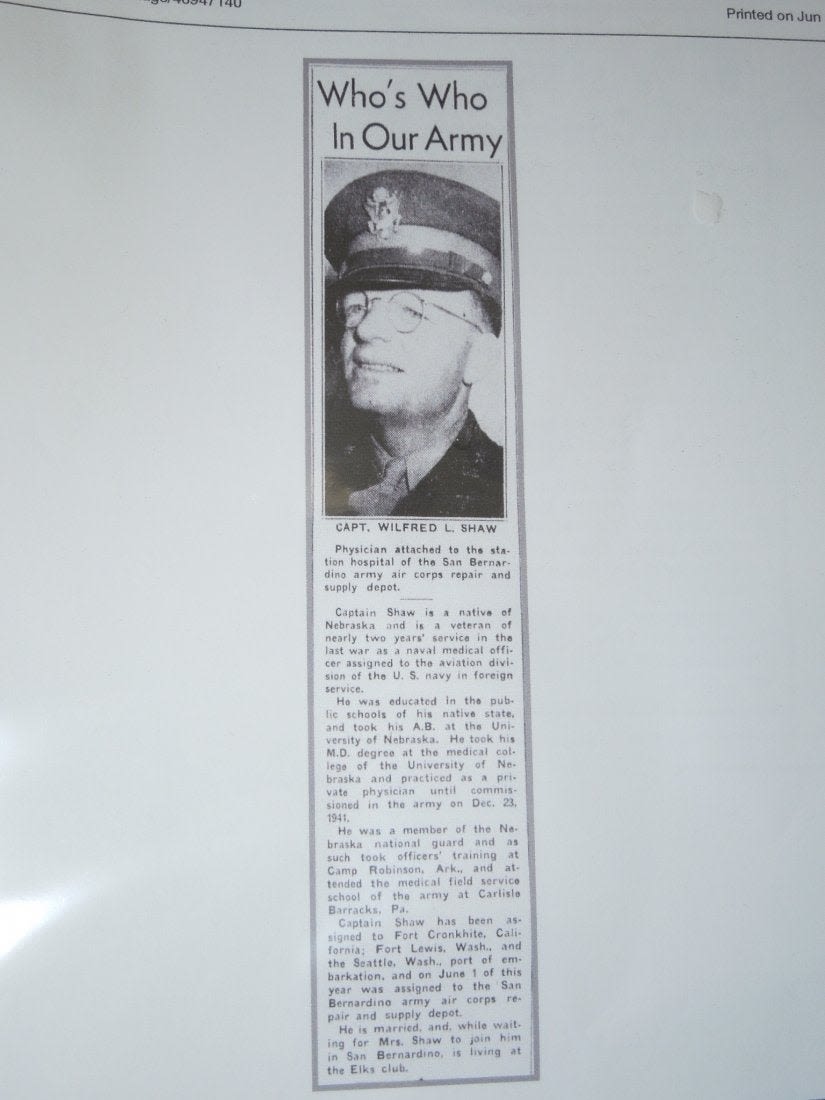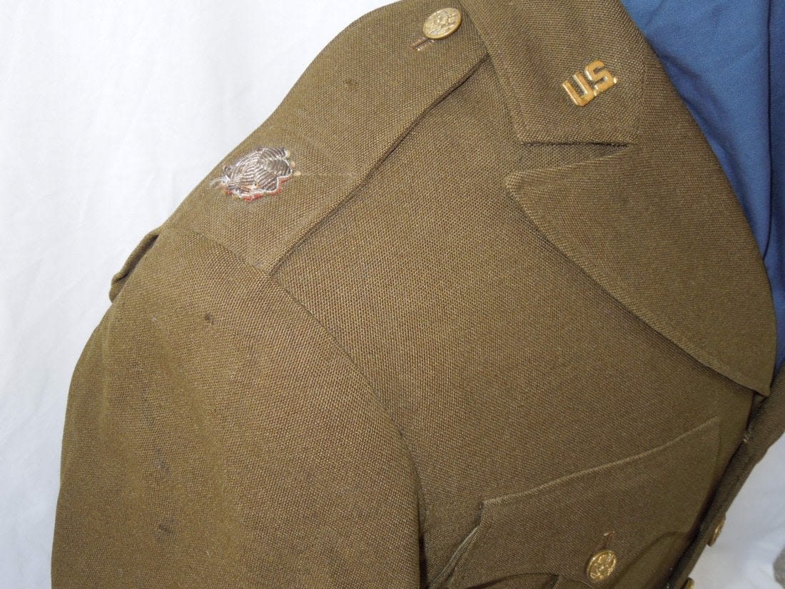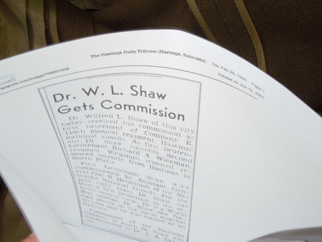 WWI – WWII US Army Lt. Colonel Dr. Wilfred L. Shaw uniform jacket. He was with Naval Aviation overseas in WWI and then in WWII as a medical doctor became an Army Officer stationed with the 12th AAF and Mediterranean Army Air Forces. Jacket features a custom made pin on ribbon bar, bullion rank insignia, WWI and WWII overseas chevrons. One pinback medical device is missing, and there is an outline of a 12th Air Force patch missing on the right shoulder. Comes with some copied articles about his service.