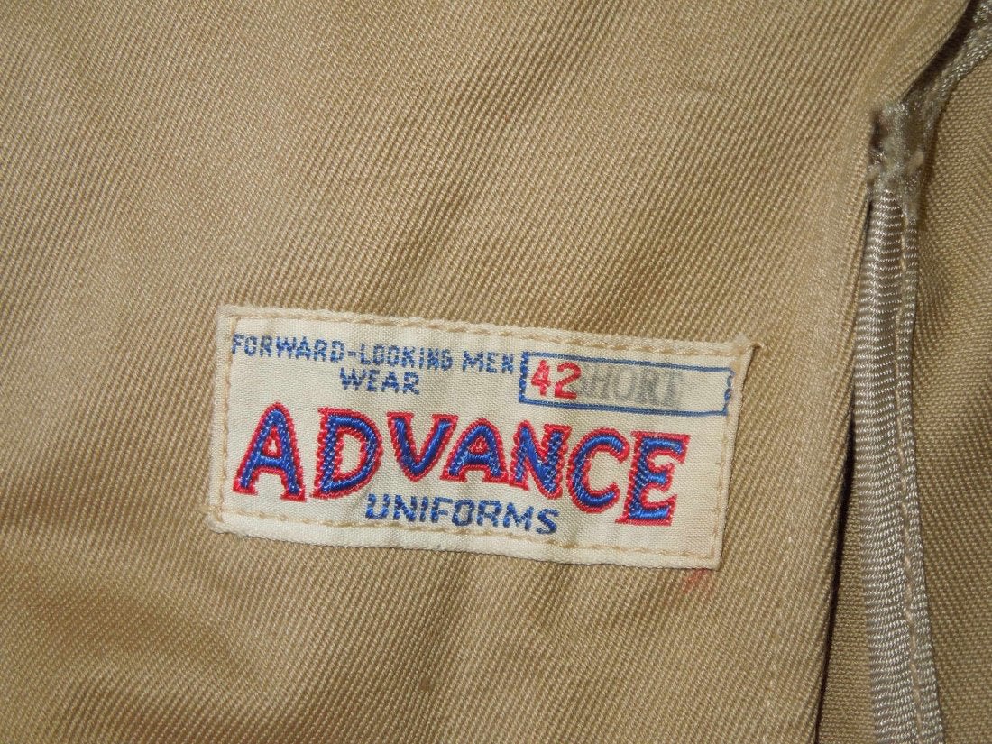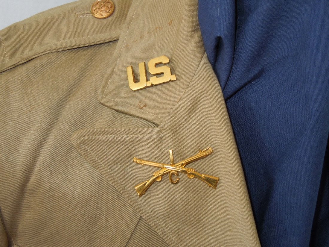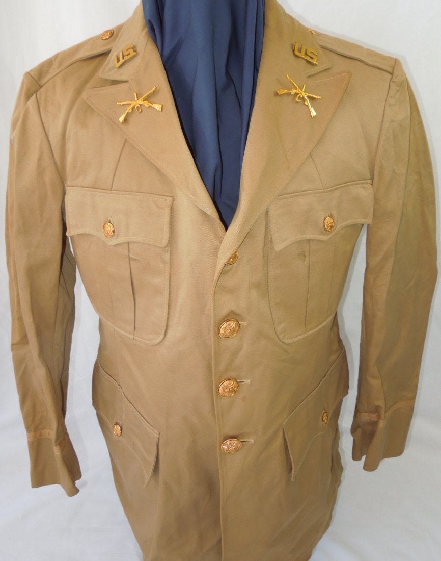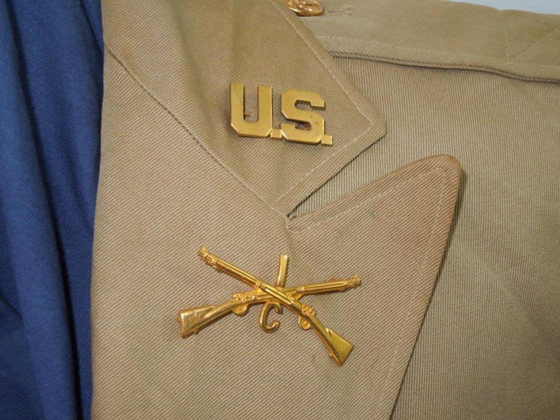1930’s era summer khaki Officer uniform jacket, Size 42S, for C. Co., 1st Infantry Regiment. All pin on insignia is pin back.