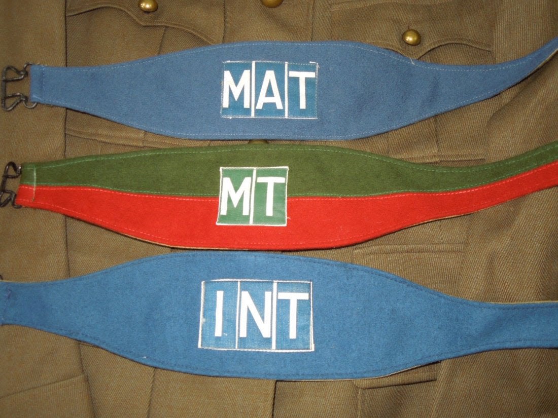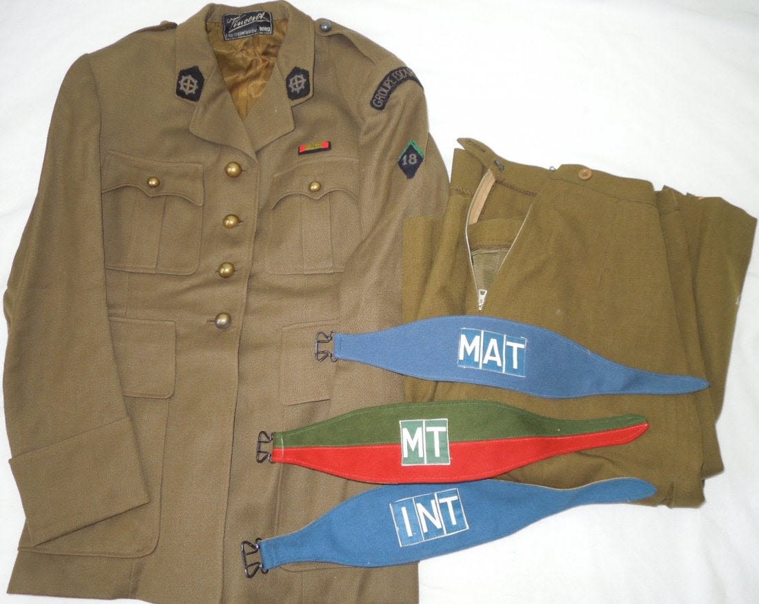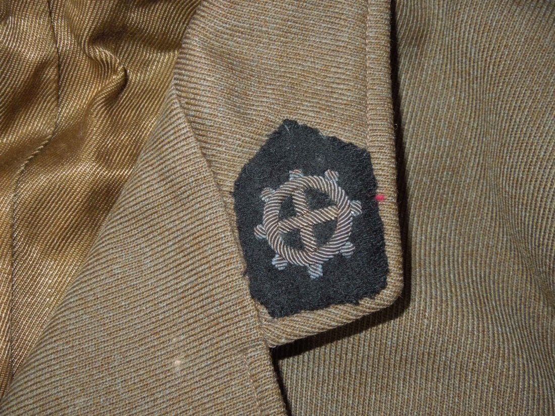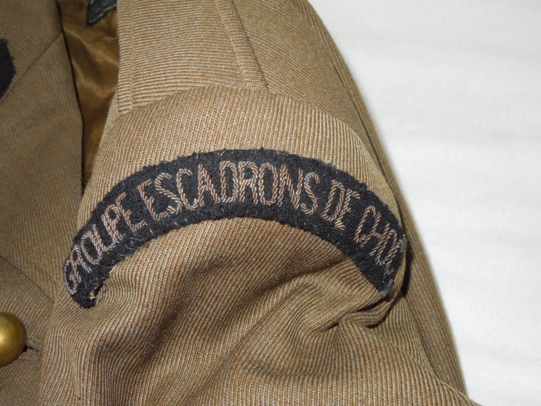WWII or 1950’s era French Women’s uniform group consisting of a jacket, skirt, and three armbands. The Paris tailor made jacket has bullion insignia consisting of an 18 patch, scroll with Groupe Escadrons De Choc, bullion collar tabs, and a Croix de Guerre ribbon bar. Also three armbands- MAT, INT, and MT.