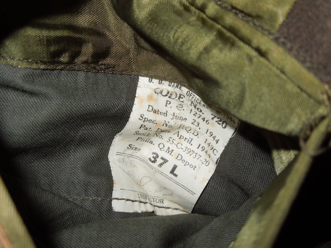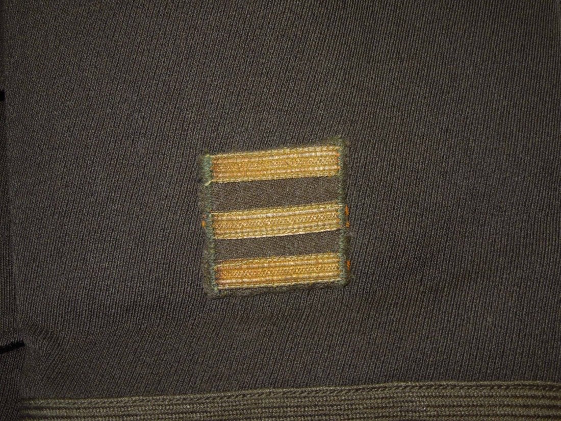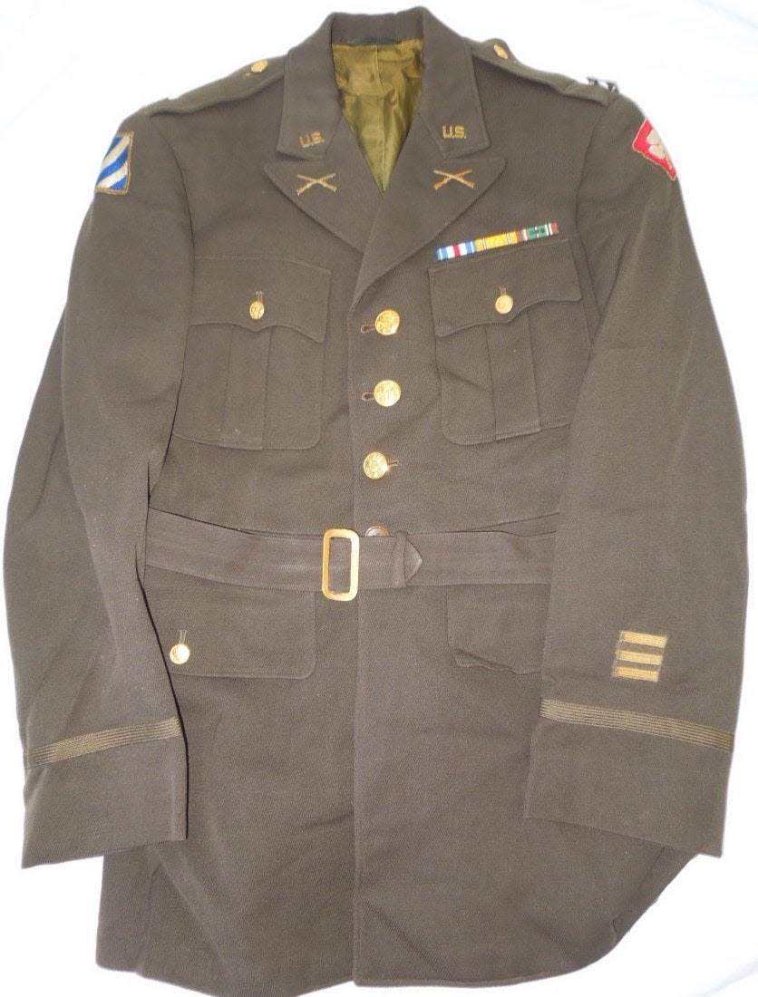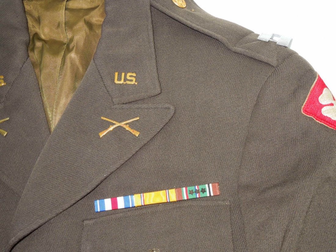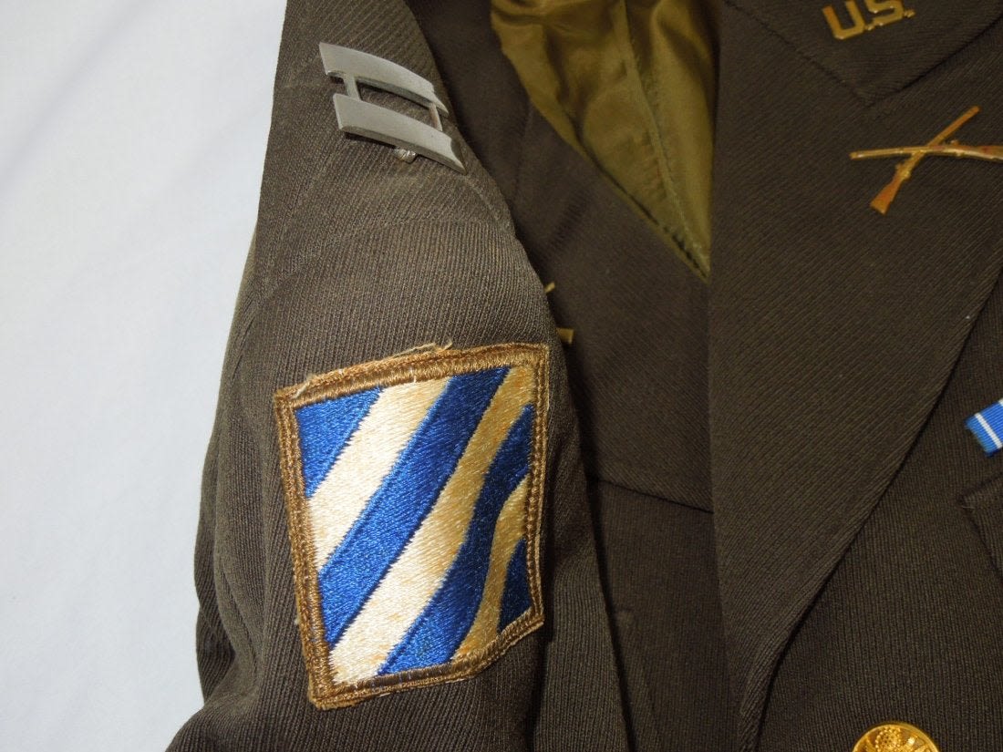 WWII Infantry Captain 1944 dated uniform jacket with Fourth Army patch on the left sleeve and a 3rd Infantry Division on the right. Sterling pin back captain bars, and a clutch back ribbon bar (post war manufacture) with a Silver Star. Three British made bullion overseas stripes. Good condition. (I B 5)