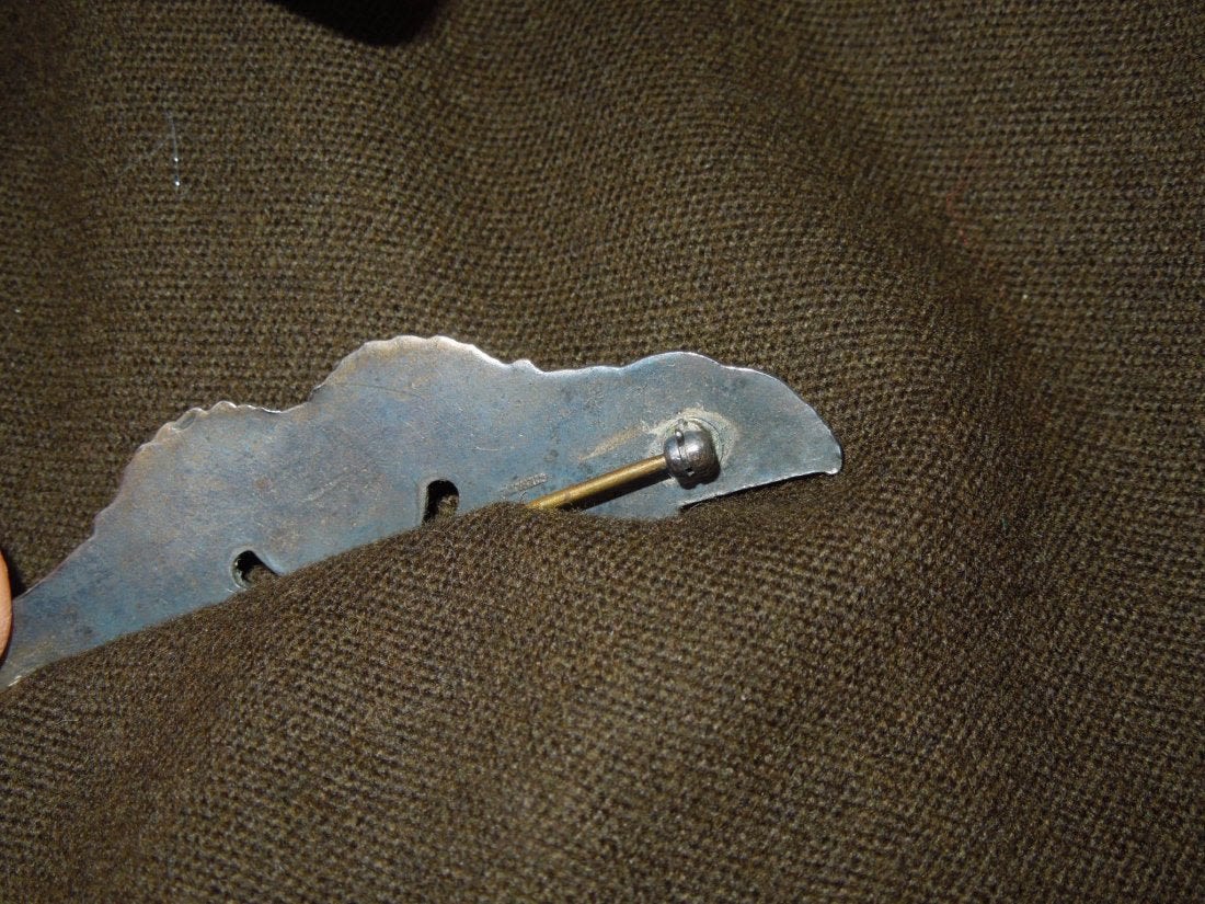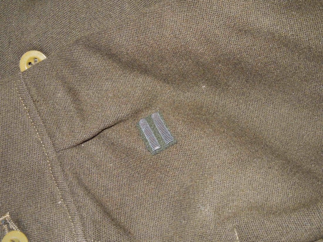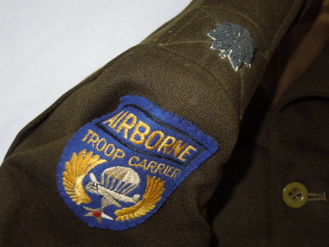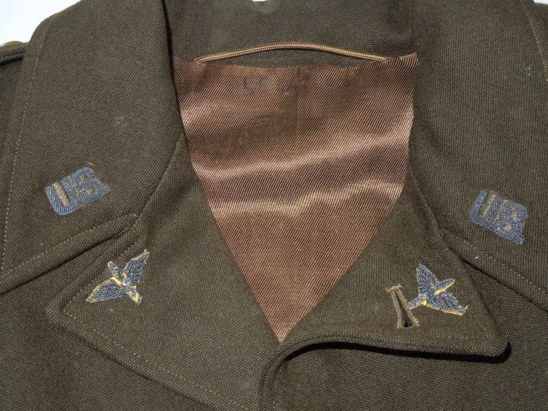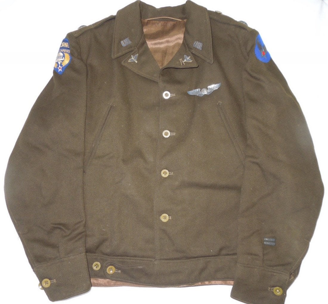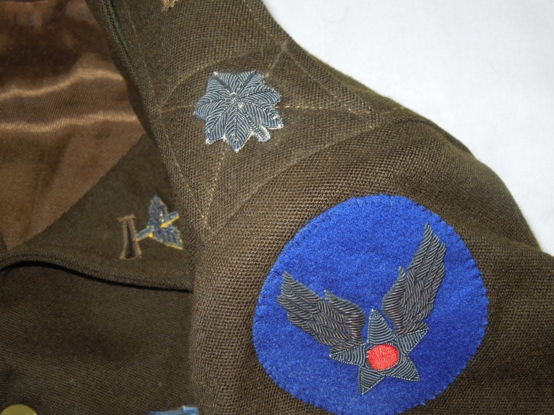 High quality ETO WWII Officer’s jacket with a British made Troop Carrier Command patch and English bullion Army Air Forces patch. British made Lieutenant Colonel rank and bullion US and AAF insignia, a sterling pin back 3 inch observer wing. Named to LT Barrow or Bardow at the top neck area. Possibly Col. Leonard J. Barrow who commanded various Troop Carrier Commands in Europe during WWII. Good condition. (I C 8)