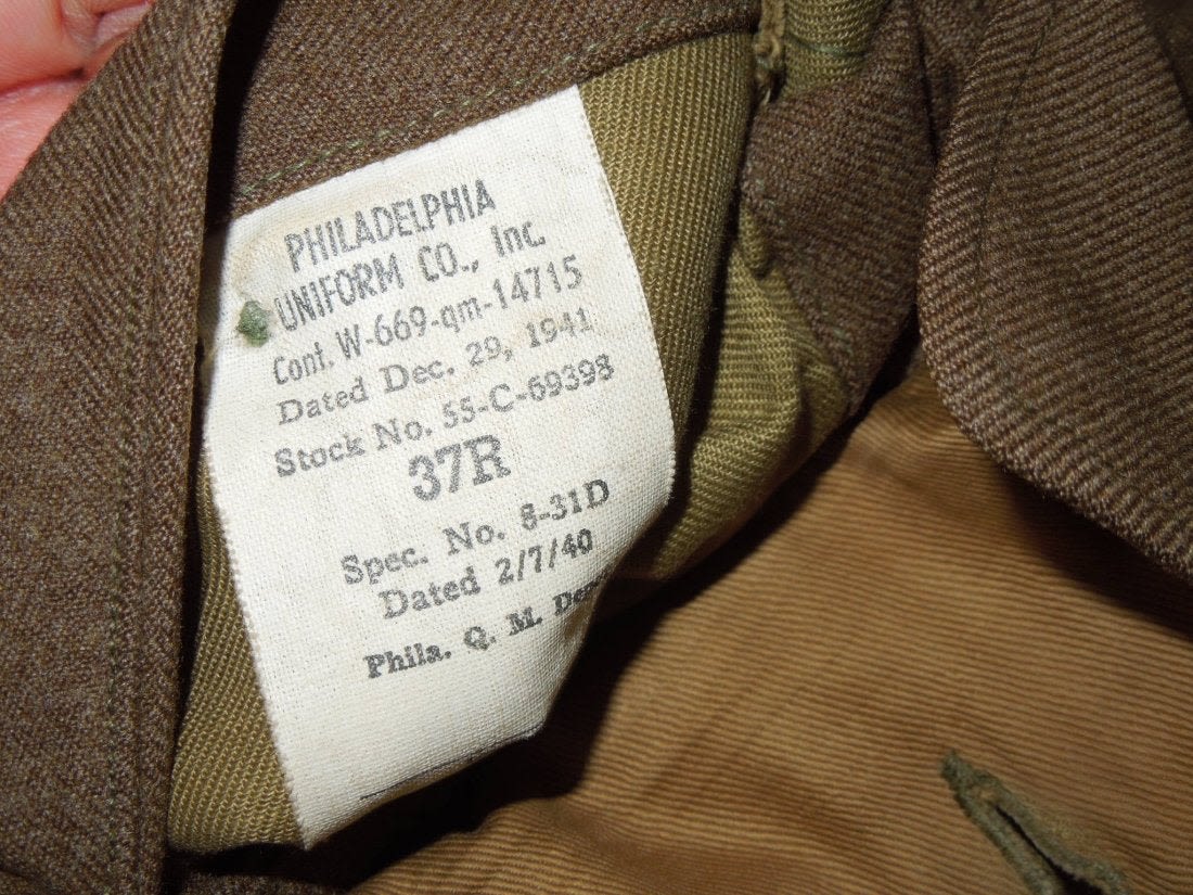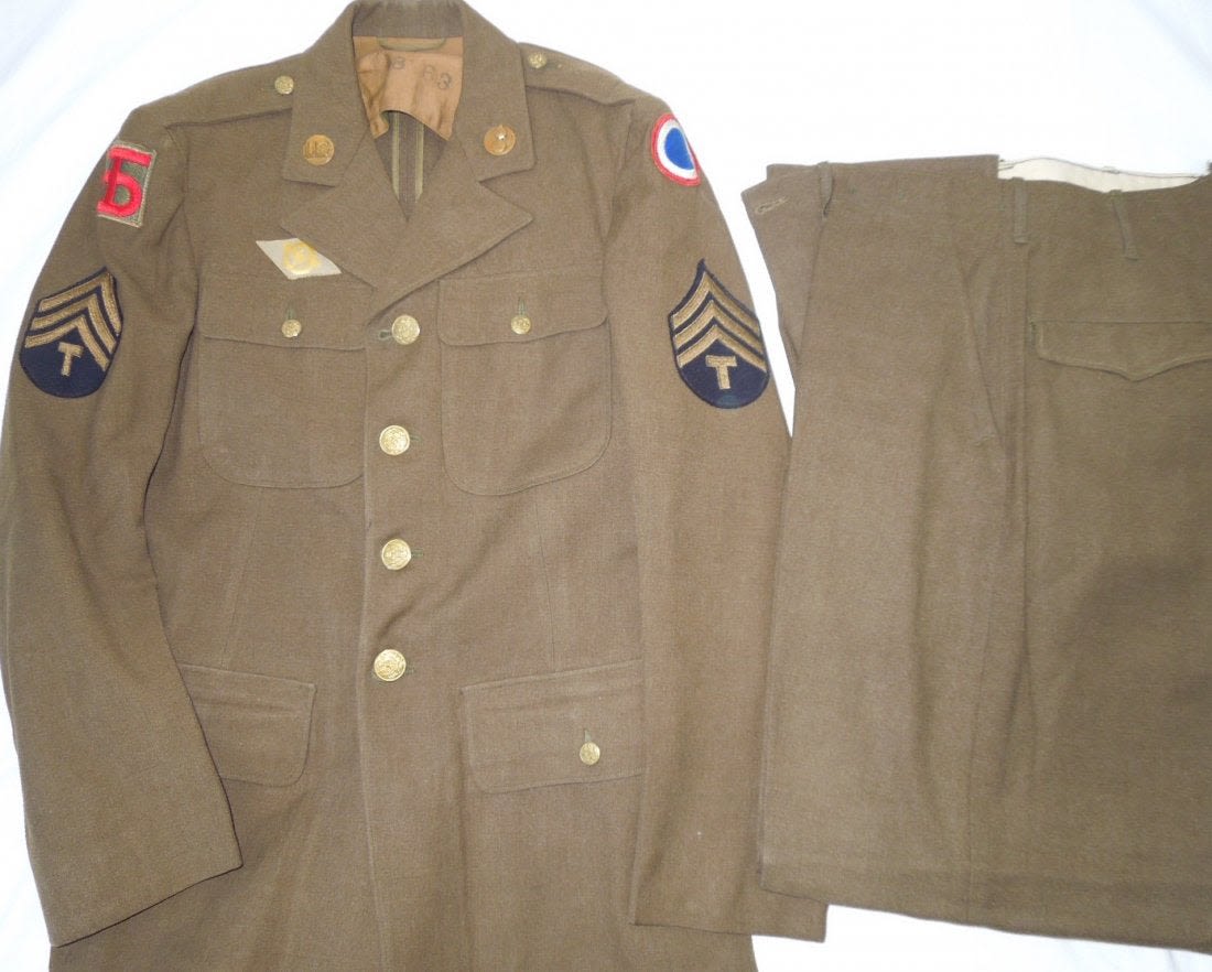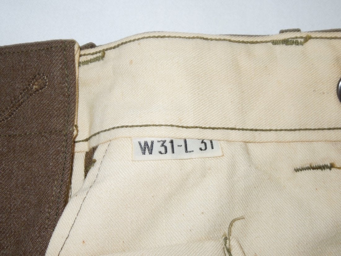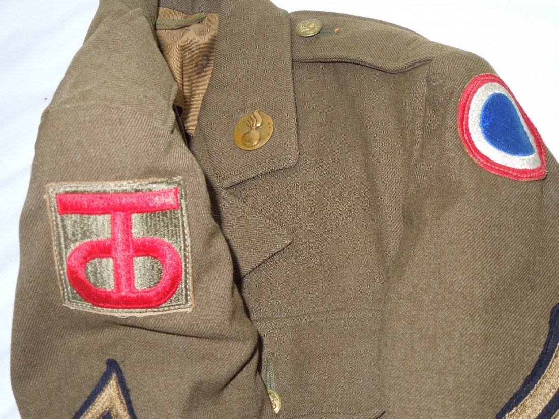 WWII Ordnance jacket of the 90th Infantry Division and Replacement Command. Size 37R and in good condition. Comes with trousers in a size 31×31. (I B 201)