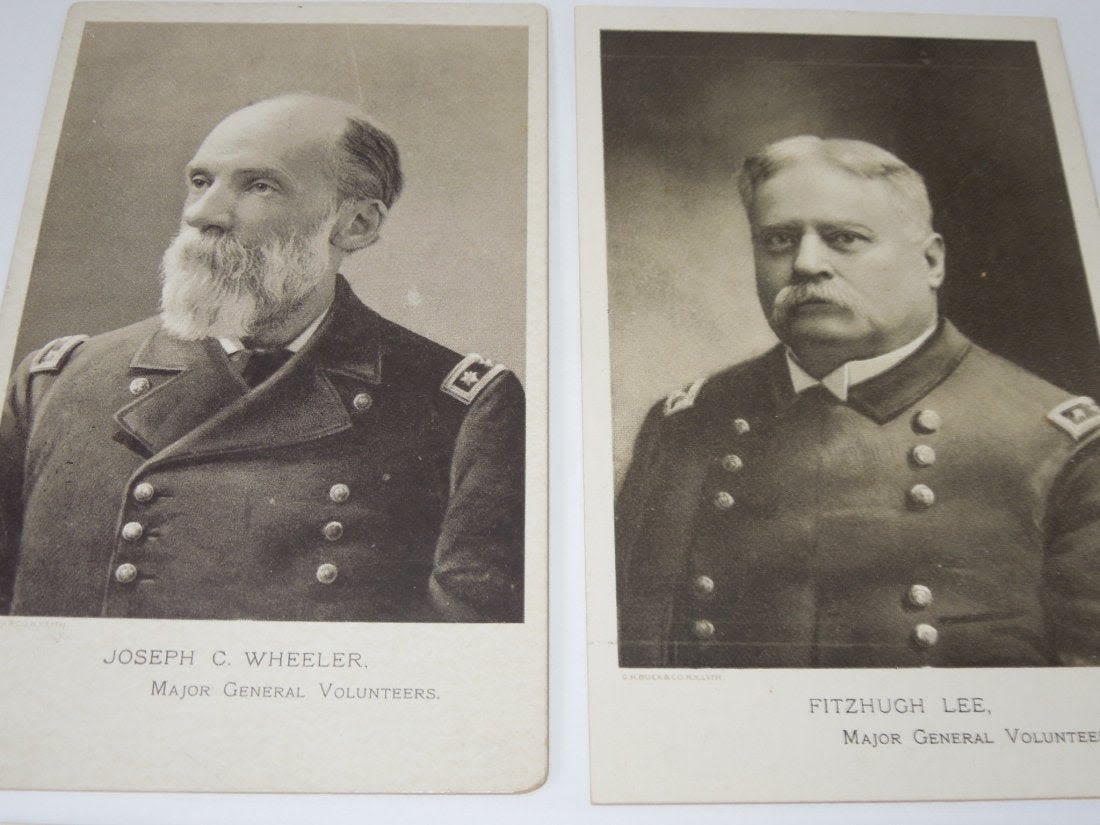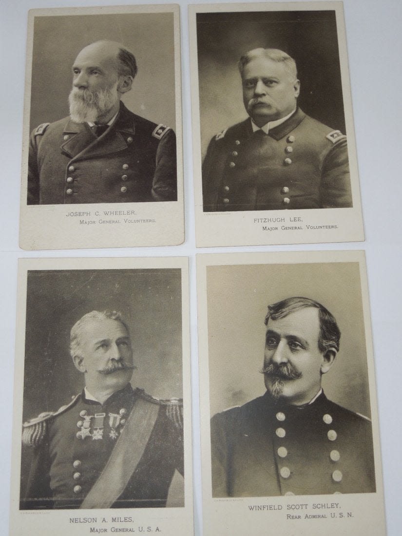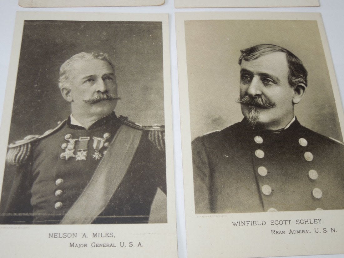 Spanish American War Fairbanks Fairy Soap Portrait Cards. You will receive the following 4 cards. Joseph C. Wheeler, Major General Volunteers, Fitzhugh Lee, Major General Volunteers, Nelson A. Miles, Major General U.S.A., Winfield Scott Schley, Rear Admiral U.S.N. These cards came from The N. K. Fairbank Company. Size is 3.75 x 5.25 inches. Condition is good.