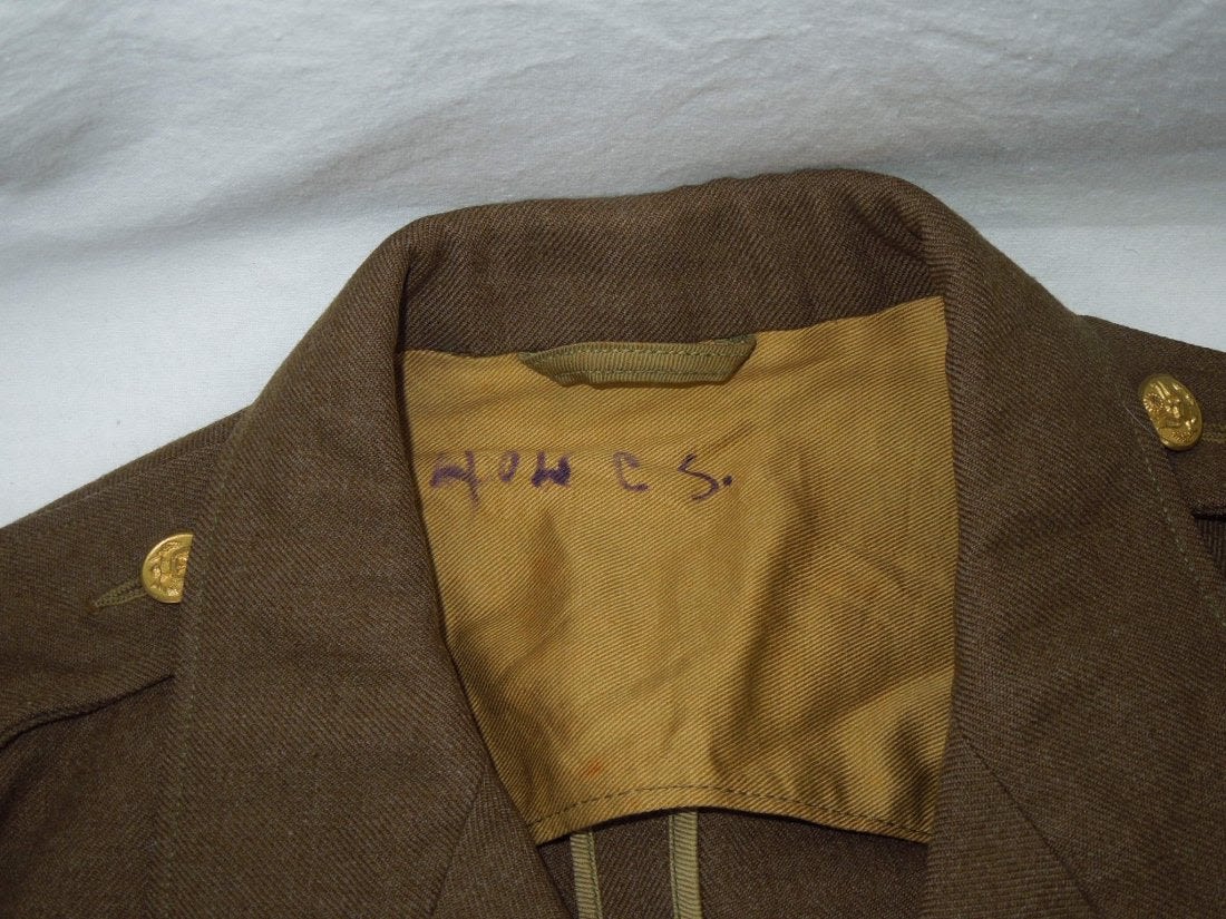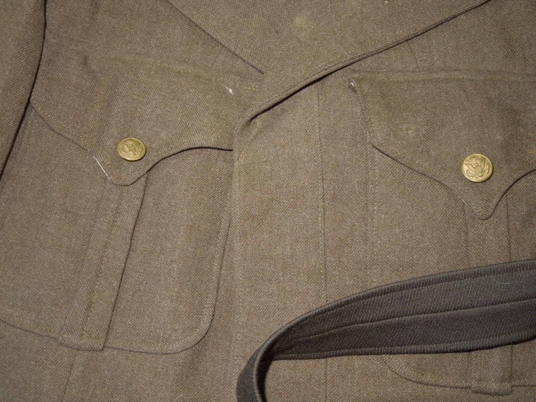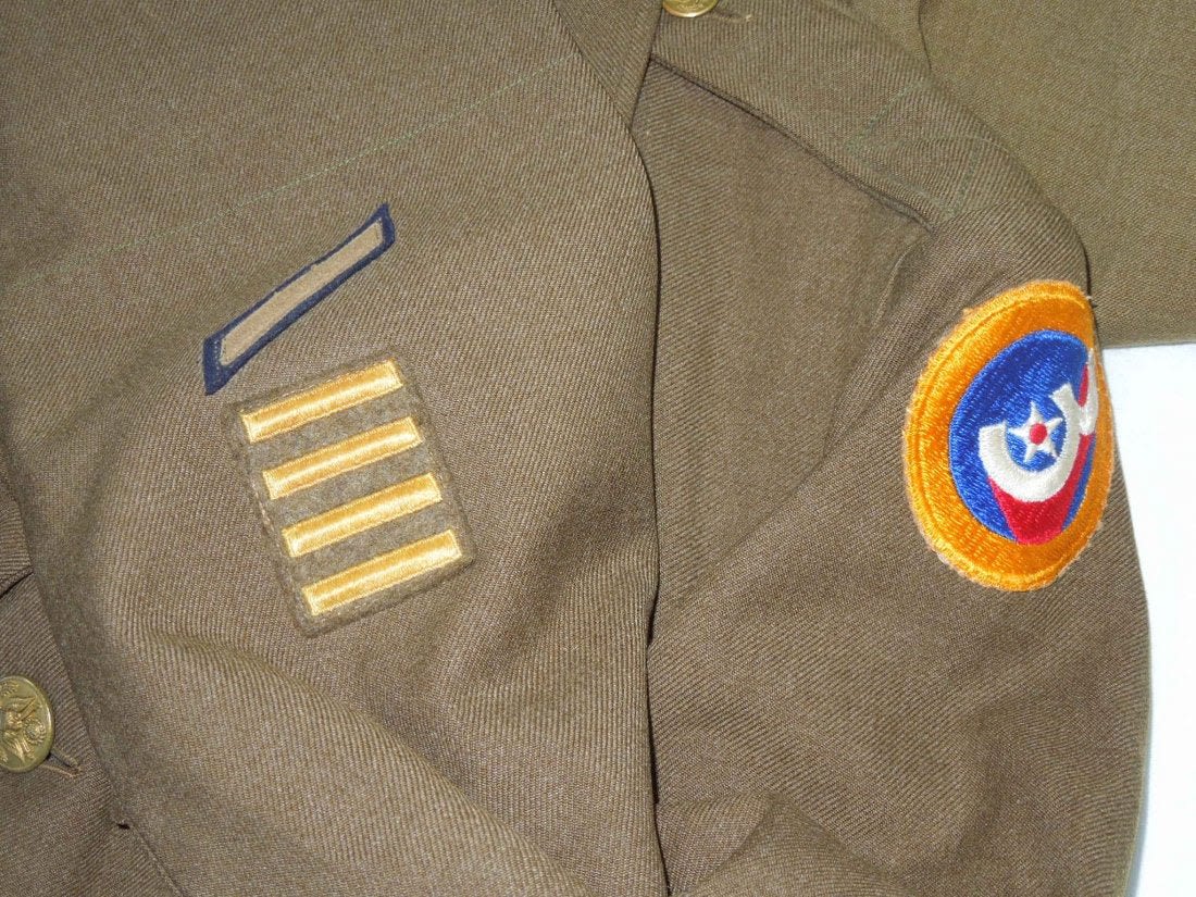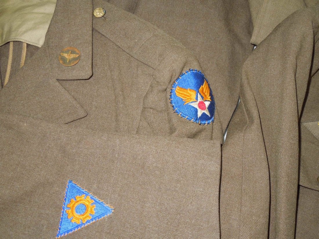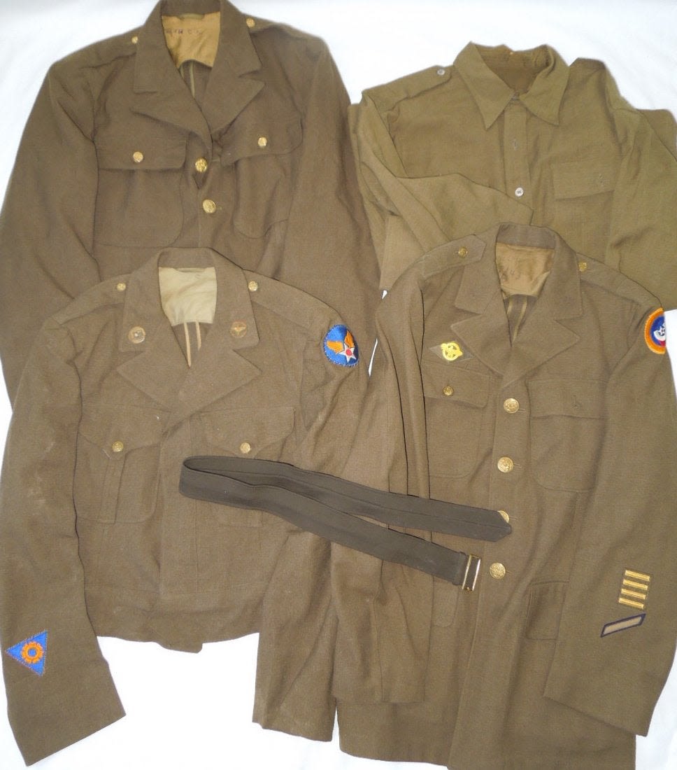 Lot of five items as shown- several uniforms, officer uniform belt, OD wool shirt. Mix of AAF related patches. Fair to good condition with some mothing or wear from age. (I C 21, 20, I F 9, I K 101)