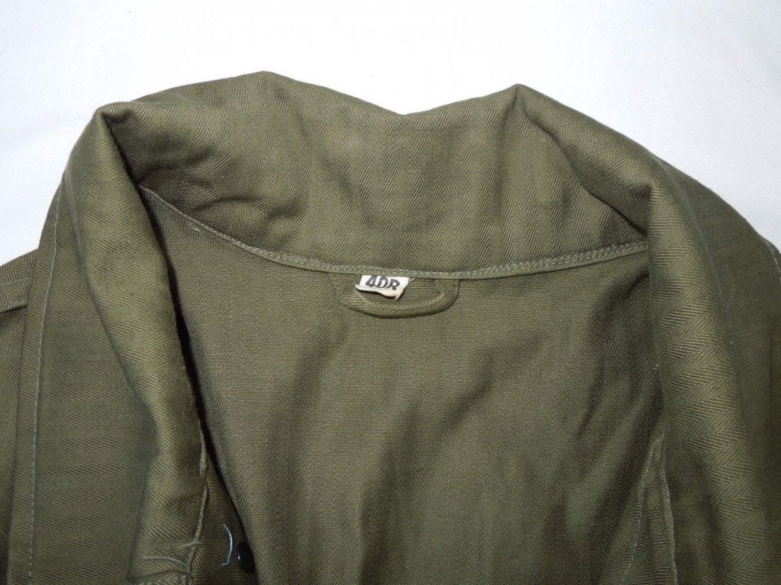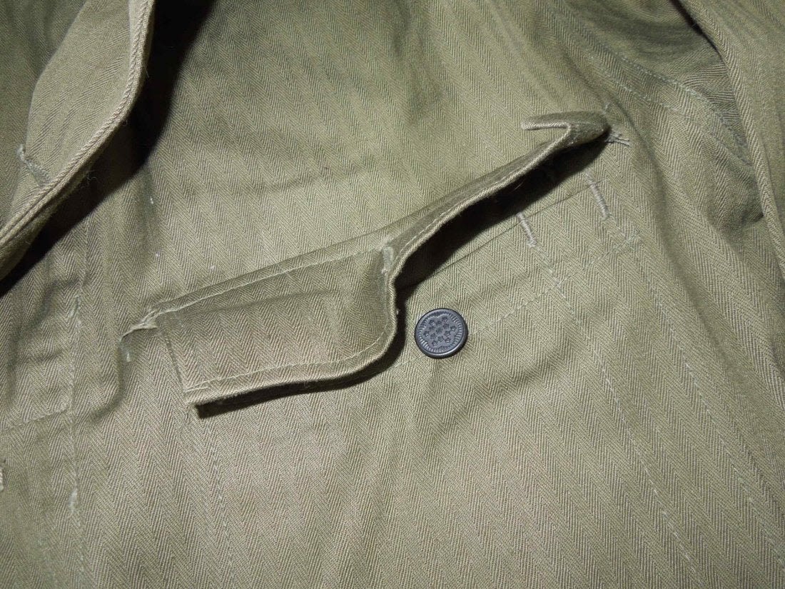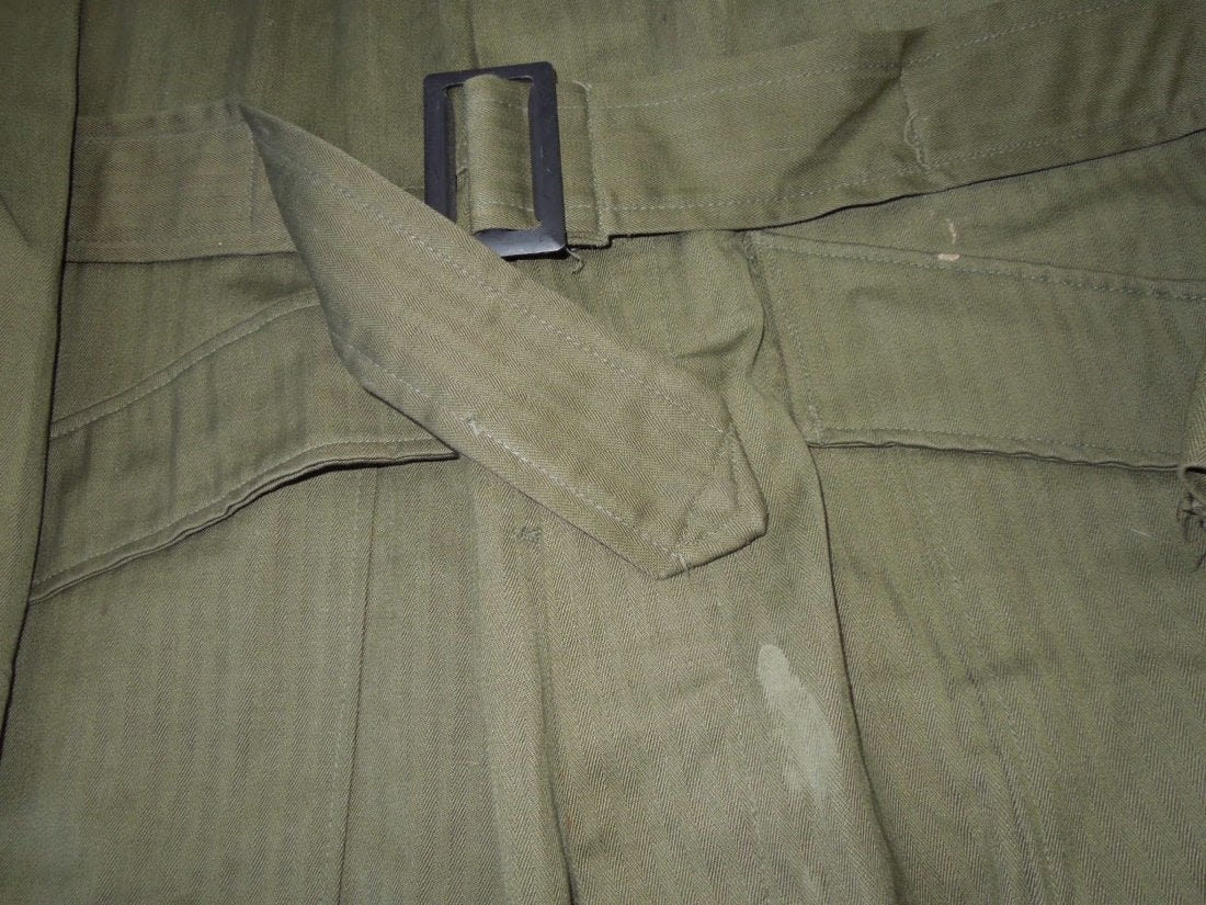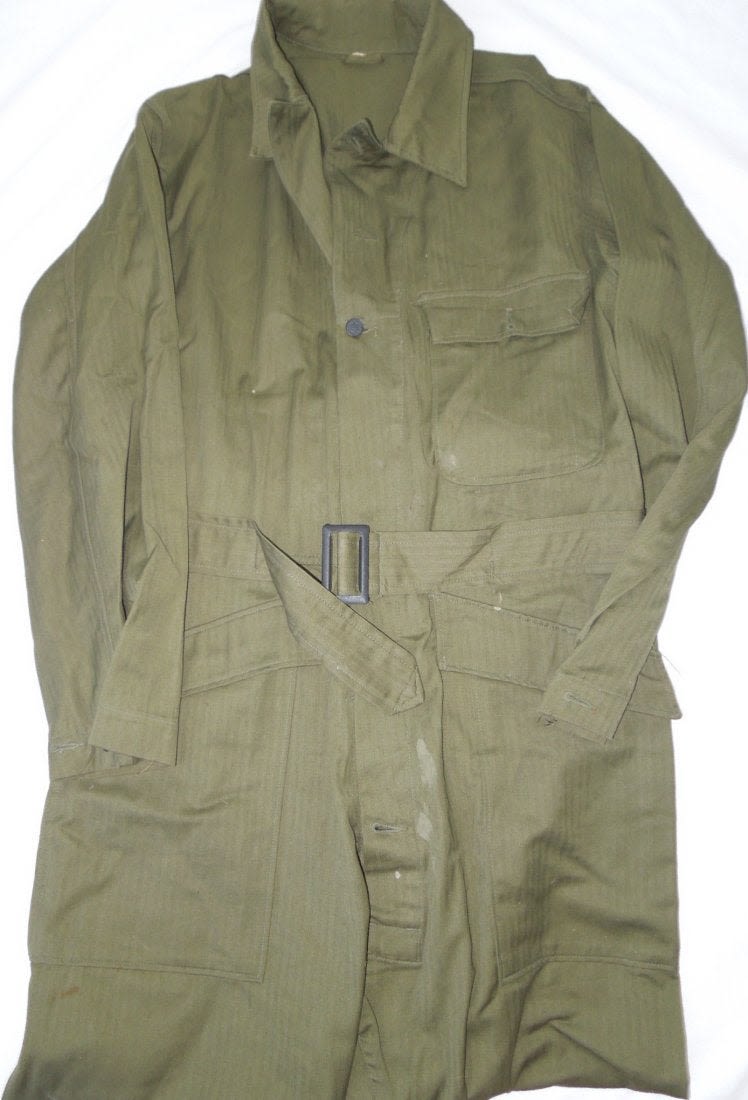 Good condition (minor staining in the front crotch area) Herringbone Twill HBT coveralls with belt in a size 40R. WWII era. (I H 16)
