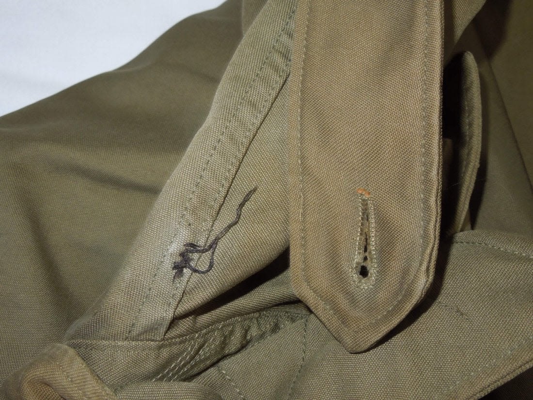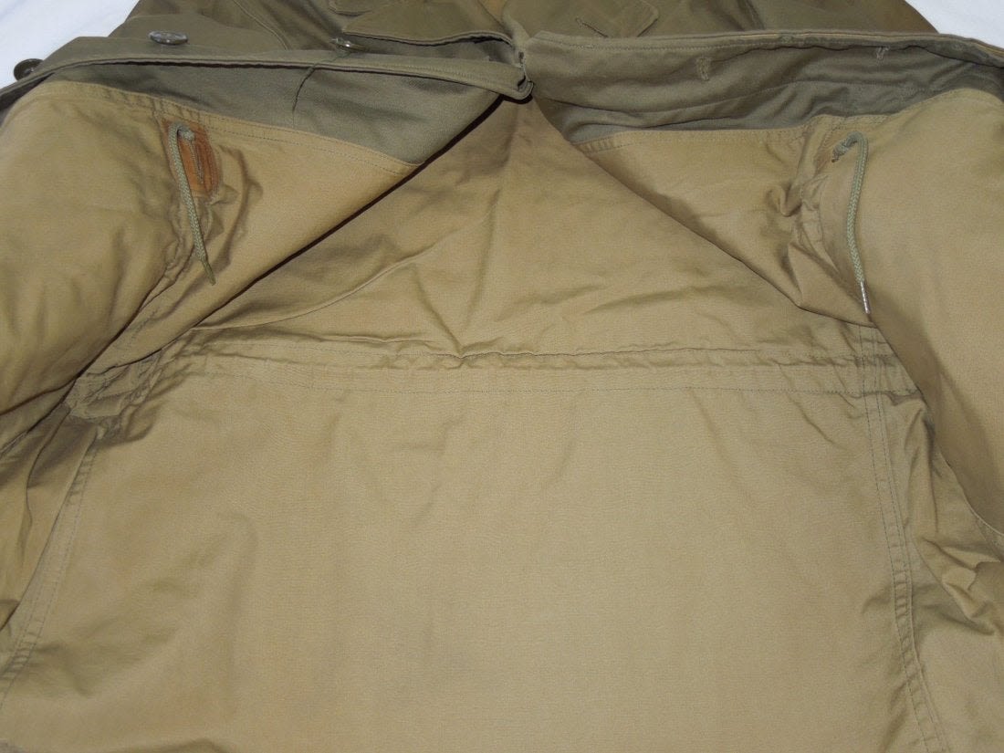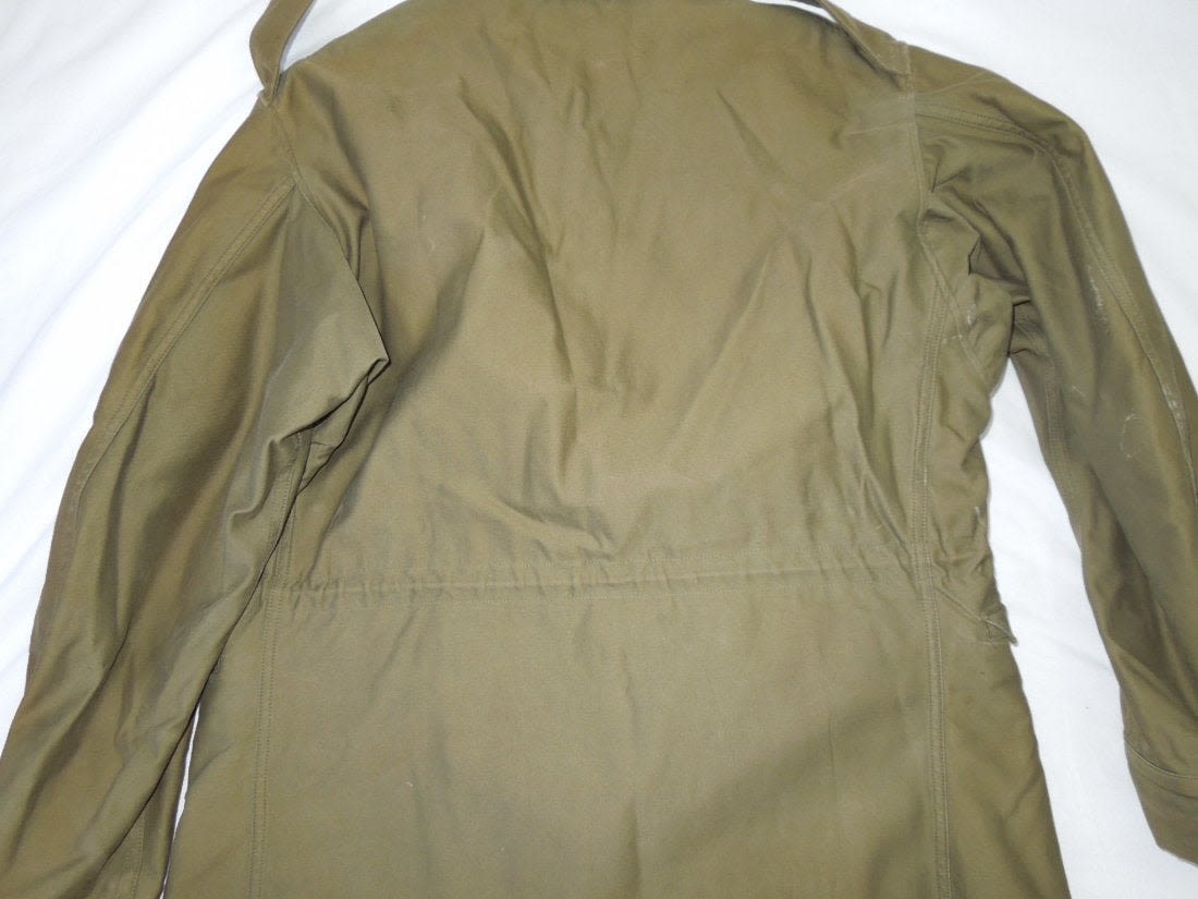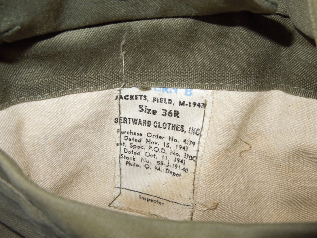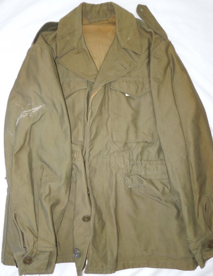 WWII November 1943 dated M1943 field jacket in a size 36R. Used condition with some wear evident and a stain on one sleeve. (I H 3)