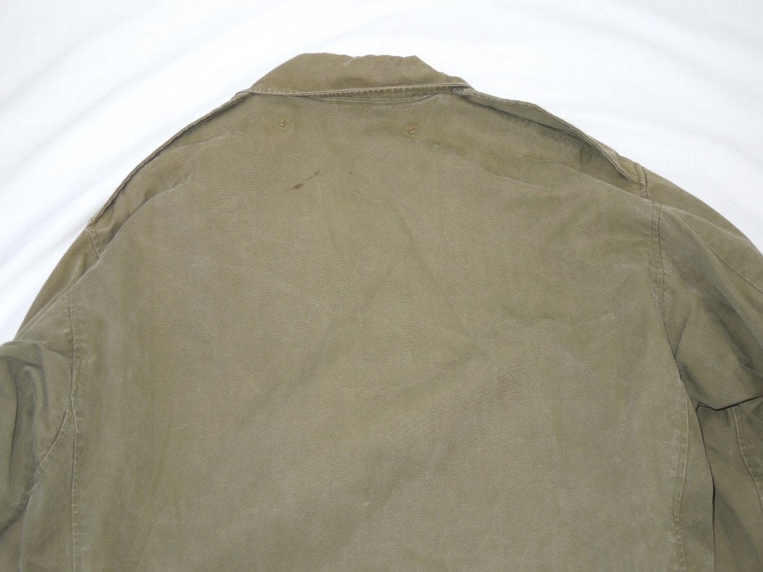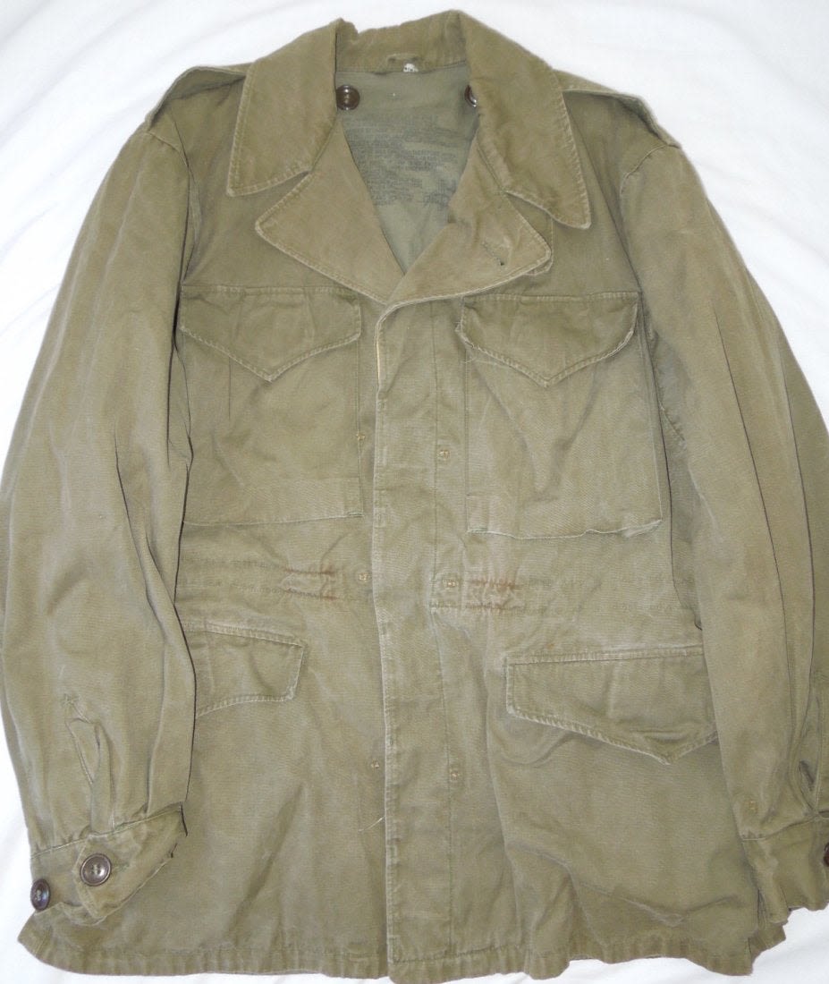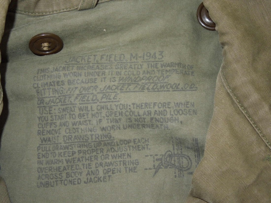 WWII May 1945 dated M1943 field jacket in a size 36R. Olive Drab. Used condition with some wear evident. (I H 4)