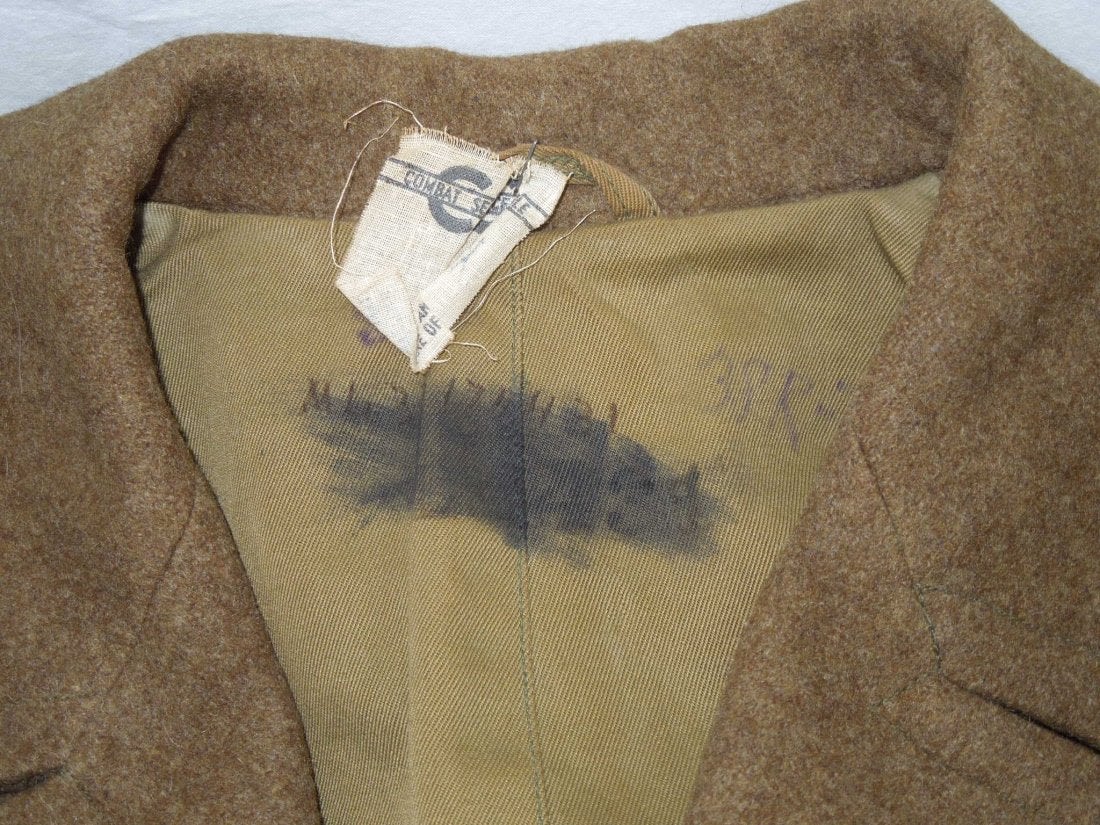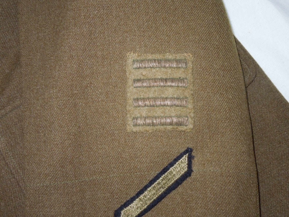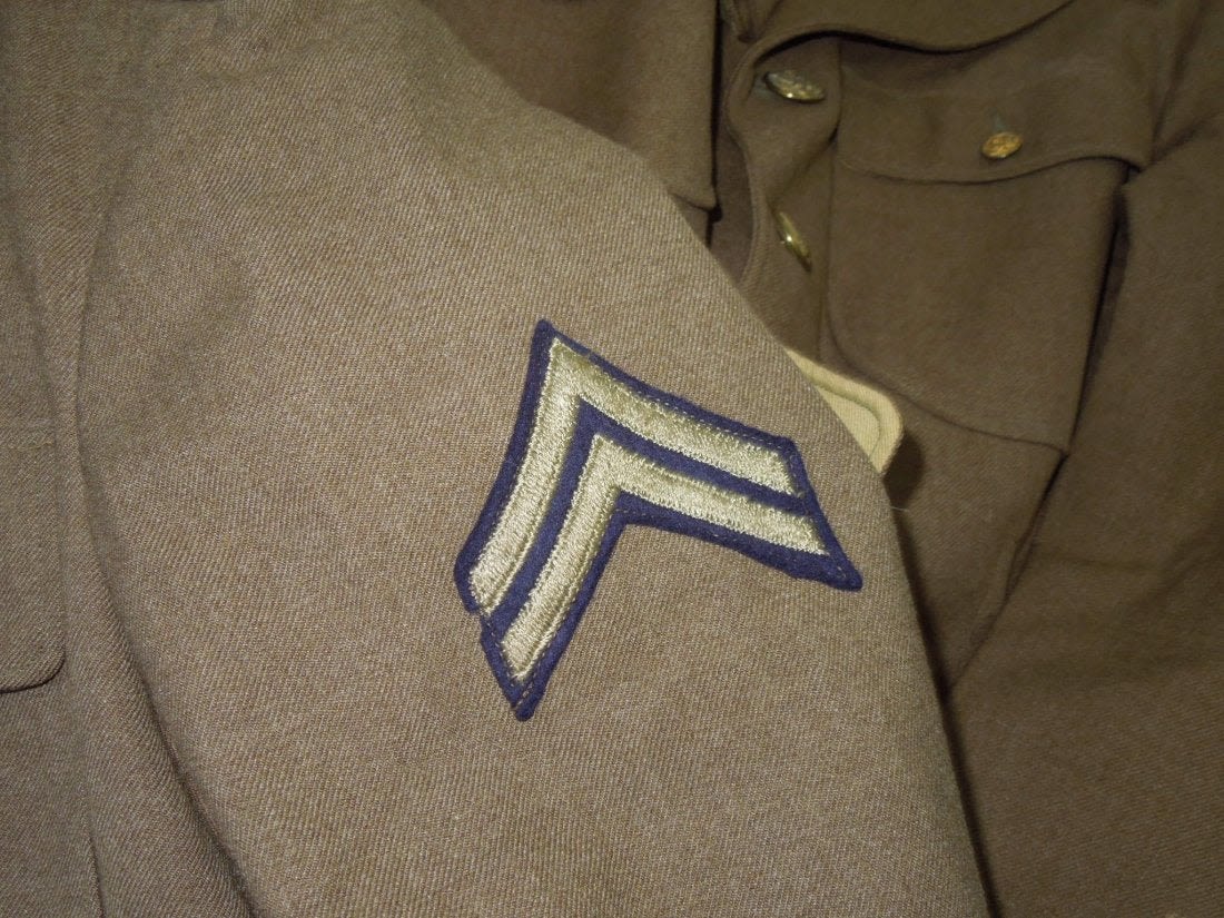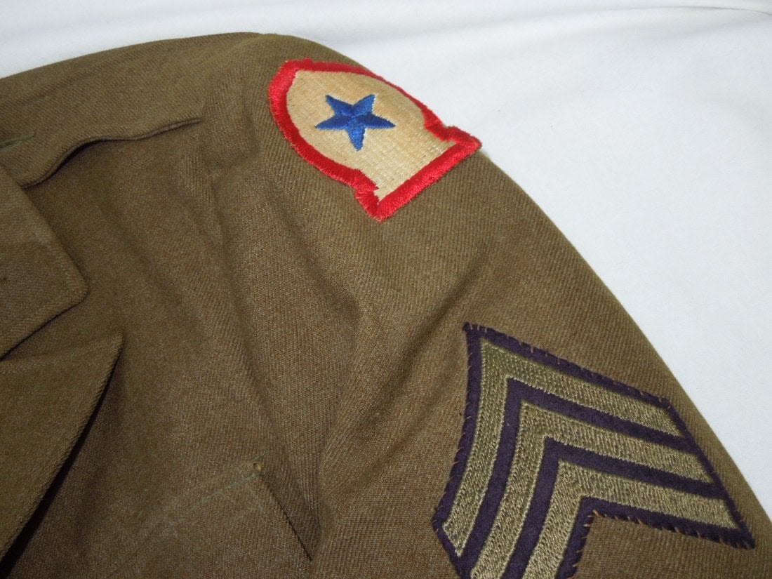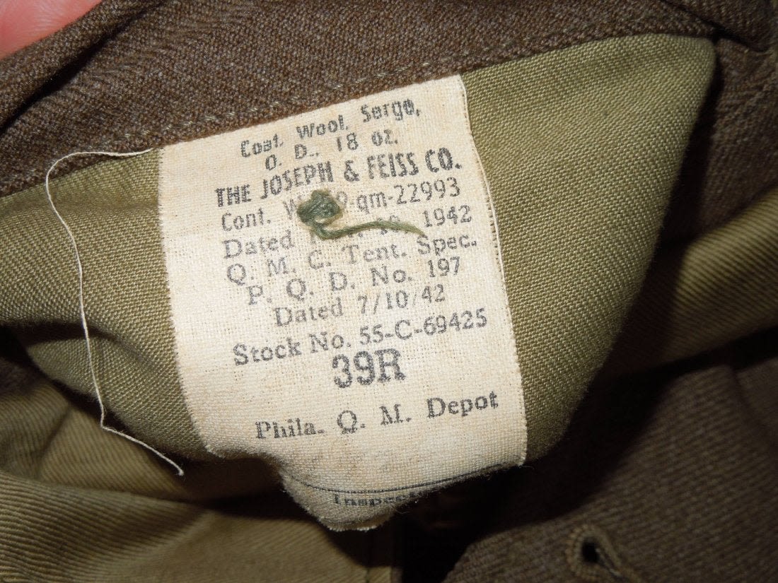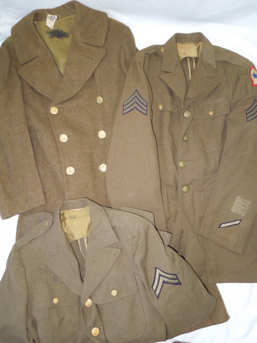 Two enlisted WWII jackets along with an overcoat. One is to a Sergeant with the North Africa Command with tinsel bullion overseas stripes. Good condition with wear consistent with age and some minor moth holes. (I B 213)