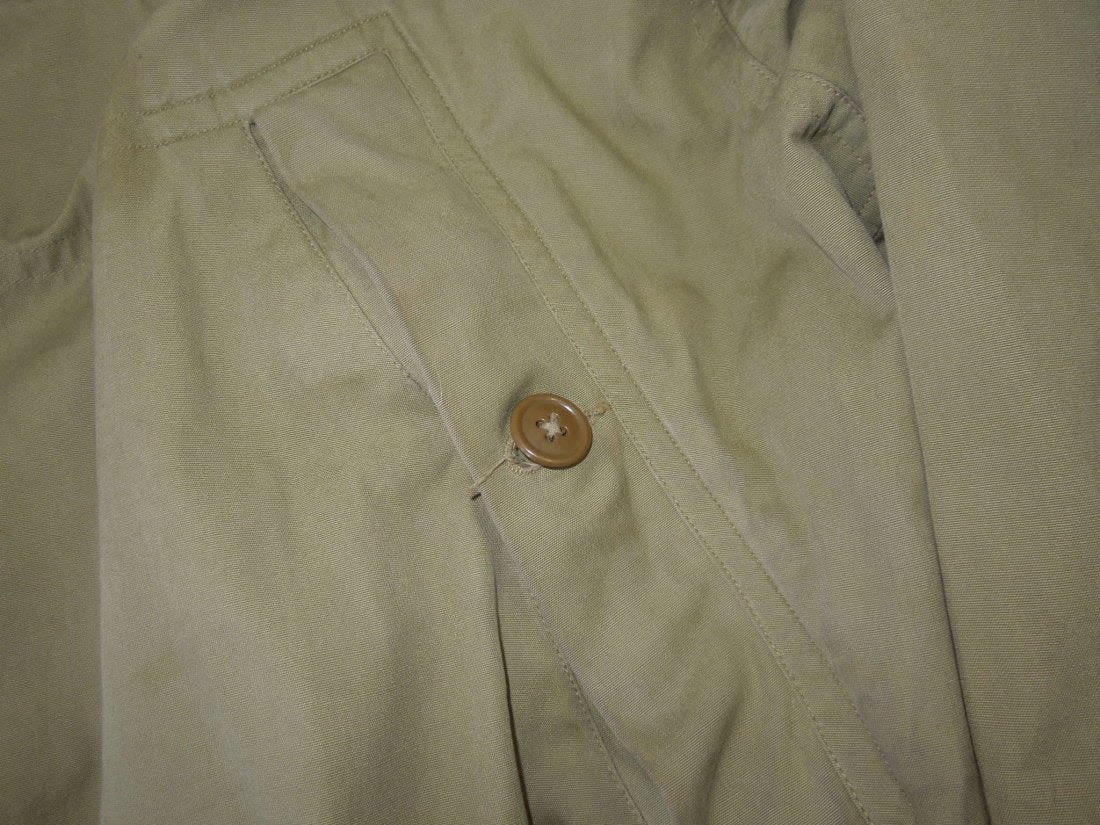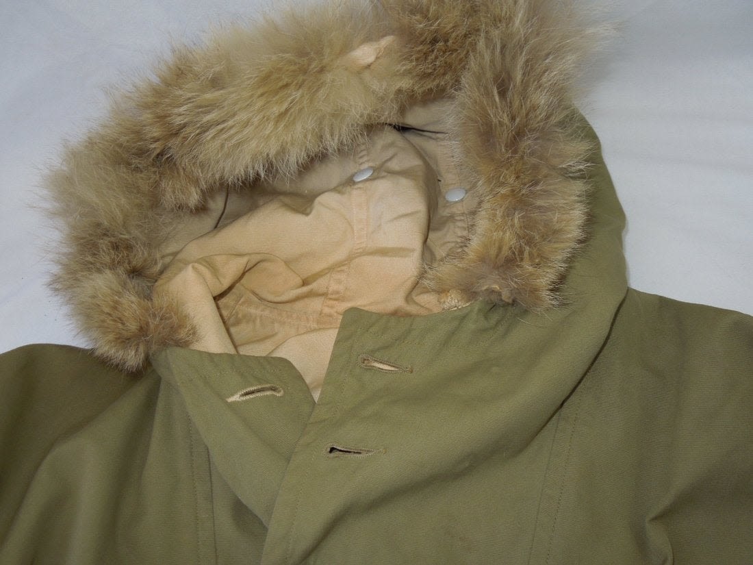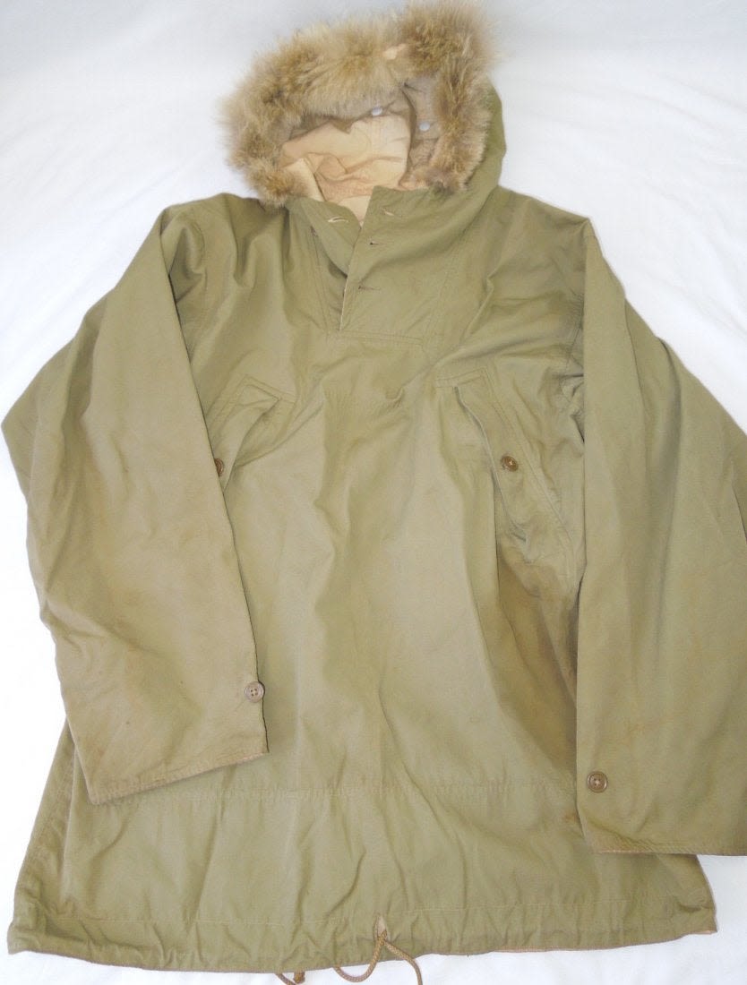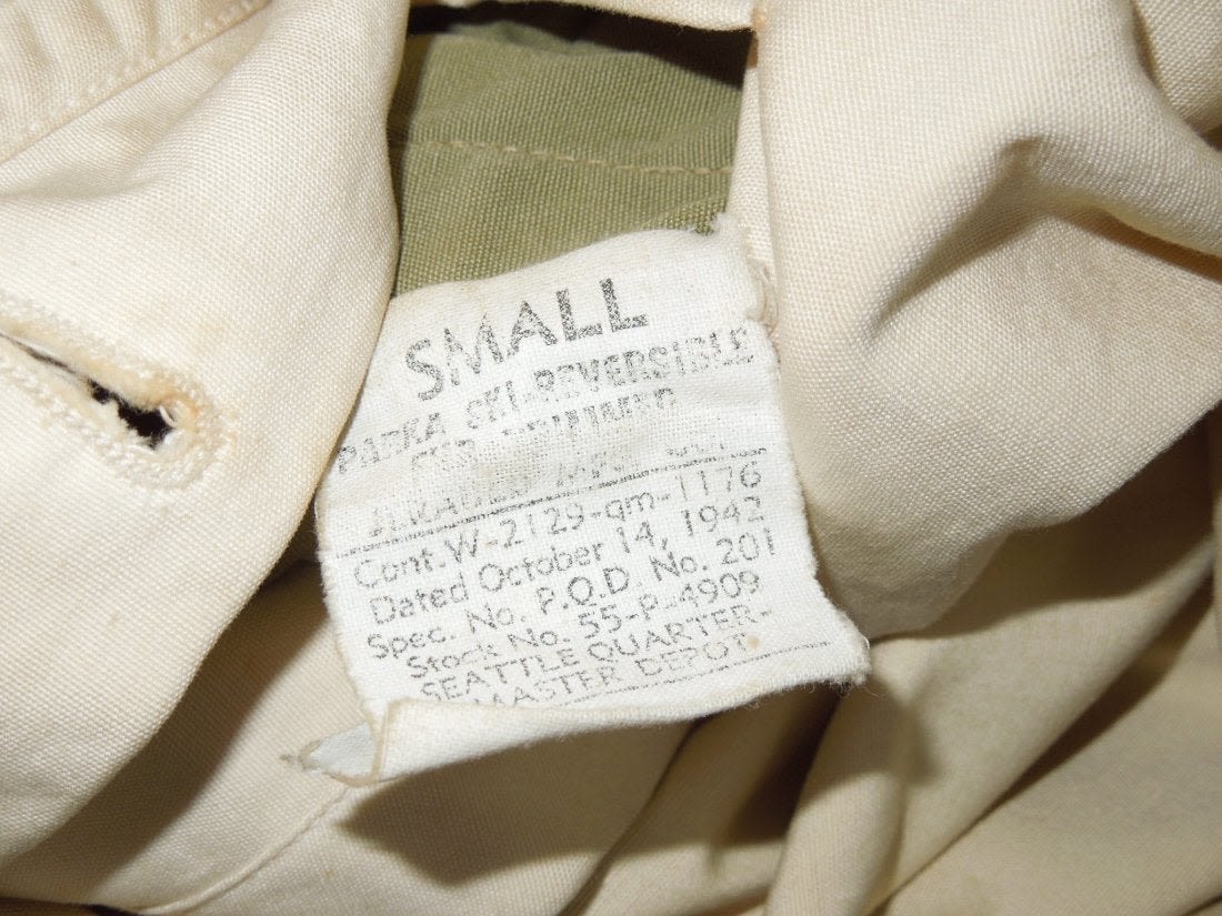 WWII 1942 US Mountain troops white and green reversible ski parka. Maker is Seattle Quartermaster Depot. Size is small. Good condition with wear from age. (I H 7)