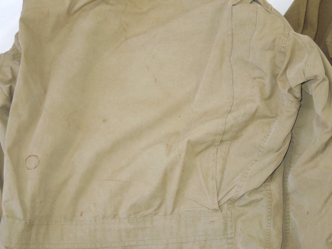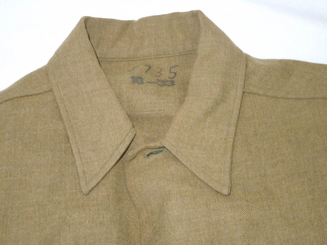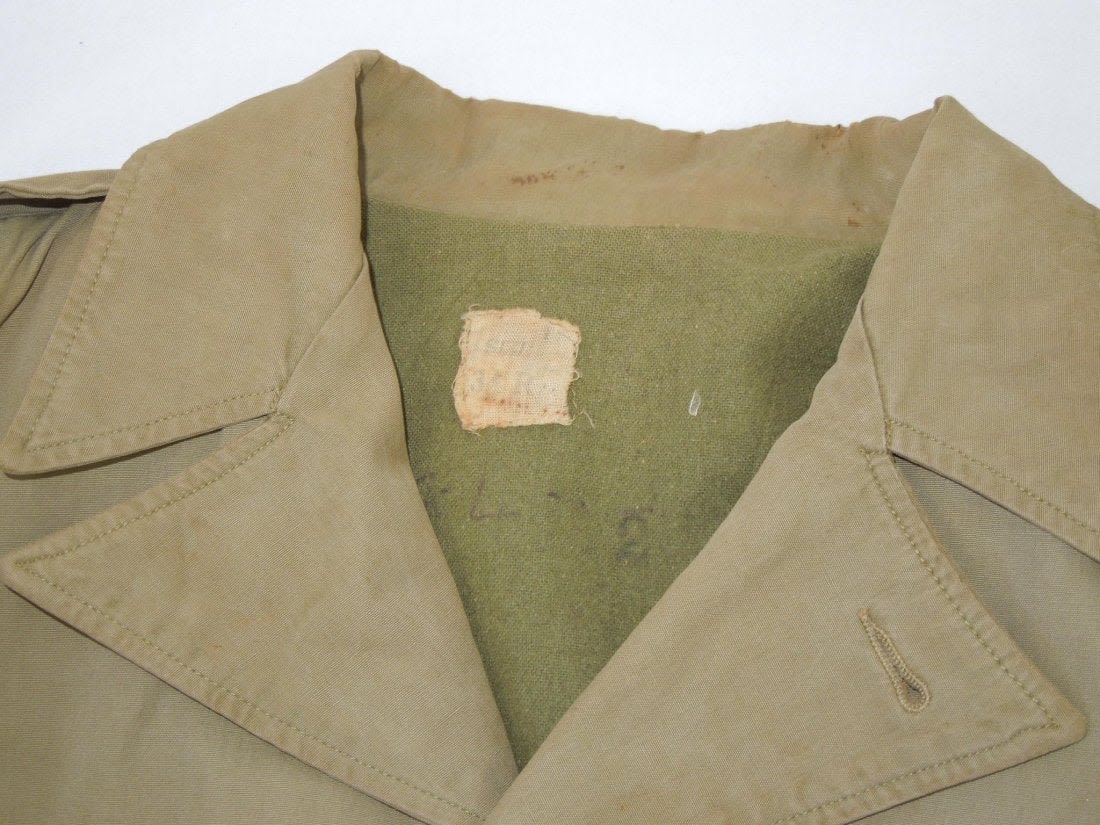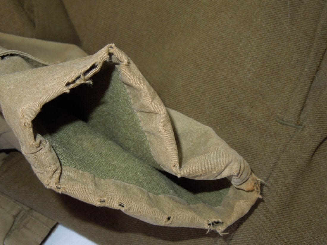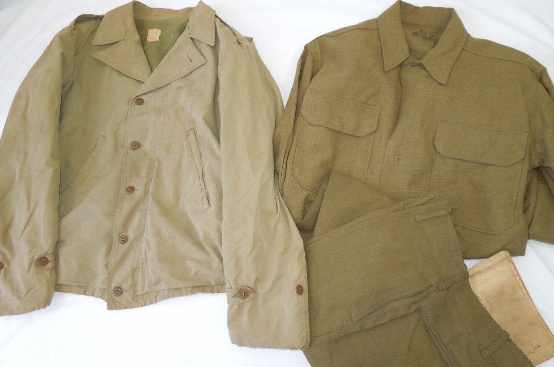 WWII M41 Field Jacket in a size 34, OD wool shirt sized 16 x 33, and OD wool trousers sized 32×31. Good condition with wear from age. (I H 1)