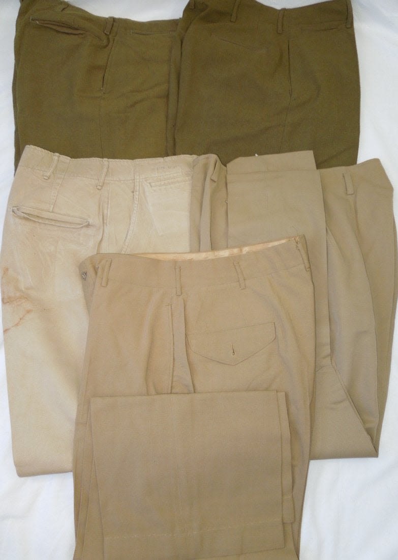 Lot of five pairs of WWII Army / AAF trousers of various sizes. Good condition with wear from age apparent on some. (I G 102, 101, 100, 1, 5)