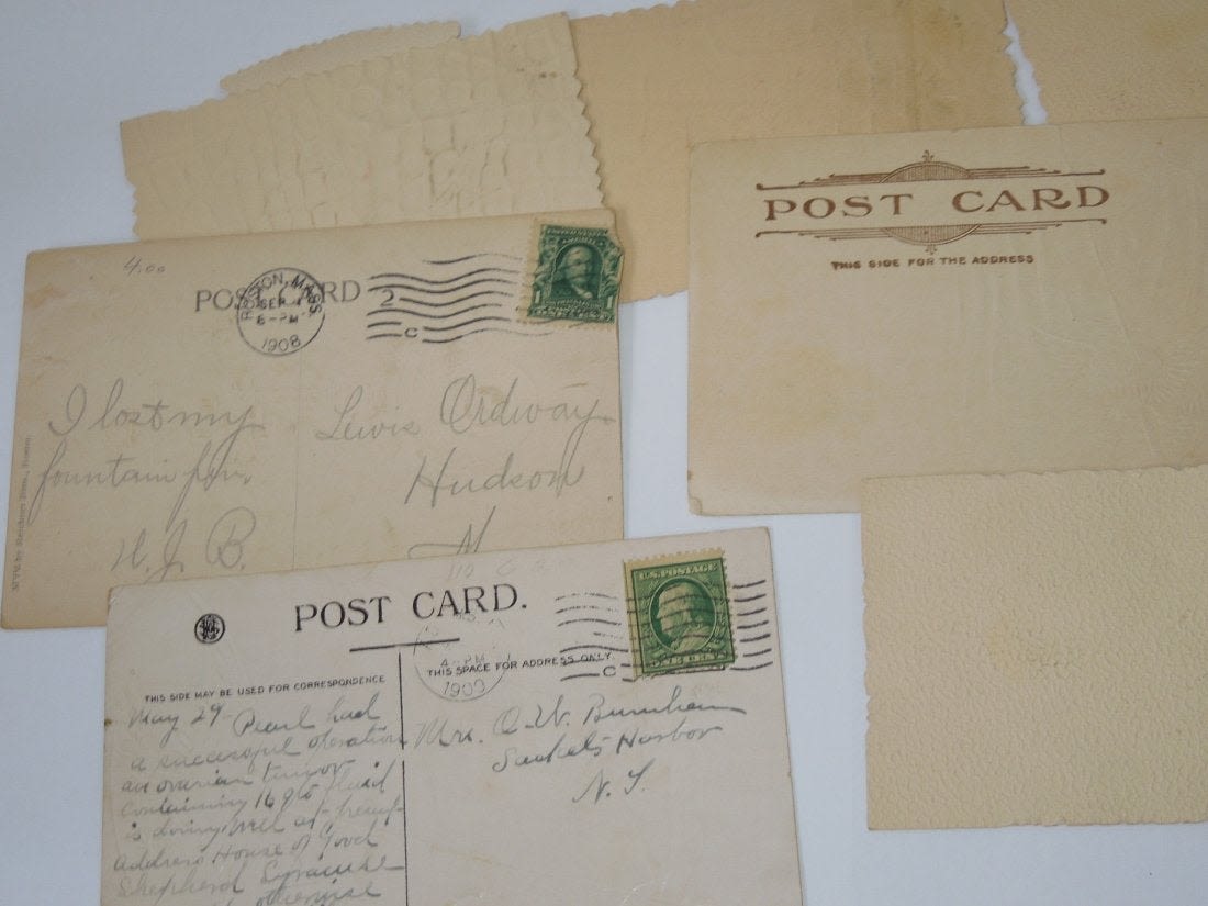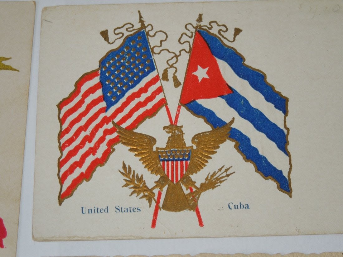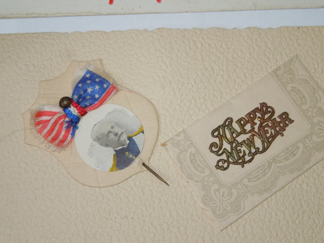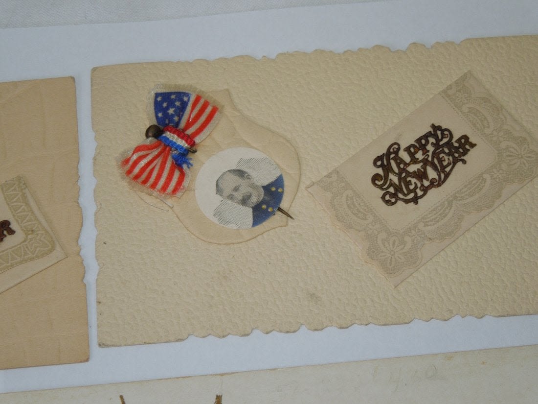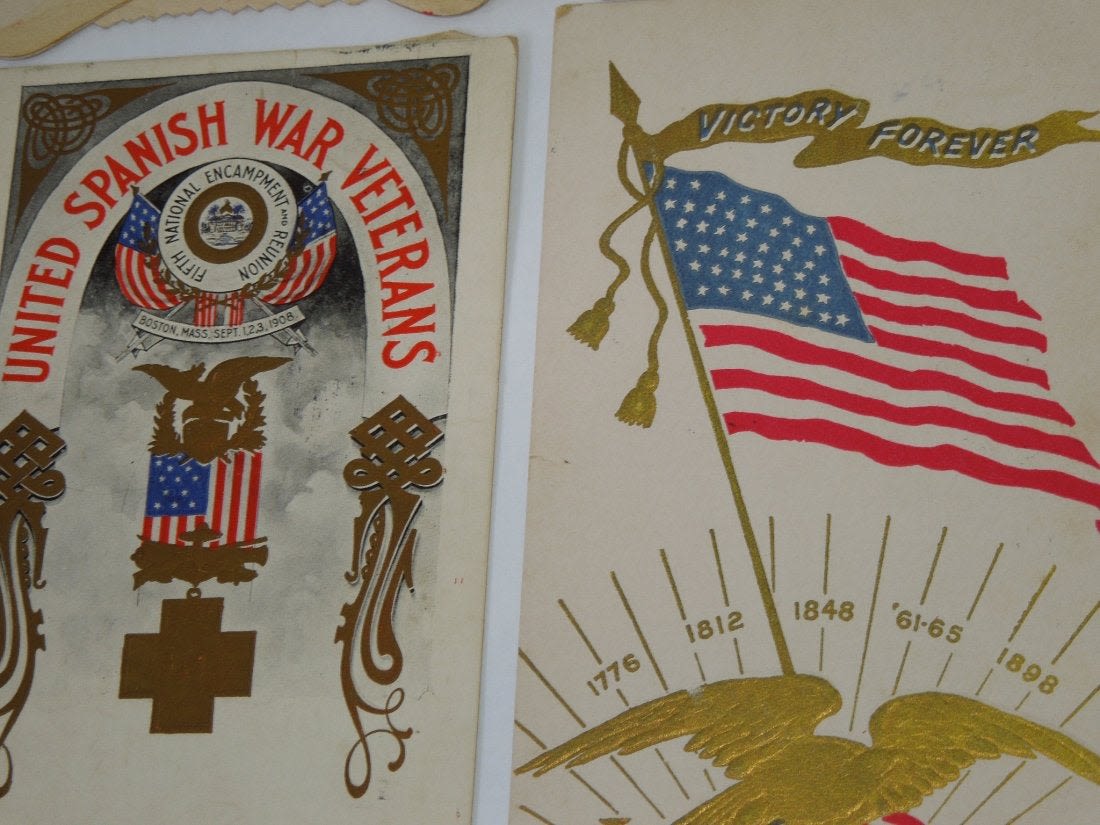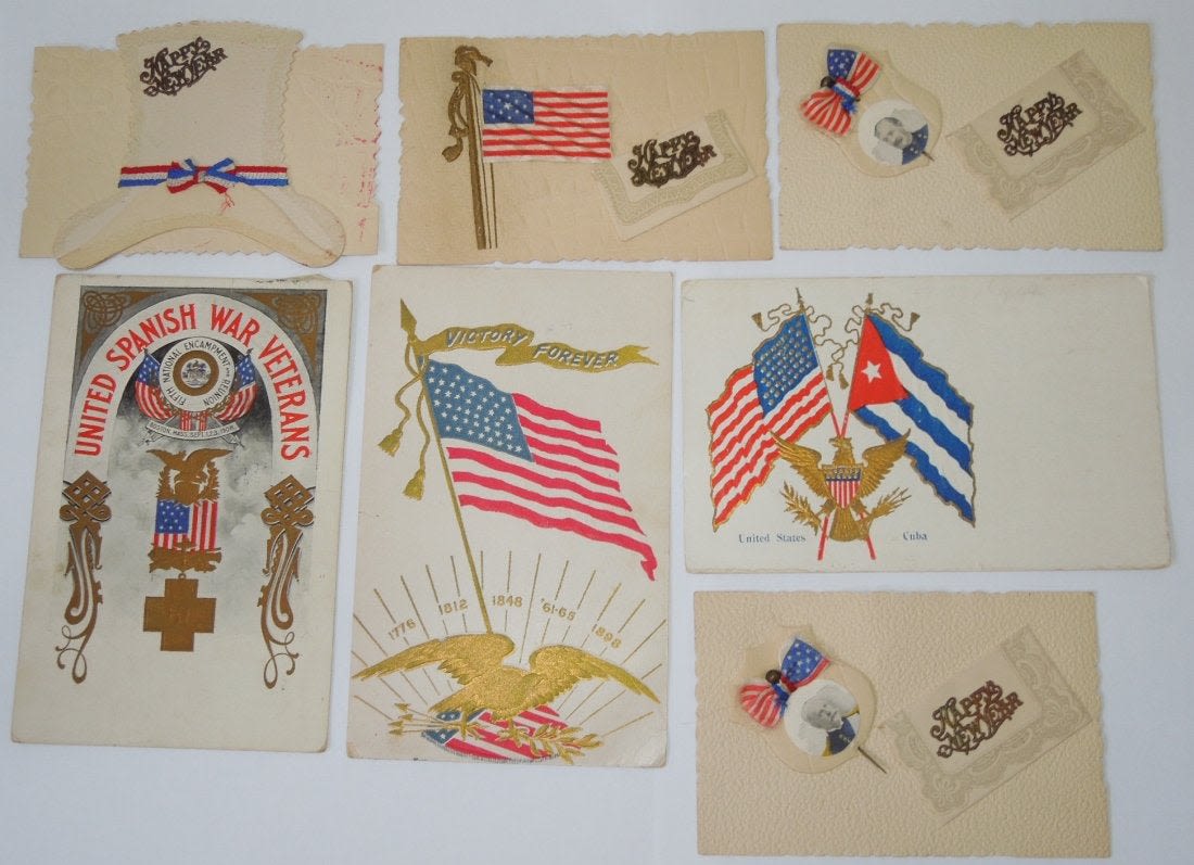 Spanish American War New Years Photo Pin Cards & Postcards. You will receive 7 of the following items. (4) 1897 Happy New Year Cards depicting 2 patriotic items (flag & ribbon) and picture pins of Admirals Dewey and Admiral Schley. The New Year Envelopes are stamped Pat. Nov. 16, 1897. Approximate size is 3 x 4.25 inches. Nice condition. Also, 3 Postcards. 1908 Postmarked United Spanish War Veterans, United States & Cuba Flags Postcard, and a 1909 Postmarked Victory Forever Postcard. Postcards are used and in various conditions.