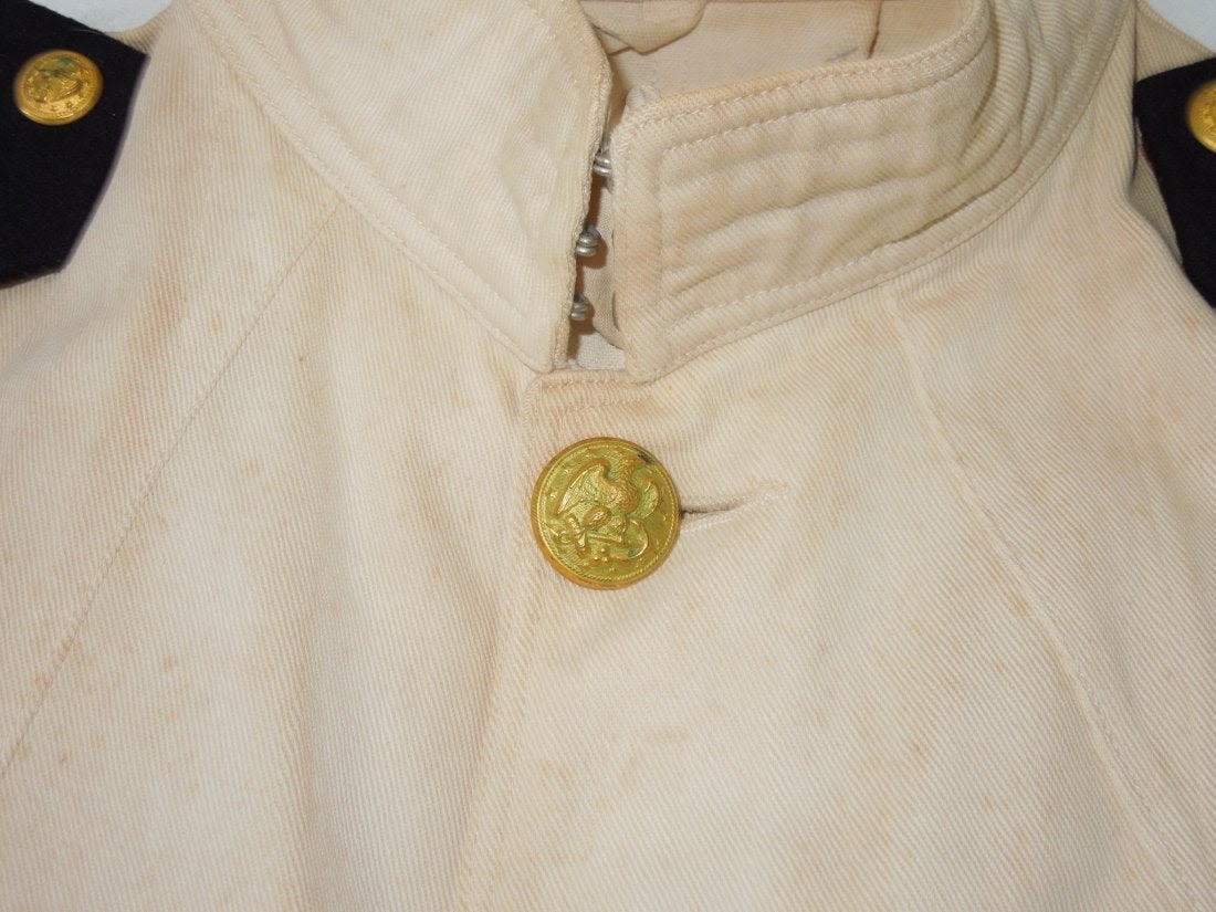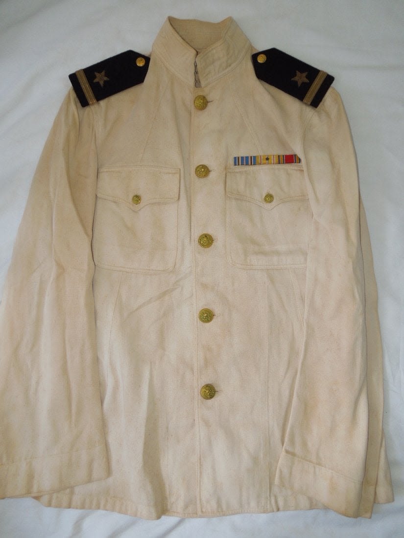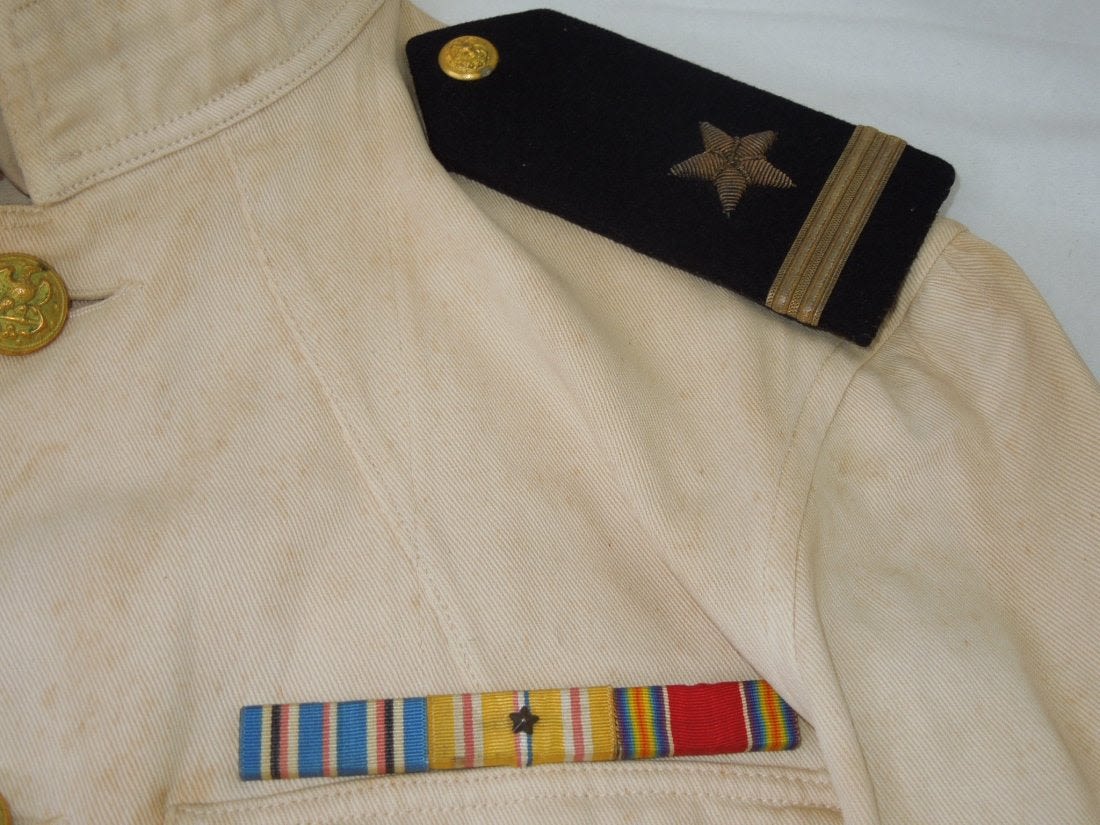 WWII US Navy choker white uniform jacket, not named and no tag, with Ensign shoulder boards in bullion and a wide Navy style ribbon bar showing Pacific Service. White is soiled from age.