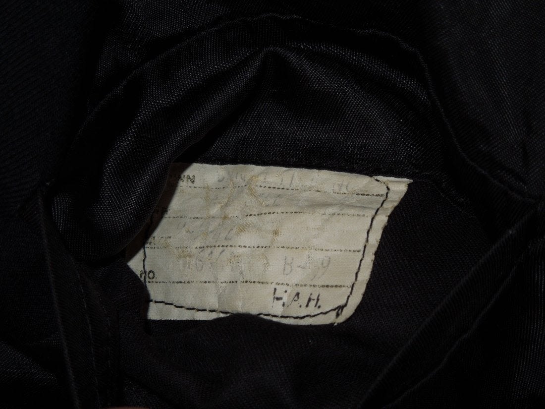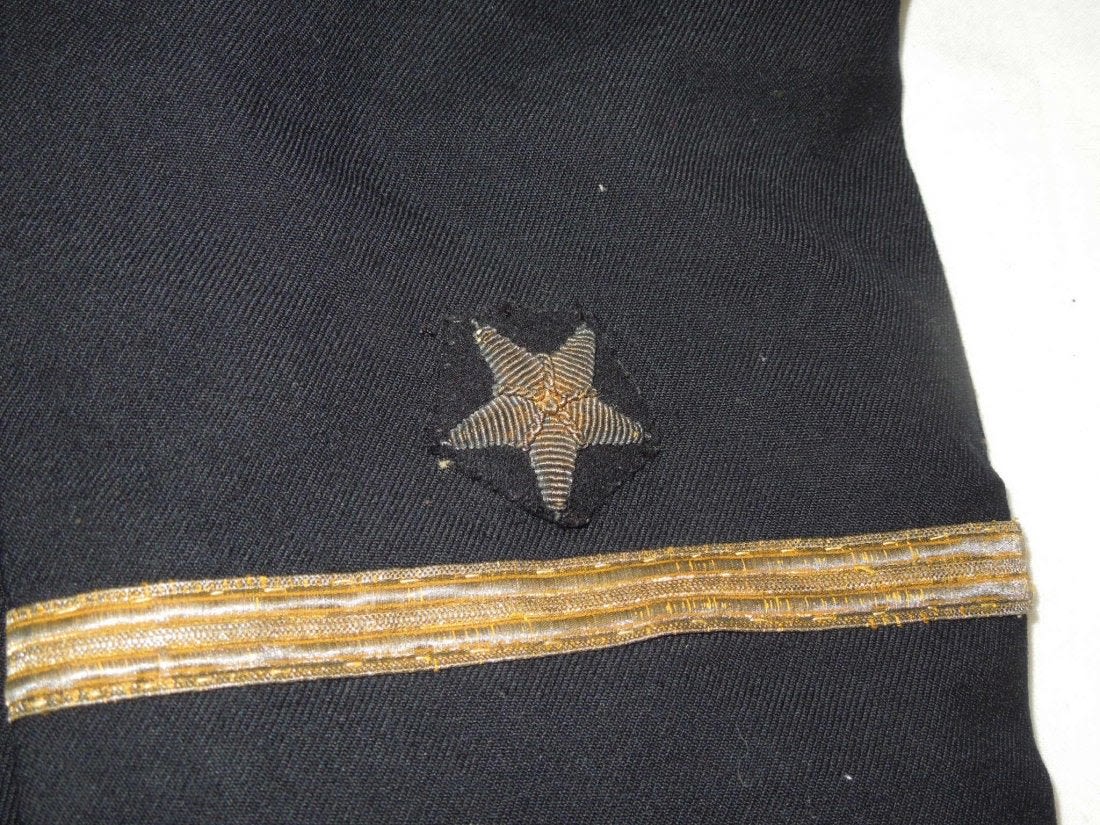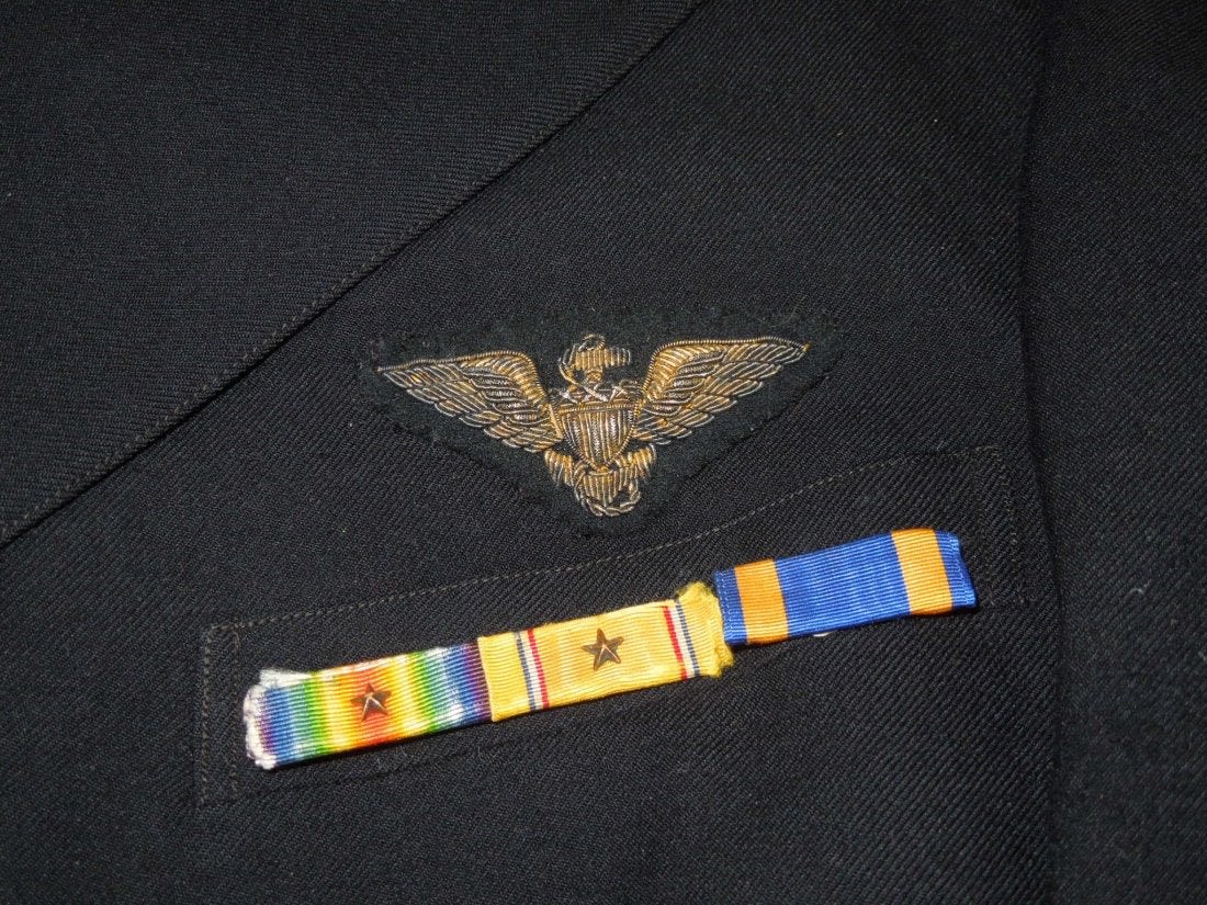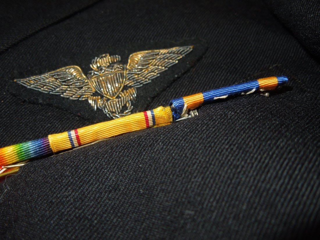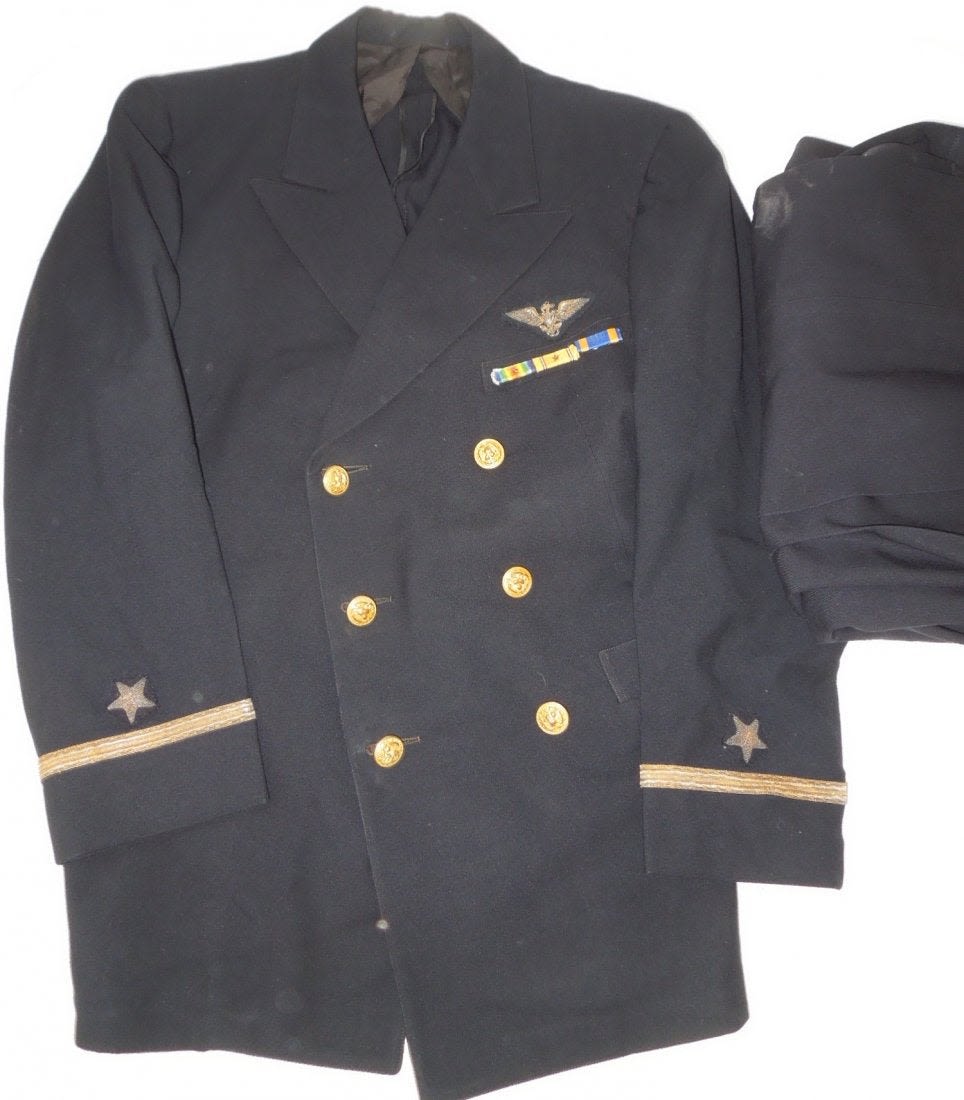 Named (hard to read on tag) black uniform and pants with bullion wings, ensign rank, and pin on custom made Air Medal, American Defense, and WWI Victory ribbons on it. Good condition; Could use a cleaning.