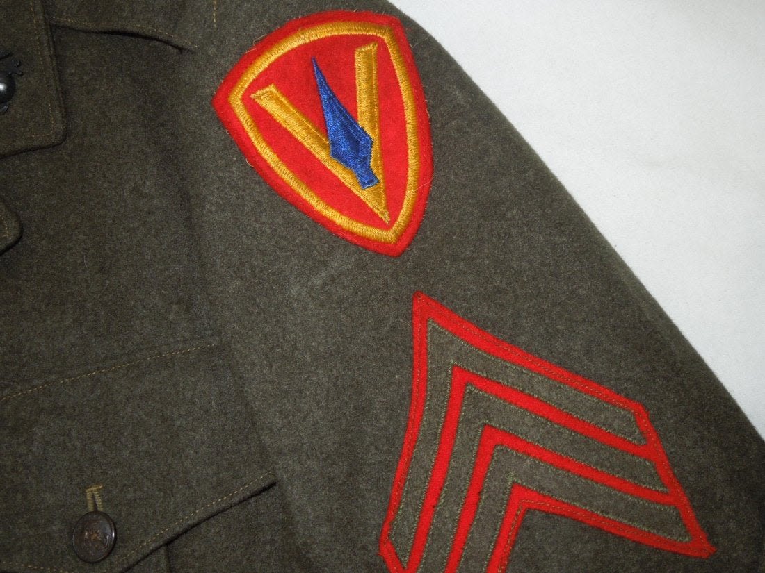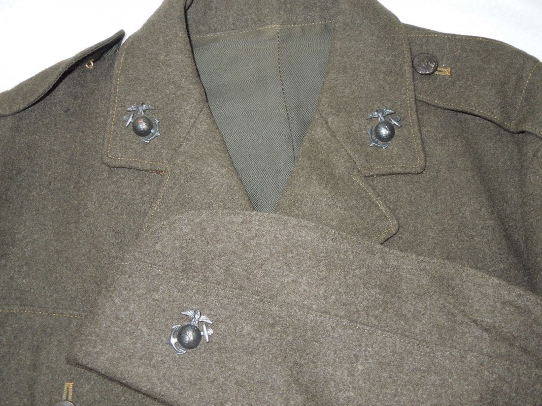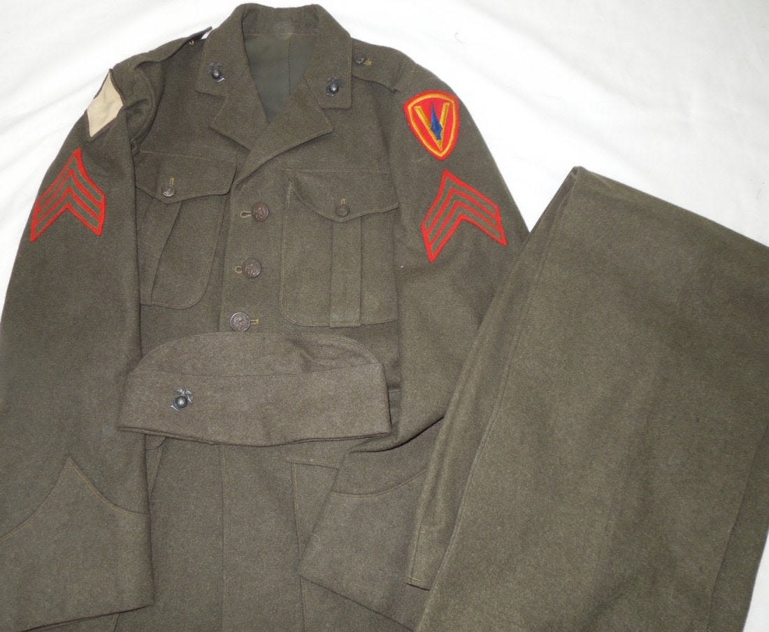 Group named to Sgt. Raymond Dilley of the 5th Engineers of the 5th Marine Division with a scarcely seen white diamond discharge patch, wool 5th MARDIV patch, pants, cap, and EGAs. Good condition with minor mothing.