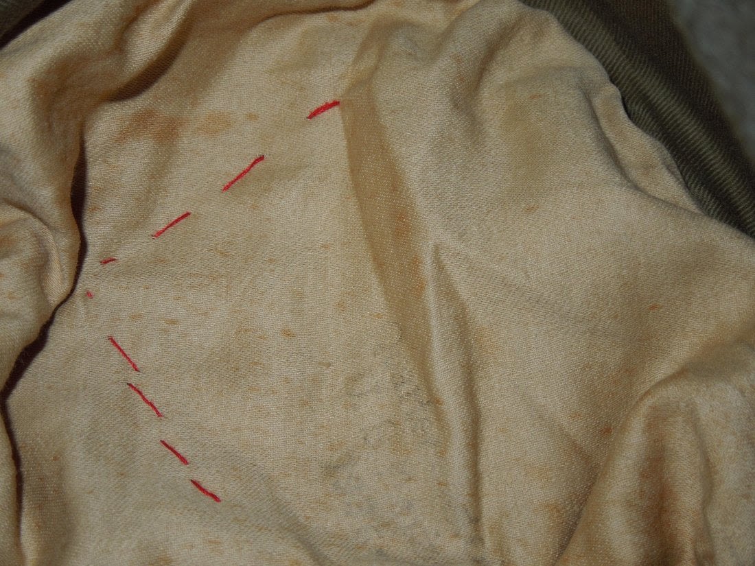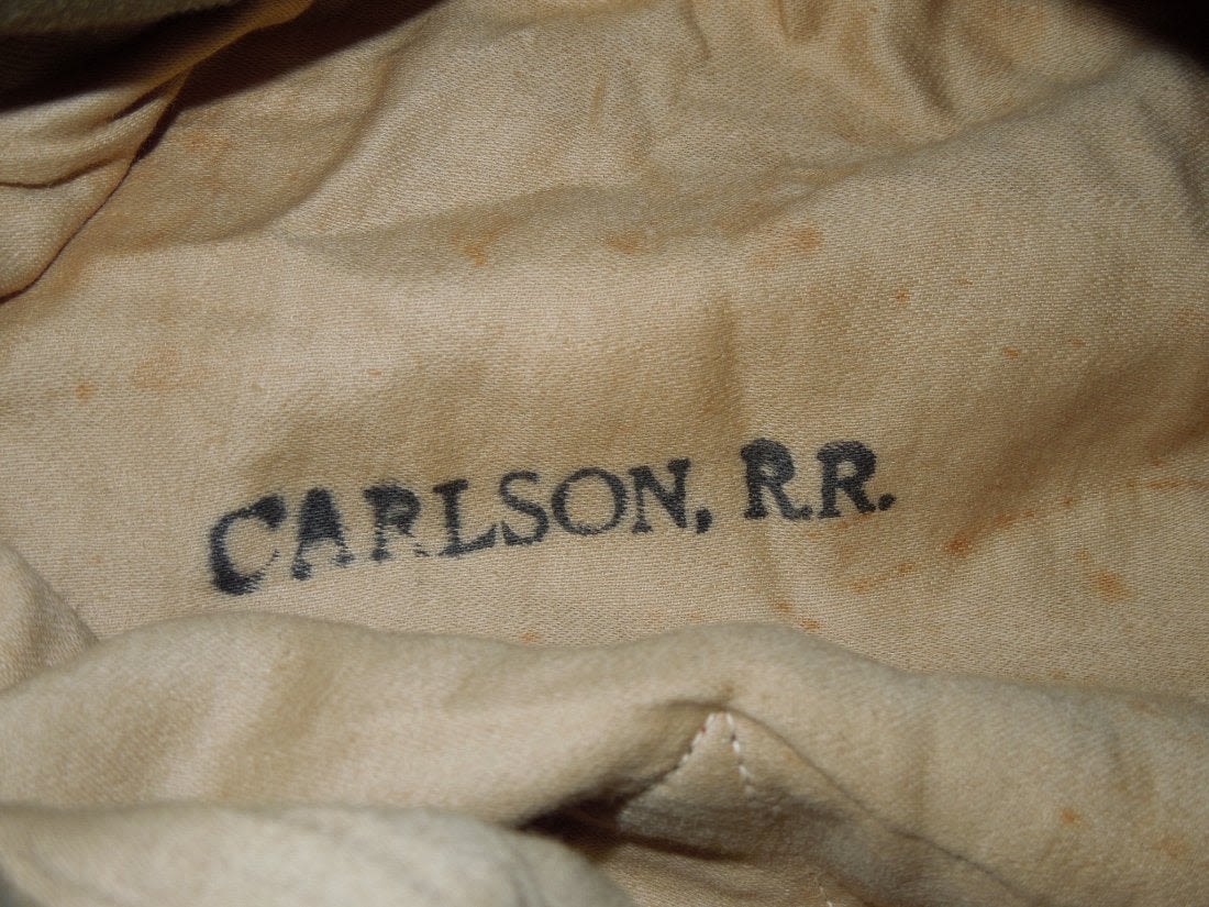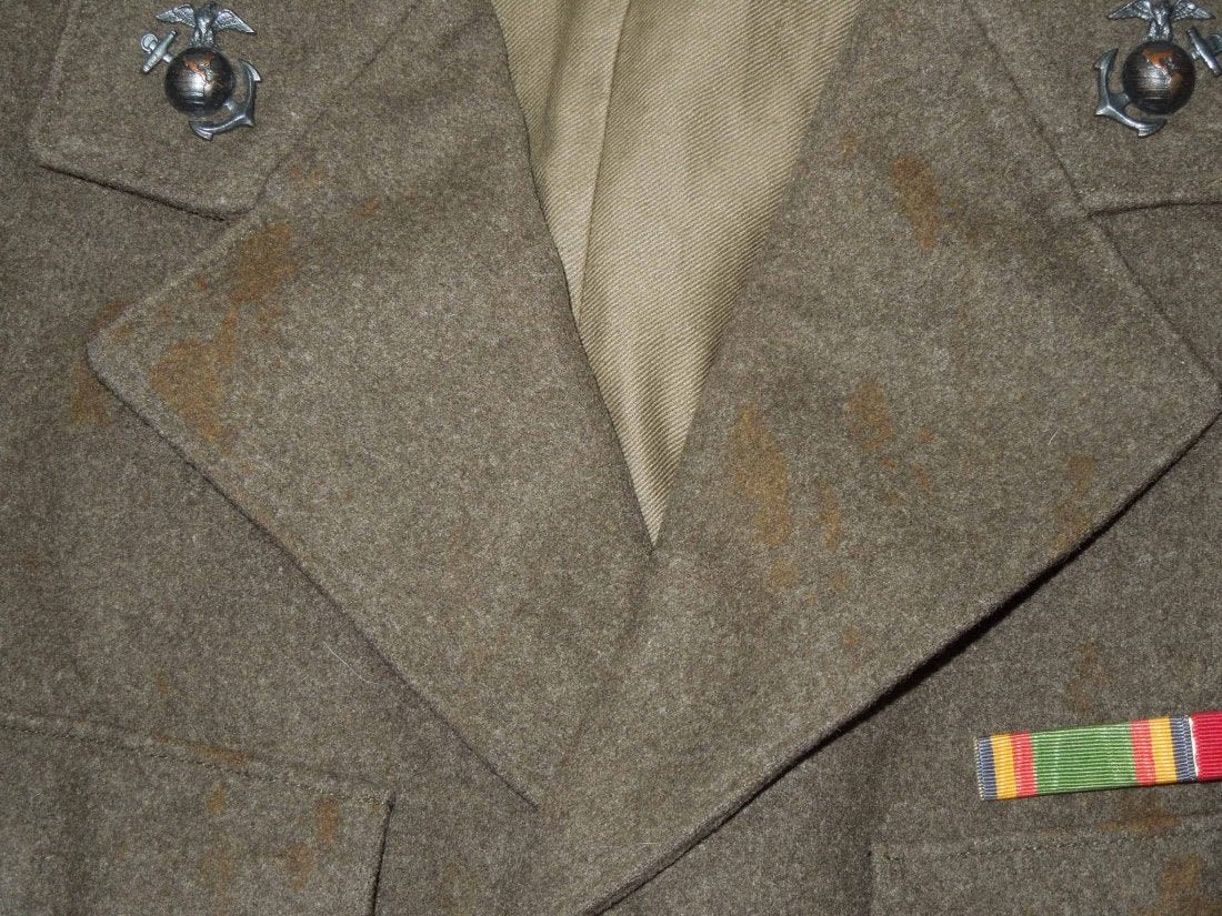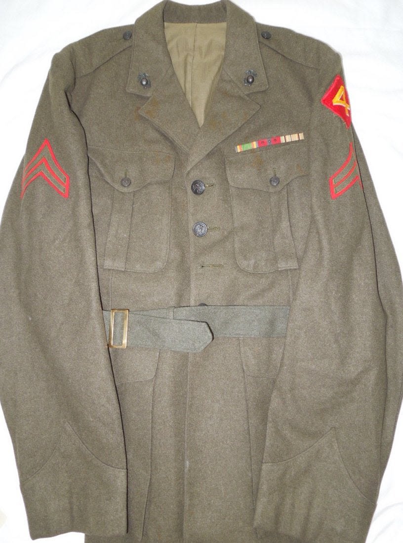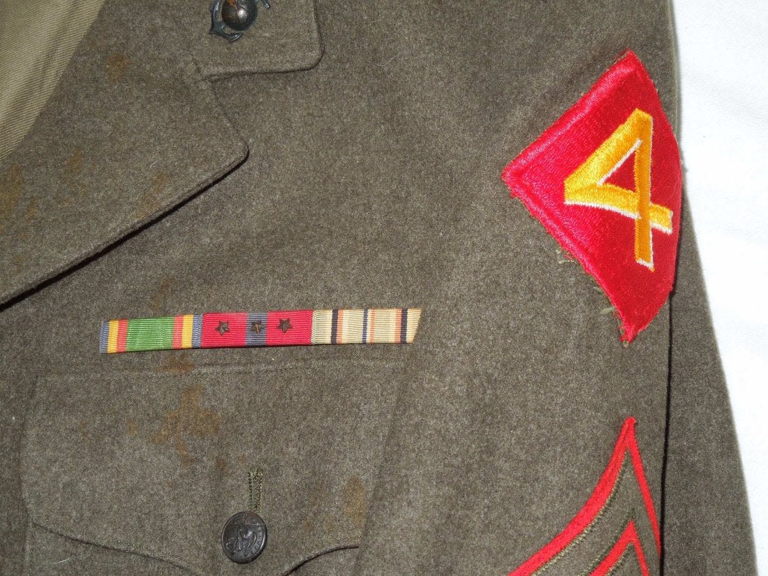 WWII uniform jacket named to R.R. Carlson with a hand sewn 4th Marine Division patch, post war separately named belt, a set of 50s era thin crimp back ribbons. This was probably a put together piece. Some moth holes, but it does have rust stains throughout.