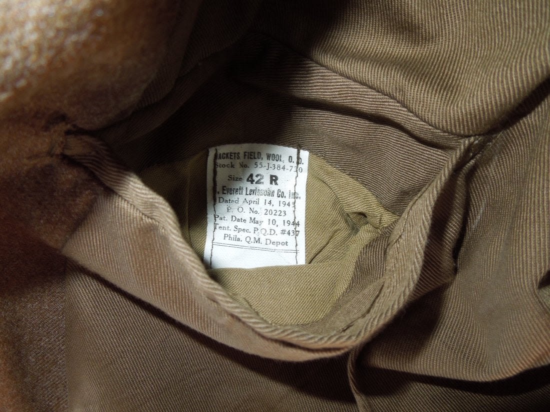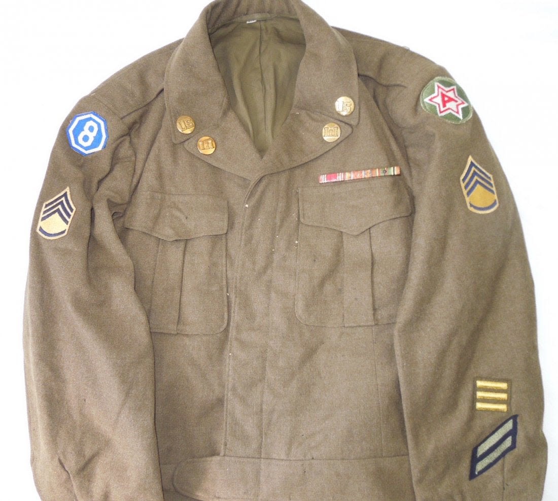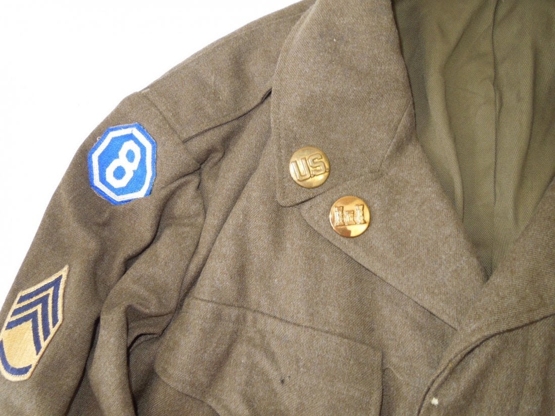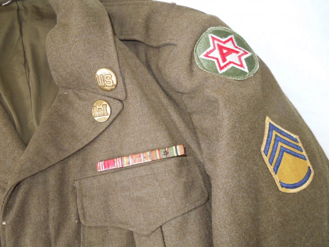WWII Occupation era Sixth Army / 8th Corps patched Ike jacket with US and Engineer collar insignia in the late 1940’s double placement arrangement, ribbons, and patches. It is a small size and has a lot of moth bites to the front. Jacket is in poor-fair condition overall.