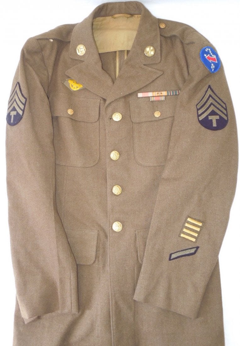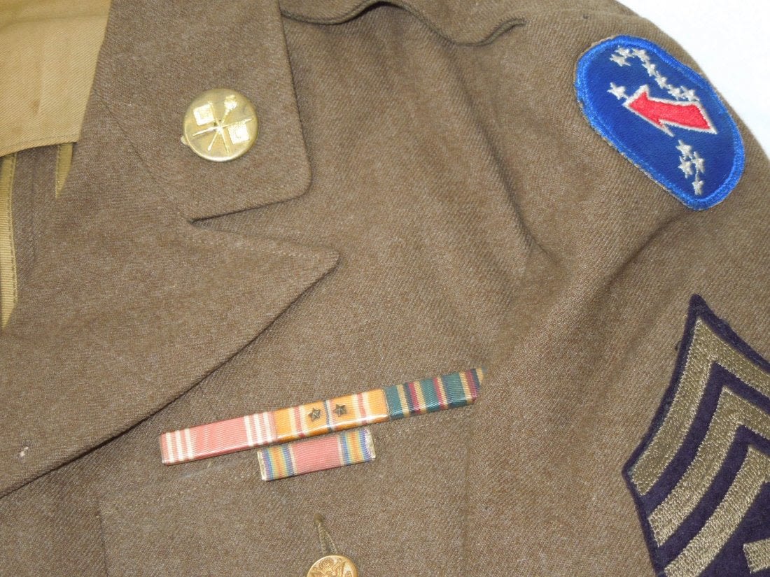 WWII Southwest Pacific patched uniform jacket with Sergeant rank, signal corps collar brass, ribbons, and patches as shown. Good condition overall.