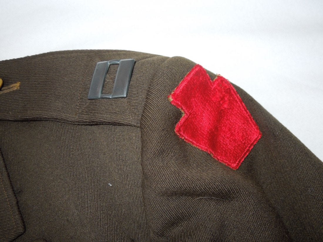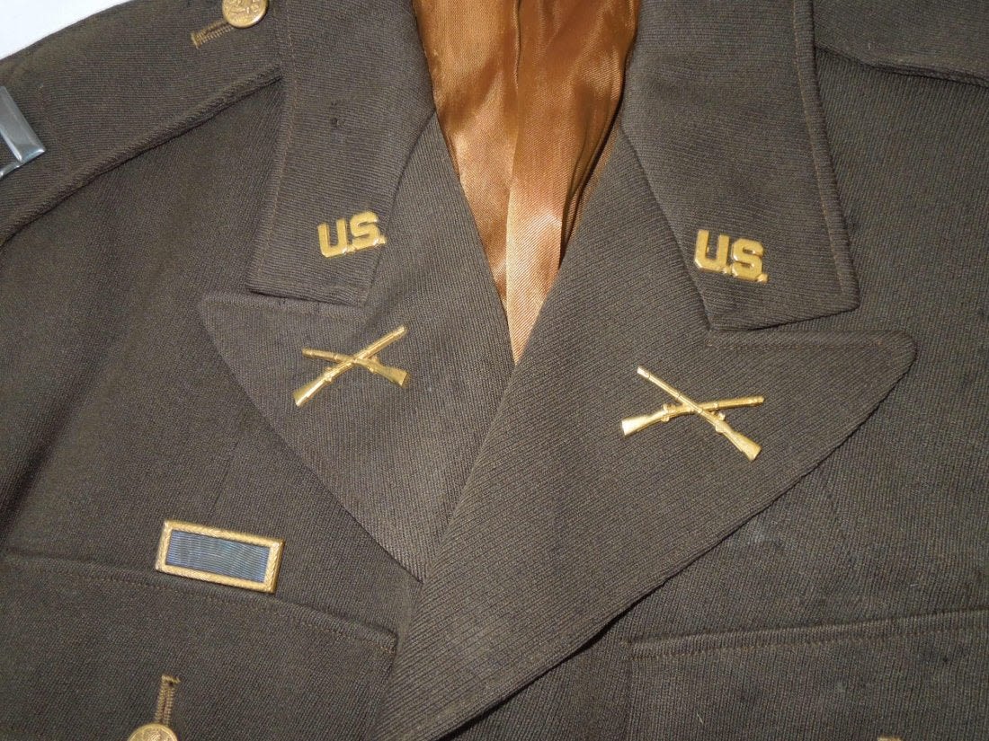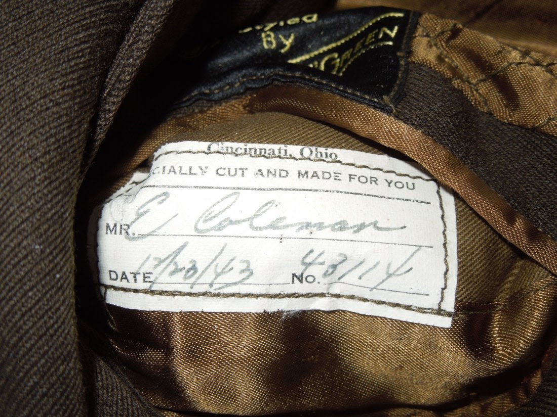 WWII named to E. E. Coleman 1943 dated uniform jacket with Infantry insignia, sterling FIRMIN LONDON made British in back Captain bars, 28th Infantry Division patch, bullion overseas bars. There is a lot of mothing to the coat.