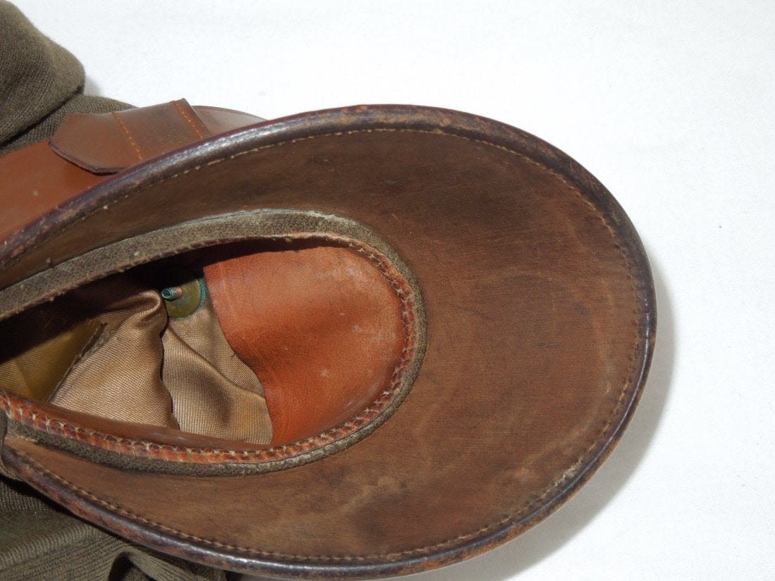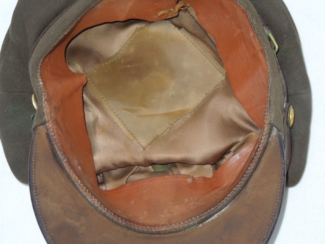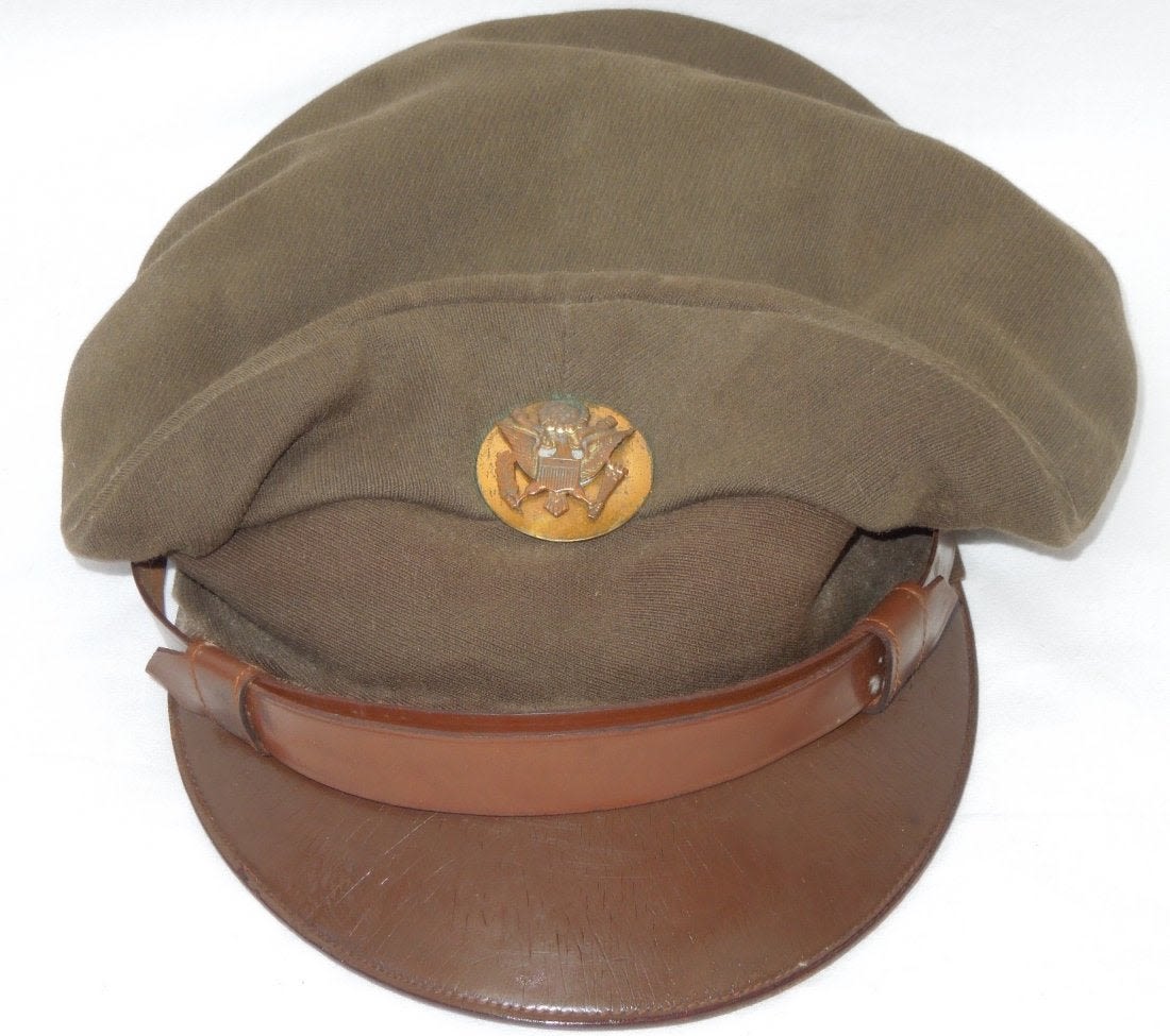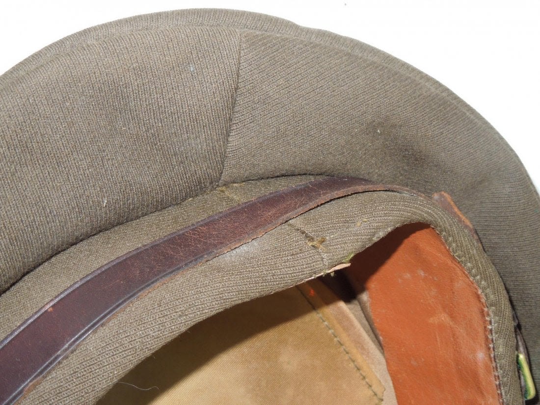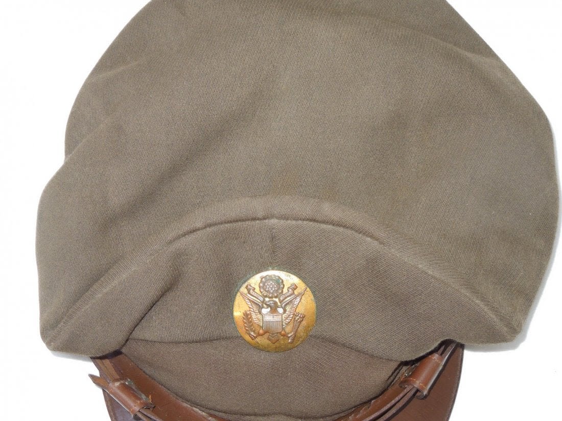 WWII Crusher Visor Enlisted Cap US Army AAF. WWII Army Air Force Enlisted Man Combat Crusher. Dark olive drab elastique. Early insignia. Backstrap. Size is not present. Very good condition for its age. (II B116)