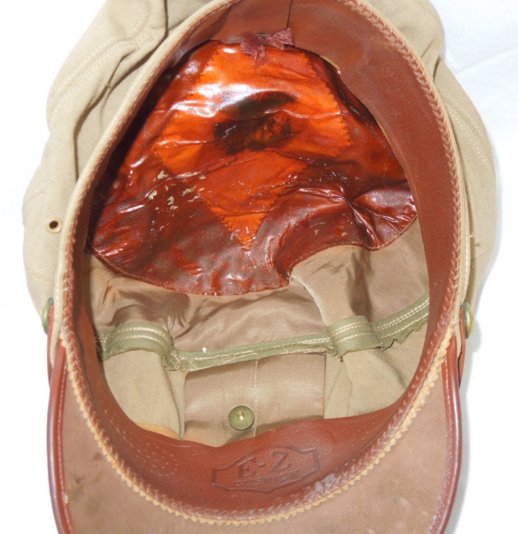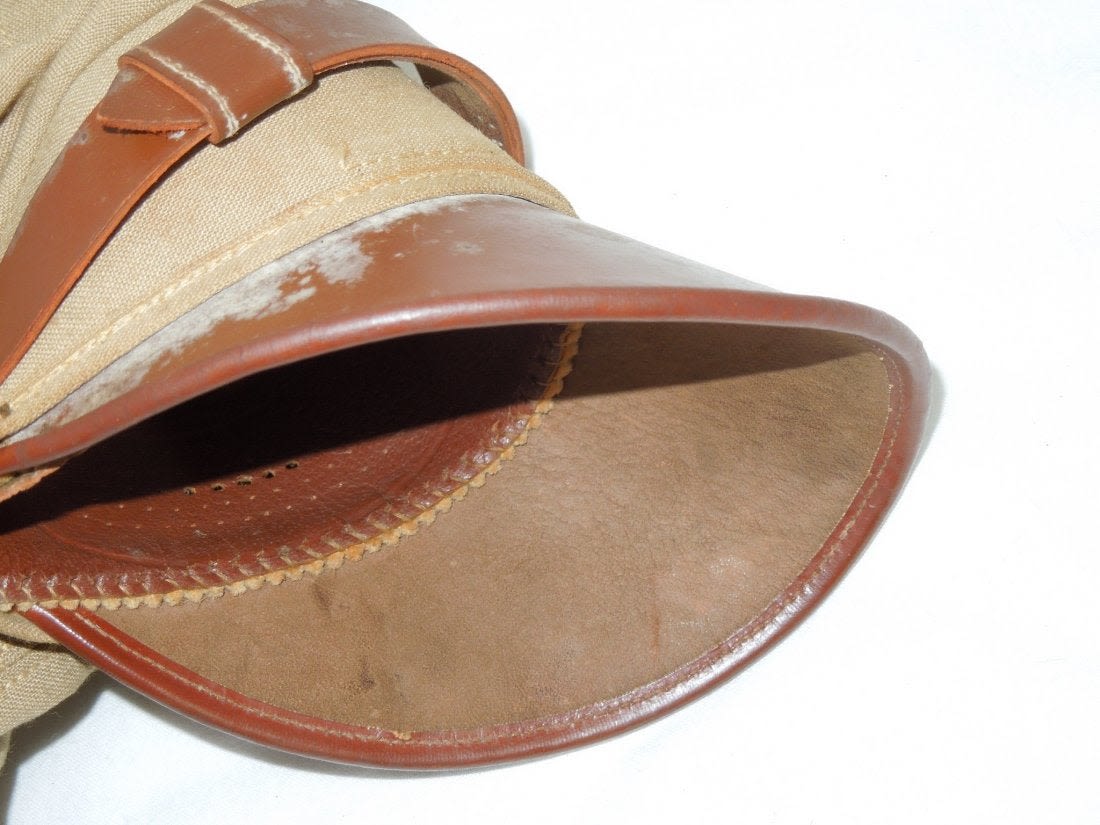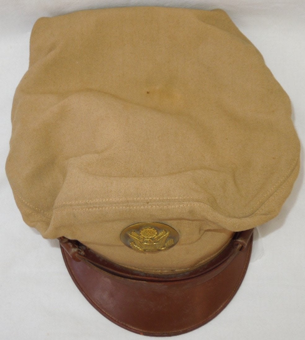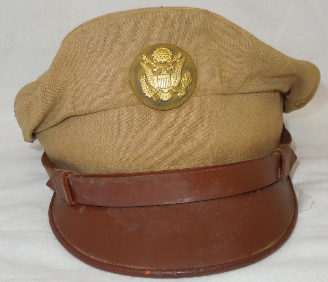 WWII Army Enlisted Man Tan Summer / Tropical Crusher Visor with early insignia. Size is 7.5 inches. E-Z Cushion on leather sweat band. Very nice condition for its age. (II B 115)