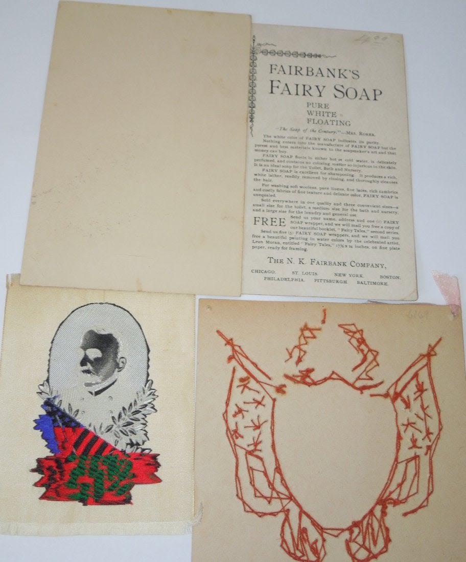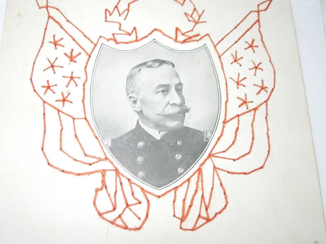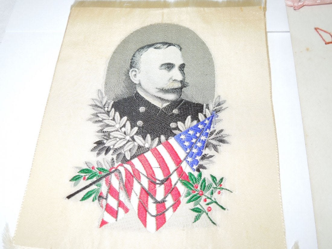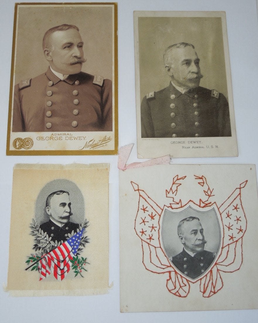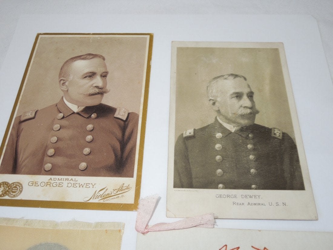Spanish American War SAW Admiral Dewey Cabinet & Ribbon Photo Cards. You will receive the following 4 cards. Admiral George Dewey Nielens Studio, Cincinnati, Ohio. Approximate size is 4.25 x 6.5 inches. Good condition. George Dewey, Rear Admiral U.S.N. Fairbanks Fairy Soap, G.H. Buek & CO. NY LITH. Size is 4 x 6.25 inches. Good condition with a dog ear corner on the bottom left side. Admiral Dewey photo card with hand stitched patriotic emblem around the photo. Size is 5.25 x 5.25 inches. Condition shows wear. The last item is an Admiral Dewey colored ribbon and United States flag. Size is 3.5 x 4.5 inches. This item is in excellent condition