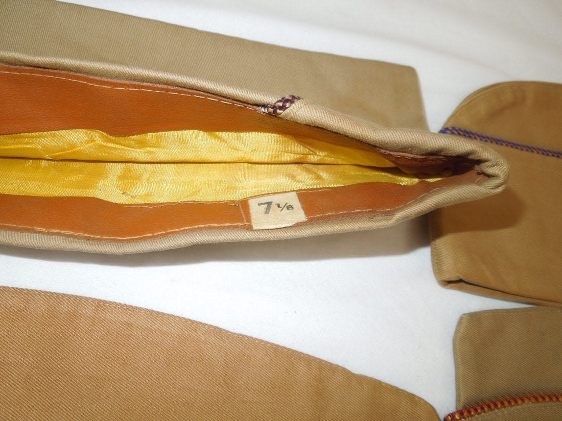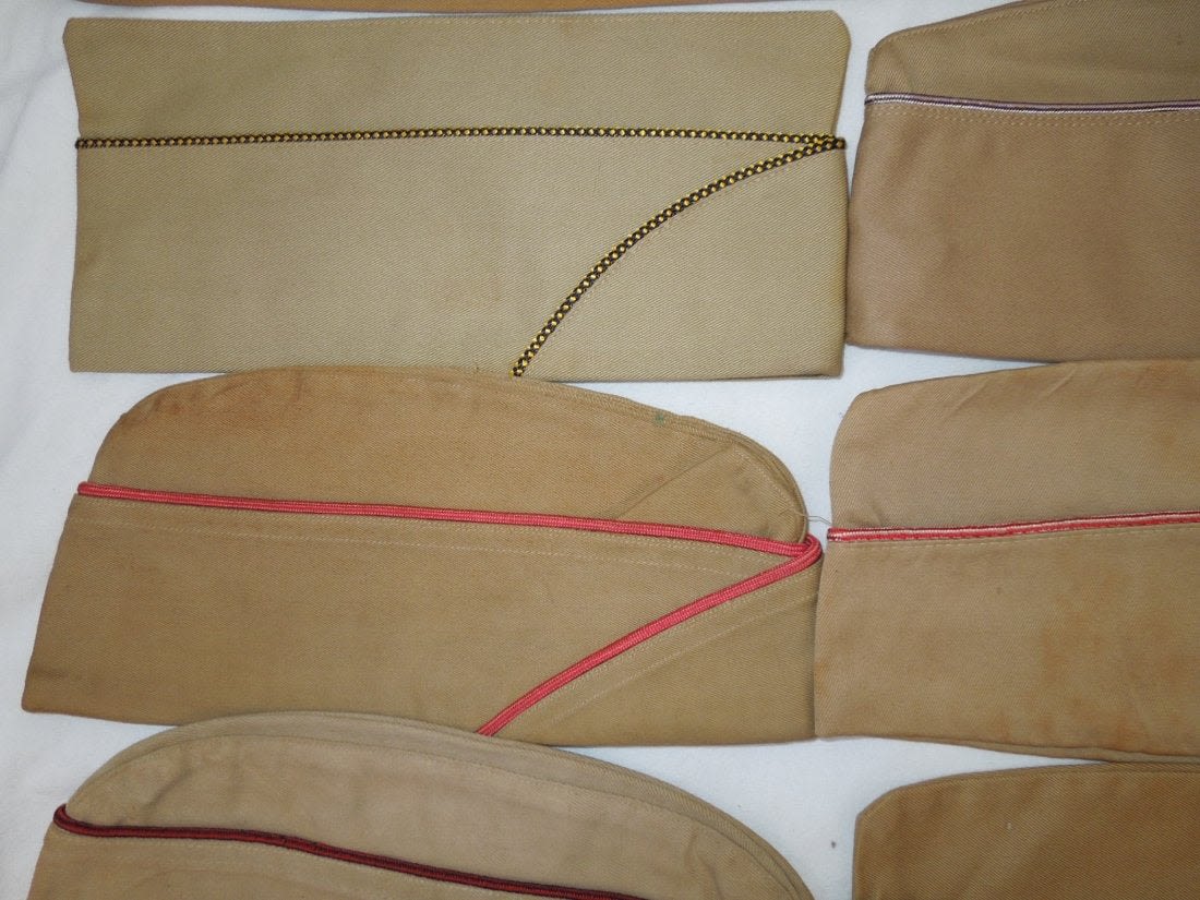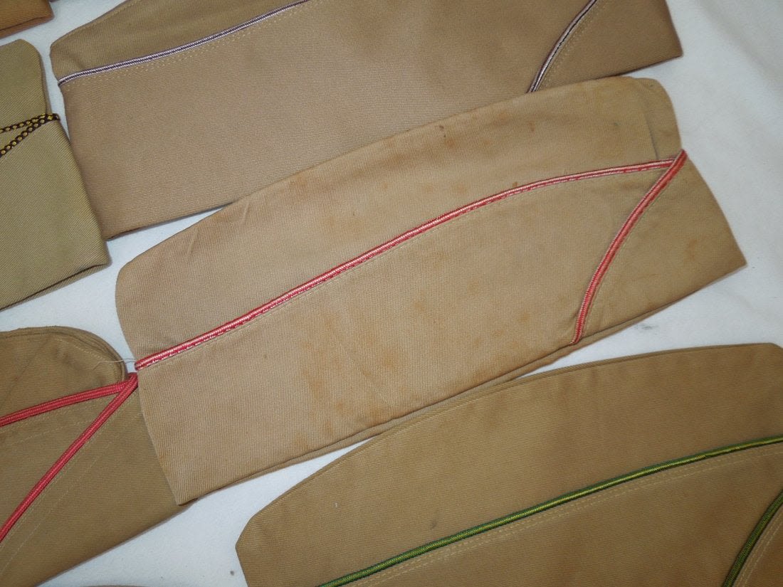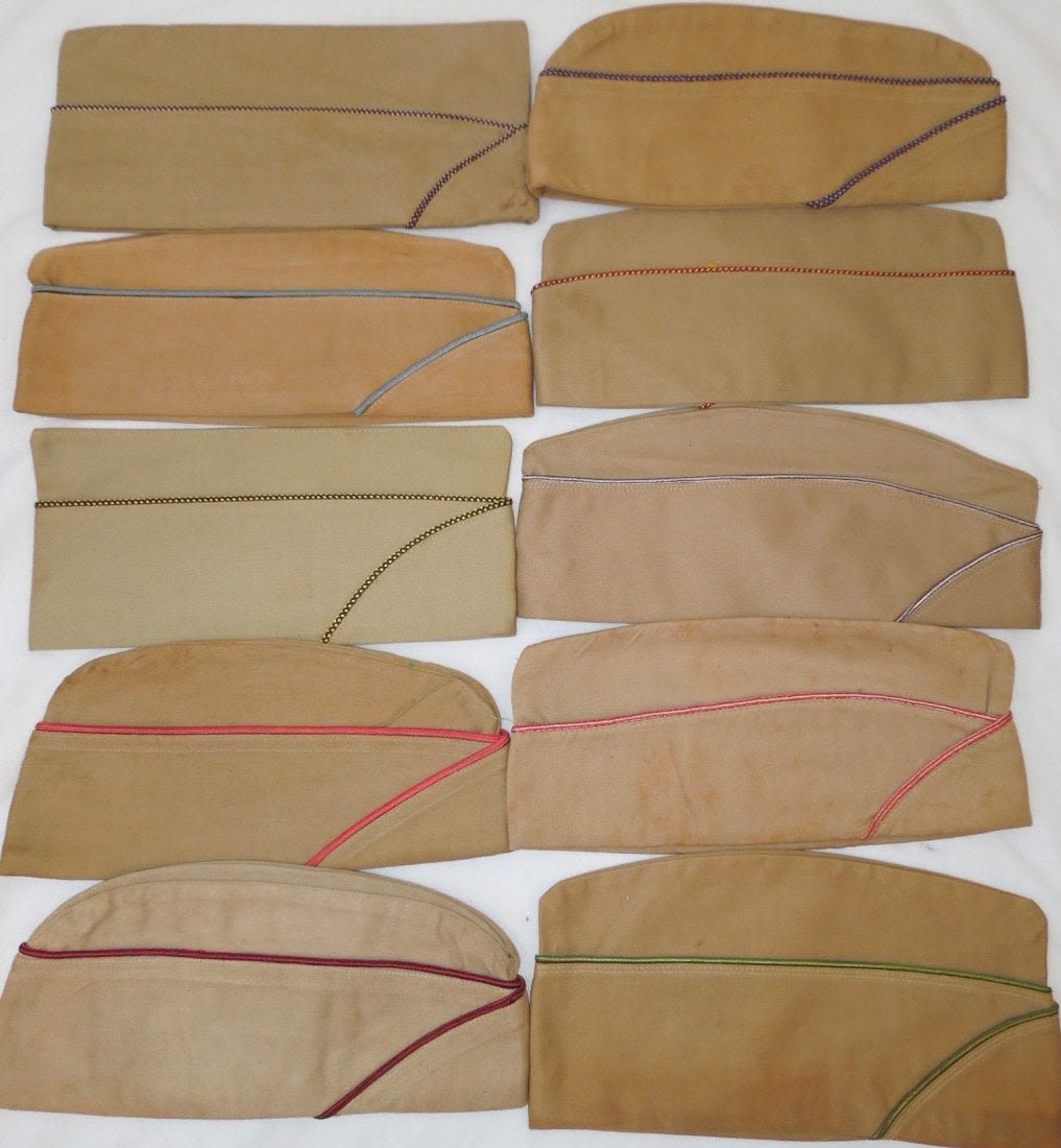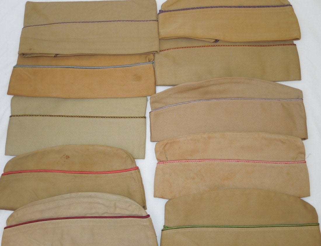 WWII US Army Garrison Overseas hats. You will receive the following 10 caps. 1. WWII US Army tan Medical Corps with maroon and white Variegated piping. Squared corner. Leather sweat band. Size is 7 1/8 inches. Condition is good with some sort of stain on the side. 2. WWII US Army Air Corp tan with orange and blue Variegated piping. Rounded corner configuration. Named with serial number. Named to J. Buechler. Size is 7 1/8 inches. Condition is excellent. 3. WWII US Army tan Unknown Service Branch with pink piping. Rounded corner configuration. Serial number inside cap. Very good condition with a stain on the cap. No size present. 4. WWII US Army tan Unknown Service branch yellow and dark blue variegated piping. Size is 6 3/4 inches. Excellent condition. 5. WWII US Army tan Specialist Reserve. variegated piping. Leather sweatband. Size is 7 1/8 inches. Excellent condition. 6. WWII US Army tan Infantry with blue piping. Serial number. Named faint stamp with serial number. No size present. Condition is very good. 7. WWII US Army tan Military Police (?) with green and yellow horizontal piping. Squared corner. No size present. 8. WWII US Army tan Engineers with horizontal red and white piping. Squared corner. Serial number. Silk lining. No size present. Good condition showing wear from age and use. 9. WWII US Army tan Judge Adjutant General Department JAG with horizontal dark blue and red piping. Rounded corner configuration. Washed out Quartermaster tag. Good condition showing wear from age and use. No size present. 10. WWII US Army tan Medical Corps with maroon and white horizontal piping. Size is 7 1/4 inches. Excellent condition.(II C 203, 204, 205, 216, 220, 301,302, 303, Med, Unknown)