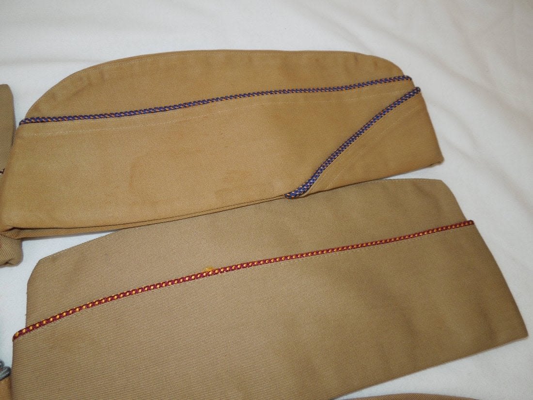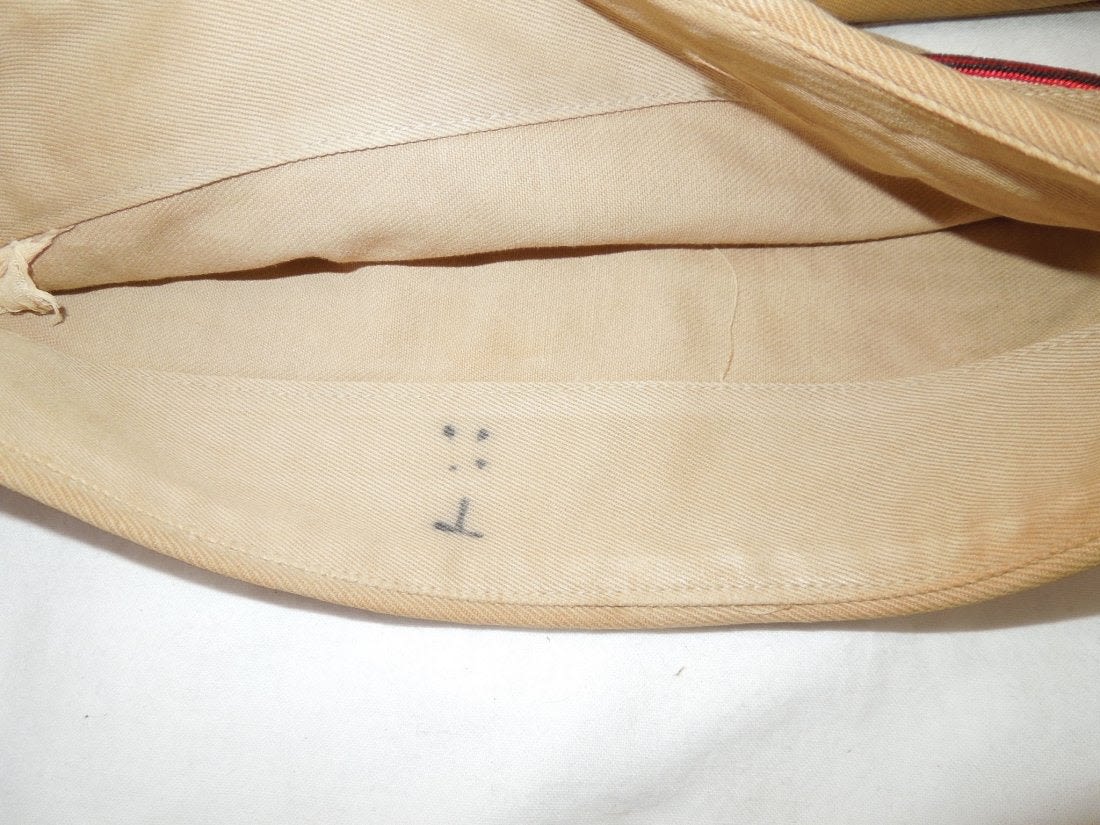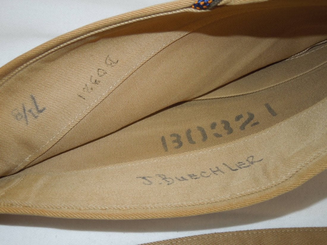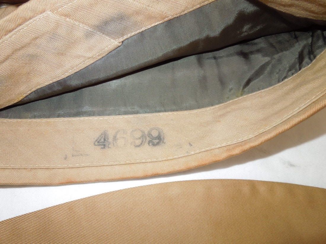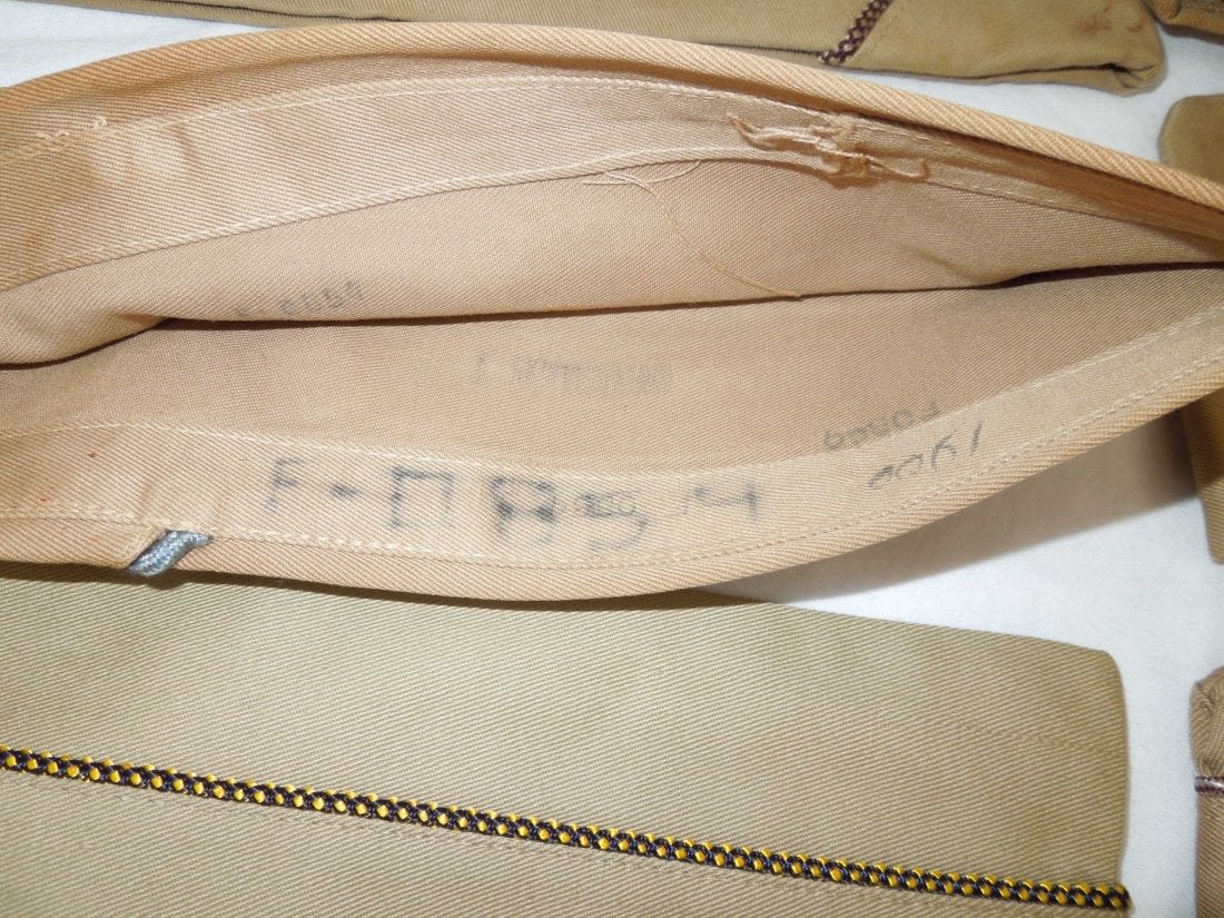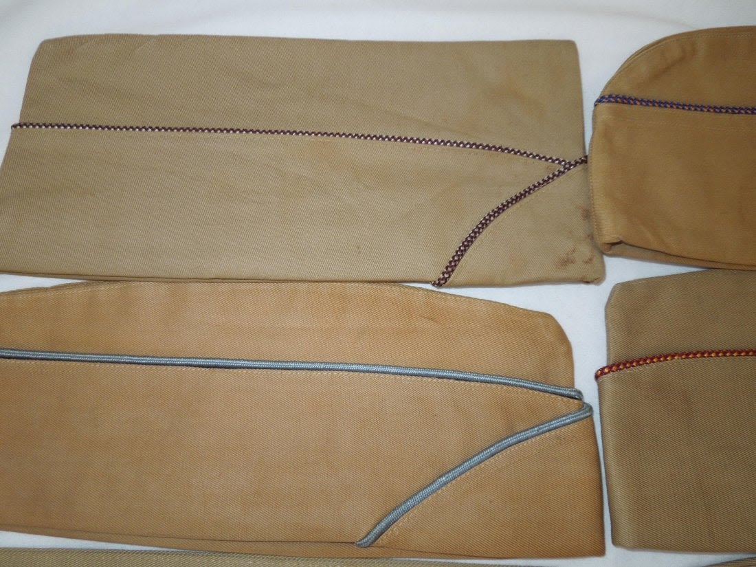 WWII US Army Garrison Overseas hats. You will receive the following 10 caps. 1. WWII US Army tan Medical Corps with maroon and white Variegated piping. Squared corner. Leather sweat band. Size is 7 1/8 inches. Condition is good with some sort of stain on the side. 2. WWII US Army Air Corp tan with orange and blue Variegated piping. Rounded corner configuration. Named with serial number. Named to J. Buechler. Size is 7 1/8 inches. Condition is excellent. 3. WWII US Army tan Unknown Service Branch with pink piping. Rounded corner configuration. Serial number inside cap. Very good condition with a stain on the cap. No size present. 4. WWII US Army tan Unknown Service branch yellow and dark blue variegated piping. Size is 6 3/4 inches. Excellent condition. 5. WWII US Army tan Specialist Reserve. variegated piping. Leather sweatband. Size is 7 1/8 inches. Excellent condition. 6. WWII US Army tan Infantry with blue piping. Serial number. Named faint stamp with serial number. No size present. Condition is very good. 7. WWII US Army tan Military Police (?) with green and yellow horizontal piping. Squared corner. No size present. 8. WWII US Army tan Engineers with horizontal red and white piping. Squared corner. Serial number. Silk lining. No size present. Good condition showing wear from age and use. 9. WWII US Army tan Judge Adjutant General Department JAG with horizontal dark blue and red piping. Rounded corner configuration. Washed out Quartermaster tag. Good condition showing wear from age and use. No size present. 10. WWII US Army tan Medical Corps with maroon and white horizontal piping. Size is 7 1/4 inches. Excellent condition.(II C 203, 204, 205, 216, 220, 301,302, 303, Med, Unknown)