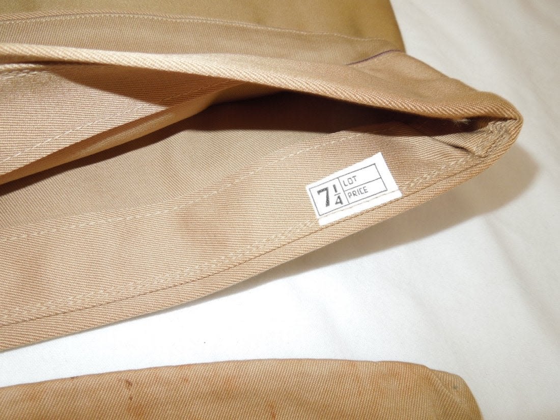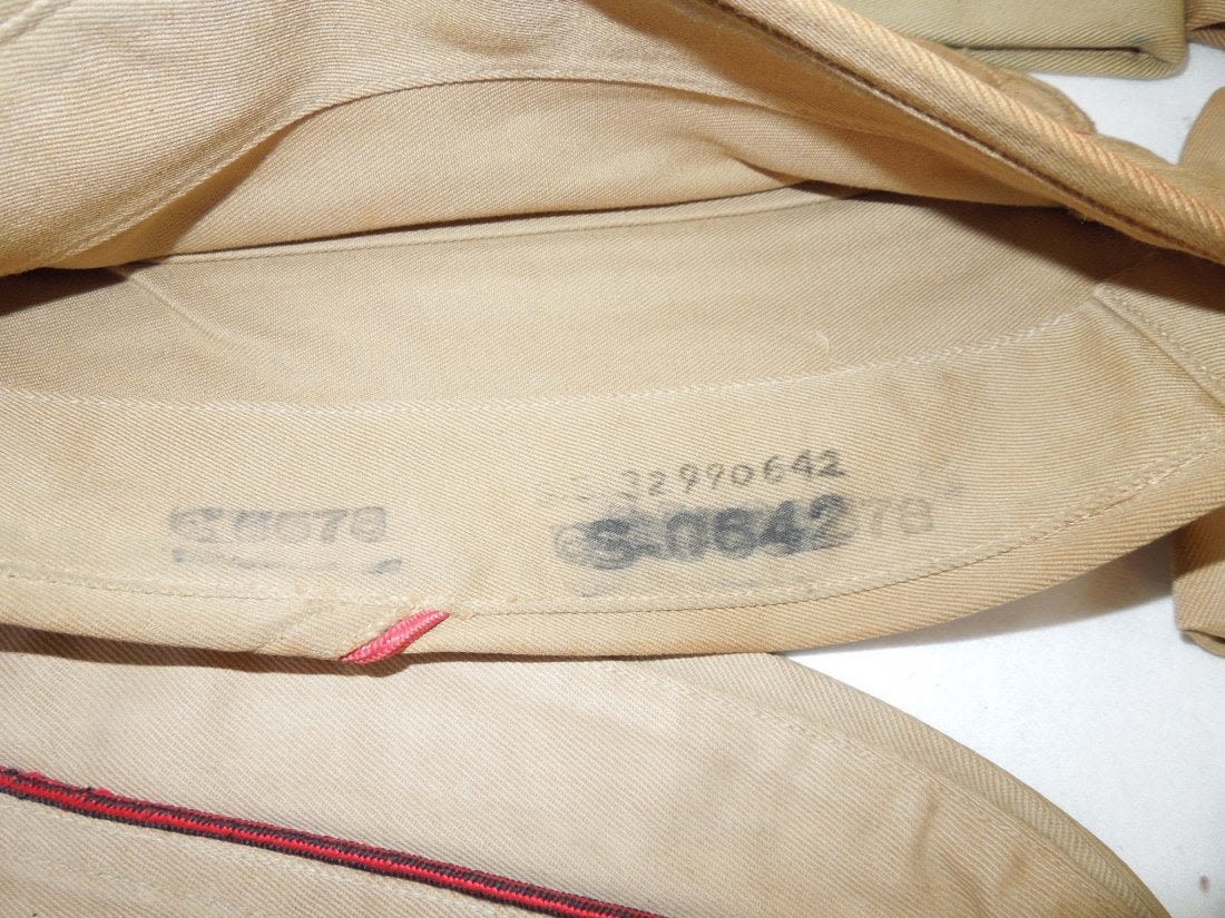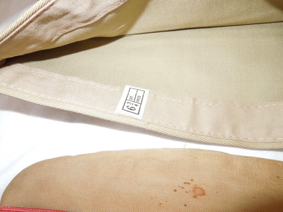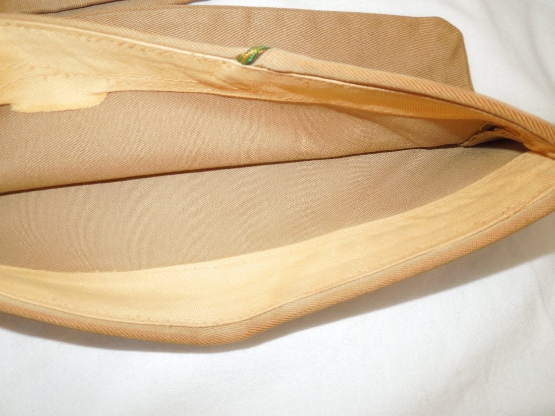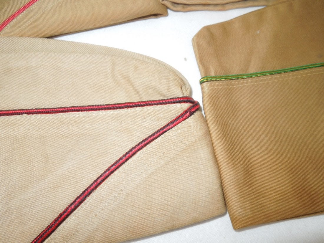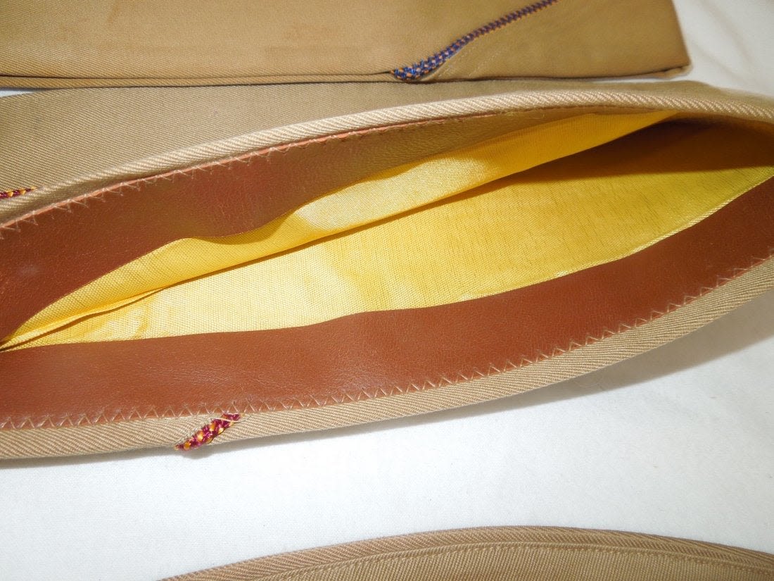 WWII US Army Garrison Overseas hats. You will receive the following 10 caps. 1. WWII US Army tan Medical Corps with maroon and white Variegated piping. Squared corner. Leather sweat band. Size is 7 1/8 inches. Condition is good with some sort of stain on the side. 2. WWII US Army Air Corp tan with orange and blue Variegated piping. Rounded corner configuration. Named with serial number. Named to J. Buechler. Size is 7 1/8 inches. Condition is excellent. 3. WWII US Army tan Unknown Service Branch with pink piping. Rounded corner configuration. Serial number inside cap. Very good condition with a stain on the cap. No size present. 4. WWII US Army tan Unknown Service branch yellow and dark blue variegated piping. Size is 6 3/4 inches. Excellent condition. 5. WWII US Army tan Specialist Reserve. variegated piping. Leather sweatband. Size is 7 1/8 inches. Excellent condition. 6. WWII US Army tan Infantry with blue piping. Serial number. Named faint stamp with serial number. No size present. Condition is very good. 7. WWII US Army tan Military Police (?) with green and yellow horizontal piping. Squared corner. No size present. 8. WWII US Army tan Engineers with horizontal red and white piping. Squared corner. Serial number. Silk lining. No size present. Good condition showing wear from age and use. 9. WWII US Army tan Judge Adjutant General Department JAG with horizontal dark blue and red piping. Rounded corner configuration. Washed out Quartermaster tag. Good condition showing wear from age and use. No size present. 10. WWII US Army tan Medical Corps with maroon and white horizontal piping. Size is 7 1/4 inches. Excellent condition.(II C 203, 204, 205, 216, 220, 301,302, 303, Med, Unknown)