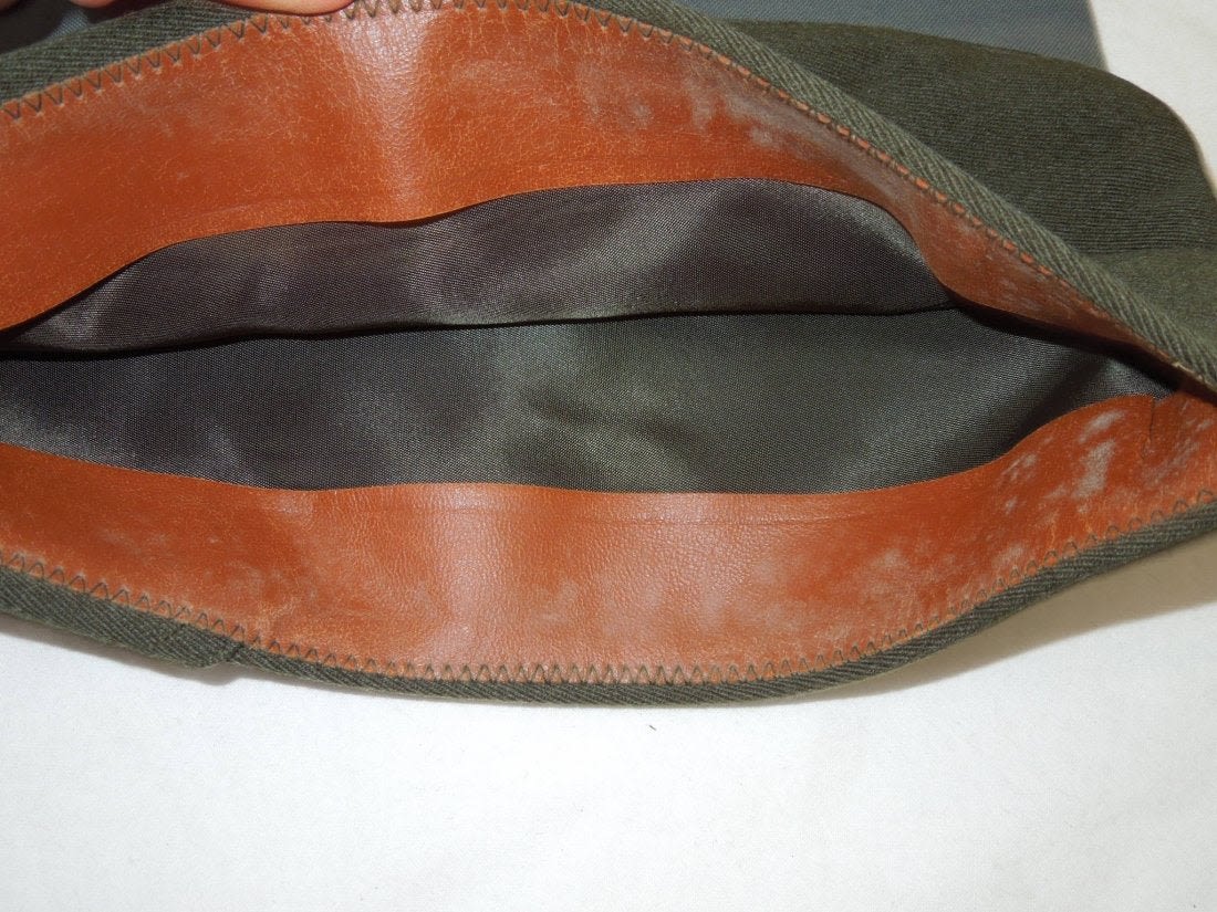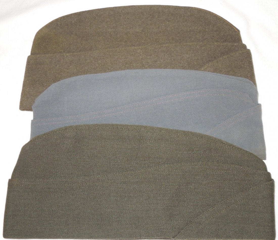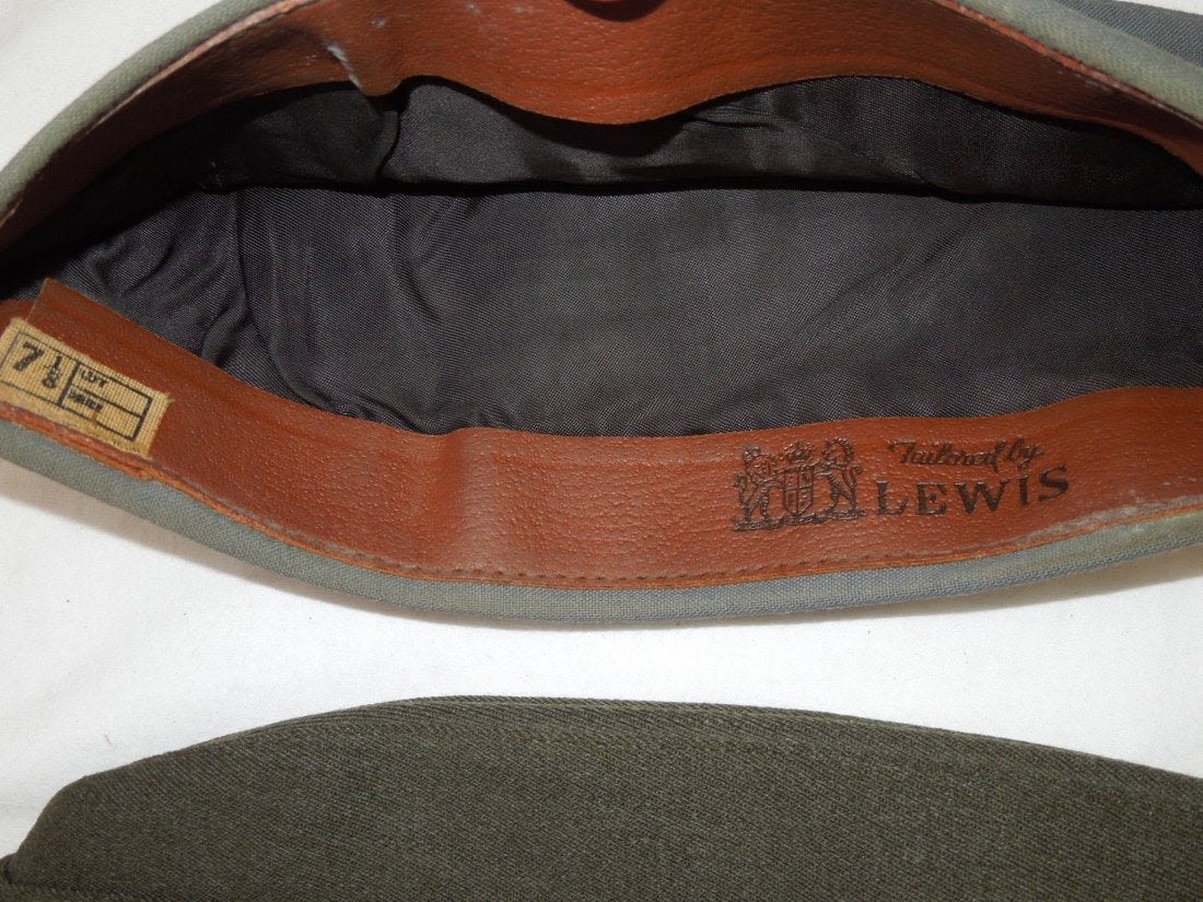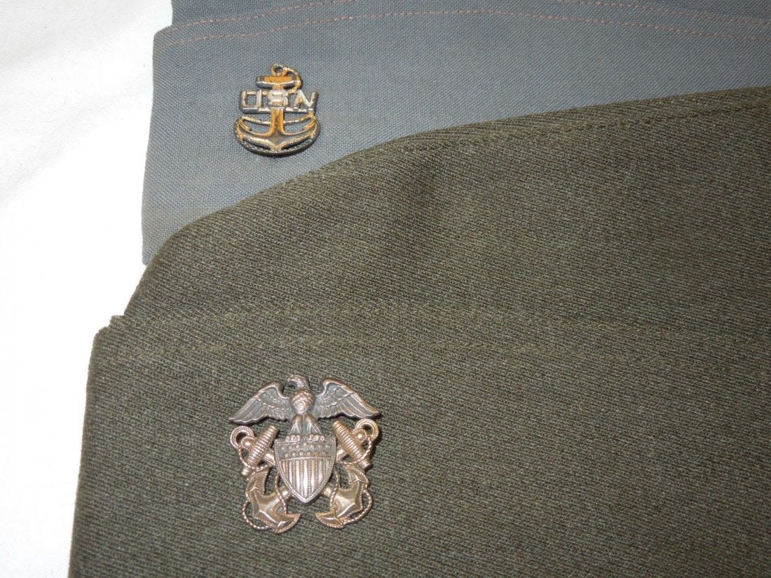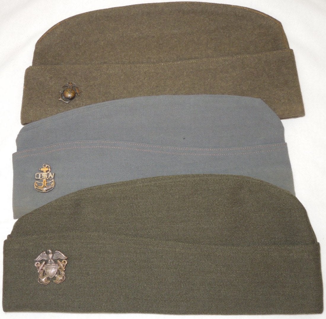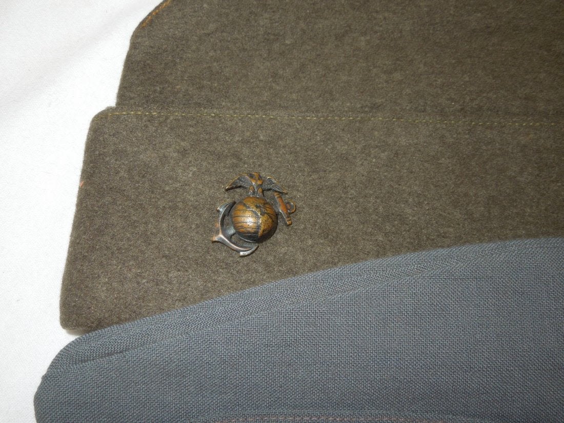 WWII USN Navy and USMC Marine Corps Overseas Caps. You will receive the following 3 overseas caps. 1. USN Navy Aviator Aviation Overseas cap. Forest green gabardine. Leather sweat band. Pin back Sterling insignia. Balfour marked. Size is 7.25 inches. In excellent condition. 2. USN Navy Petty Officer Overseas Cap. Gray issue with Petty Officer insignia. Pin back Petty Officer insignia. Leather sweat band. Manufacturers are Tailored by Lewis. Size 7 1/8 inches. In excellent condition. 3. USMC Marine Corps Enlisted Man / Non-Commissioned Officer Overseas Cap. Forrest green. Eagle, Globe and Anchor EGA screw back insignia. No size present. In excellent condition. (II C 402, 403, 404)