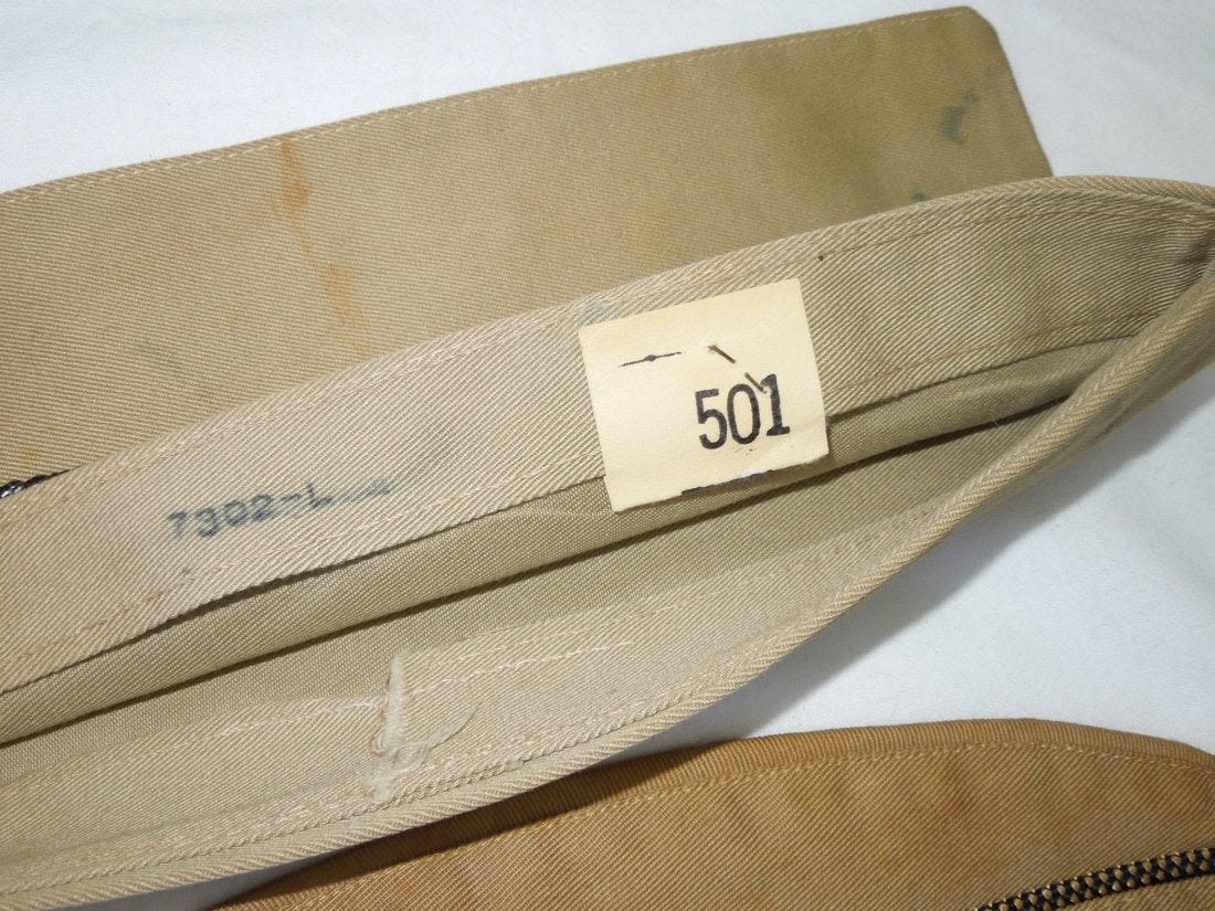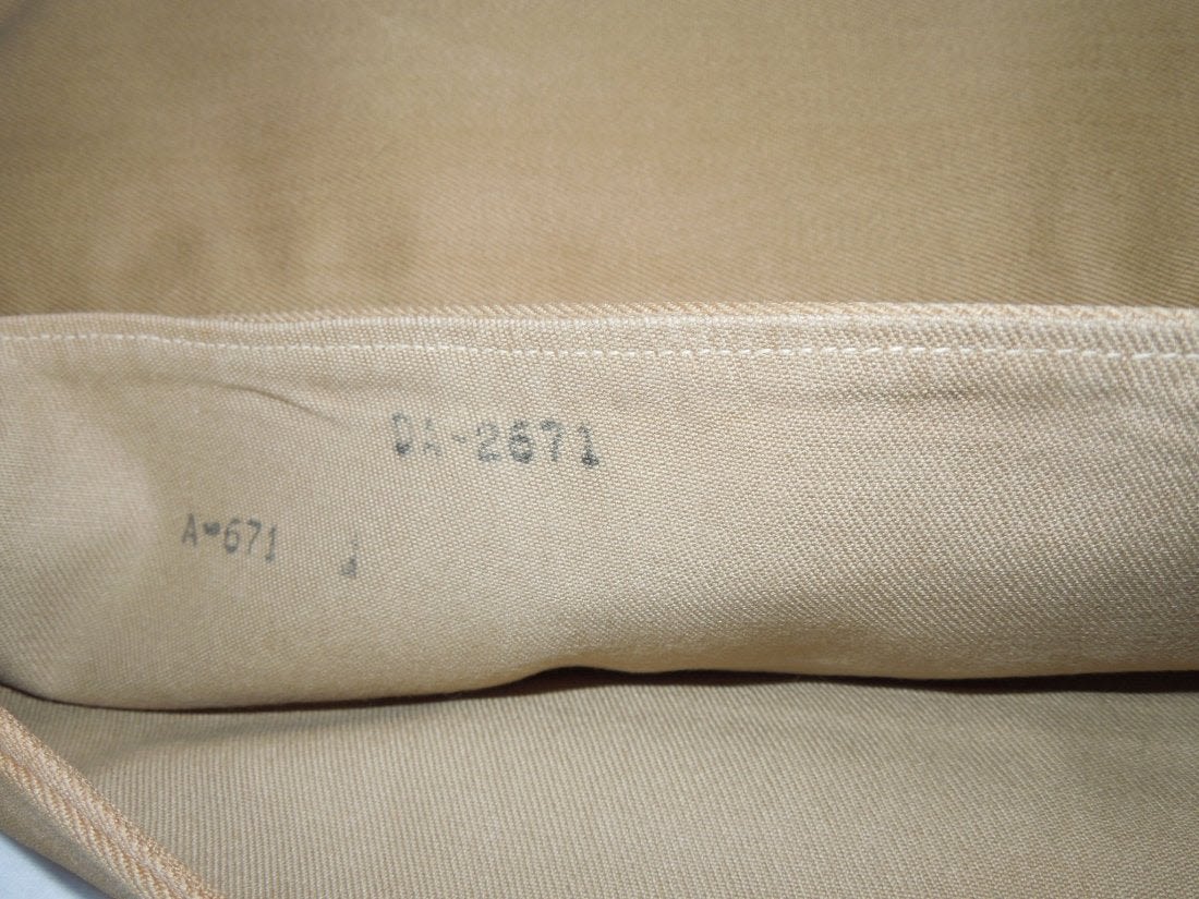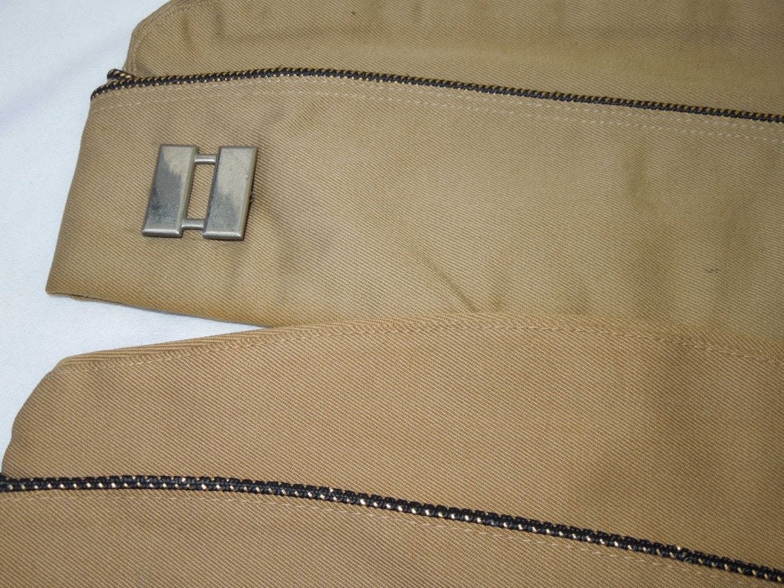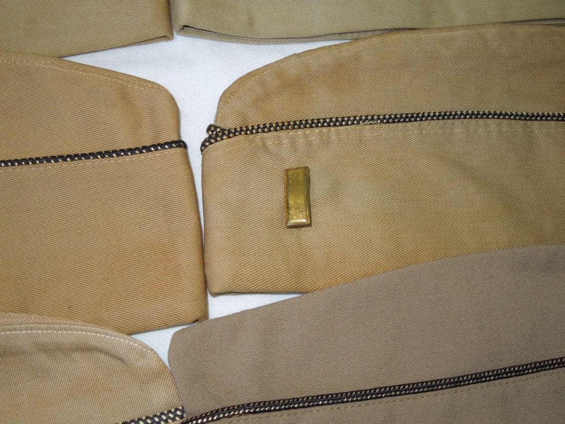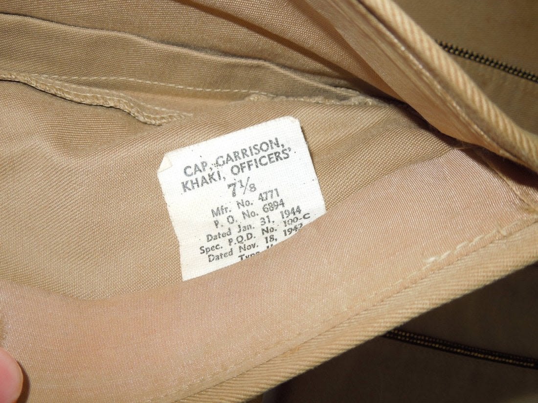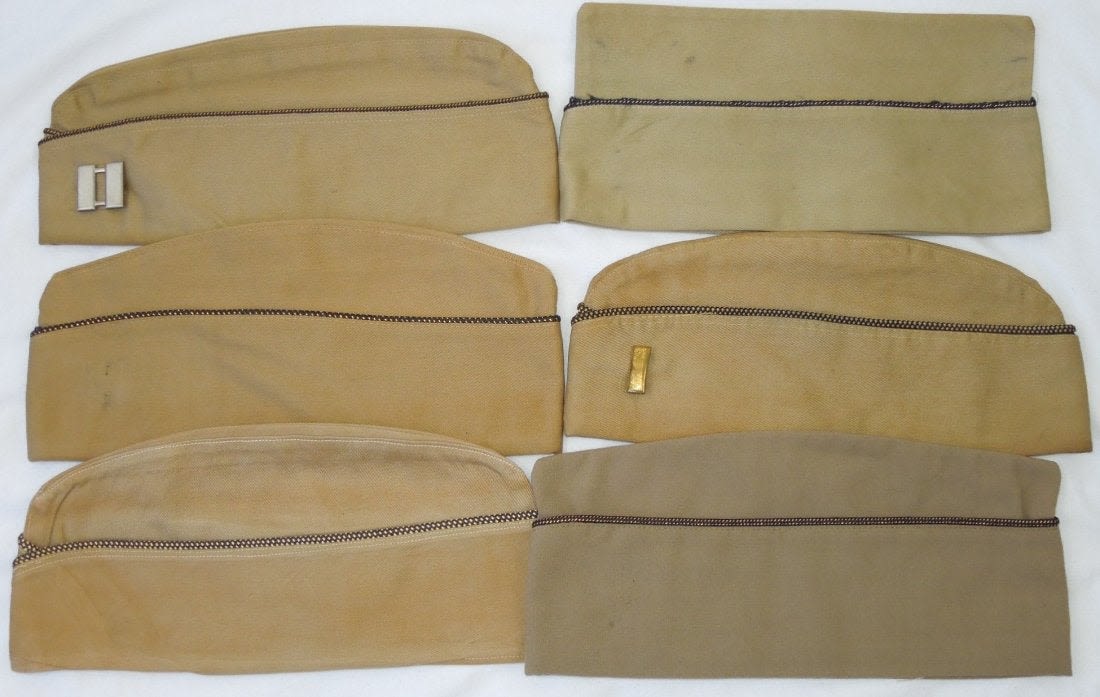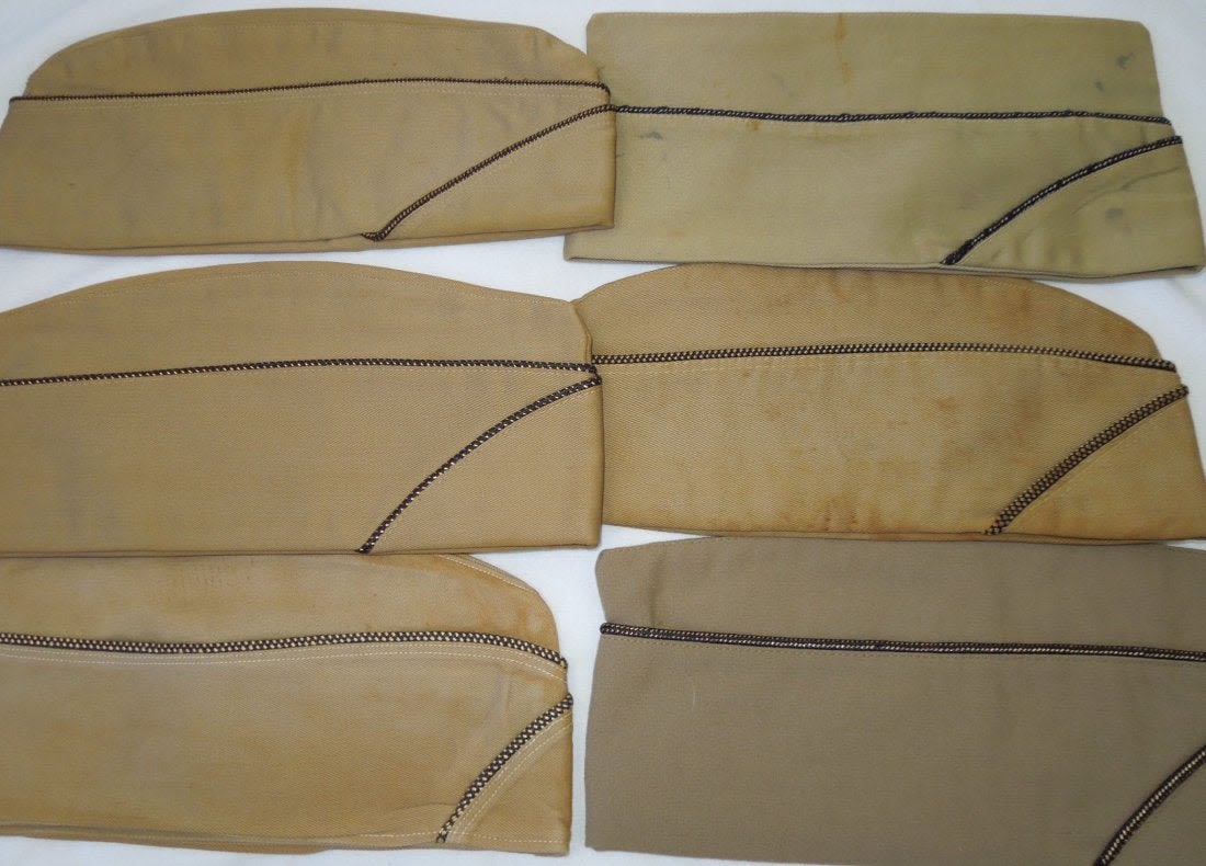 WWII Khaki US Army Officer Garrison Overseas Hats Lot of 6. You will receive the following 6 caps. 1. WWII Khaki US Army Officer Garrison Overseas cap with gold and black piping. Leather sweat band. Name to N. Cooper. Size 7. In very good condition. 2. WWII US Army Officer Wool Garrison Overseas cap with gold and black piping. Squared corner configuration. Leather sweat band. Size is 7 1/8 inches. In excellent condition. 3. WWII Khaki US Army Officer Garrison Overseas Cap with gold and black piping. 2nd Lieutenant insignia. Leather sweat band. Number stamped on the sweat band. Size is 7 1/8 inches. Used condition from wear, use and age. 4. WWII Khaki US Army Officer Garrison Overseas cap with gold and black piping. Captain insignia. 1944 dated. Size is 7 1/8 inches. In very good condition. 5. WWII Khaki US Army Officer Garrison Overseas cap with silver and black piping. Stamped number on the inside of cap. Good condition with marks and stains from age and use. 6. WWII Khaki US Army Officer Garrison Overseas cap with nonmetallic gold and black piping. Stamped numbers and letters on the inside of the cap. Good condition with marks and stains from age and use. (II C 211, 212, 214, 703, 2 unnumbered)