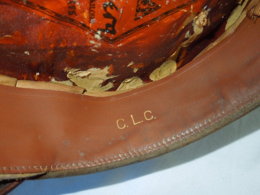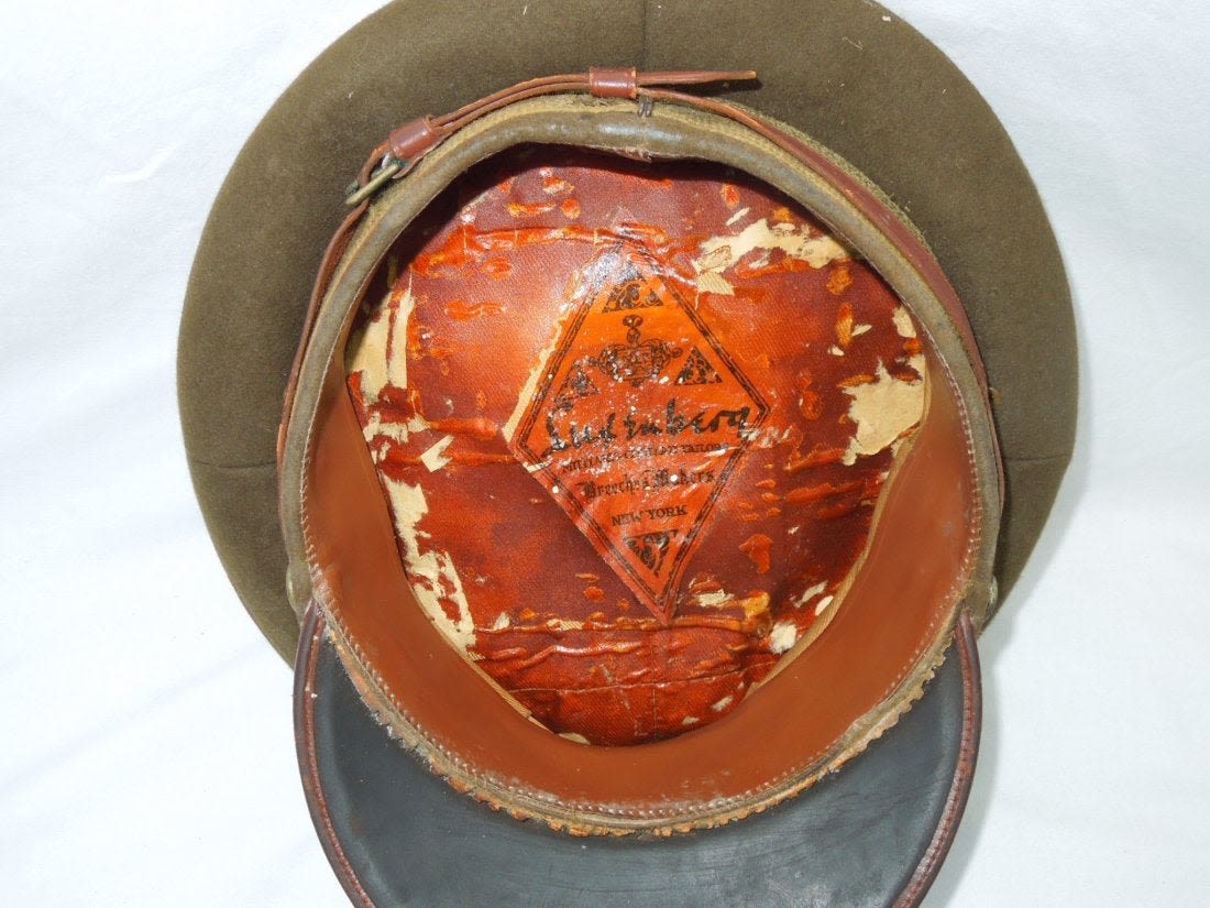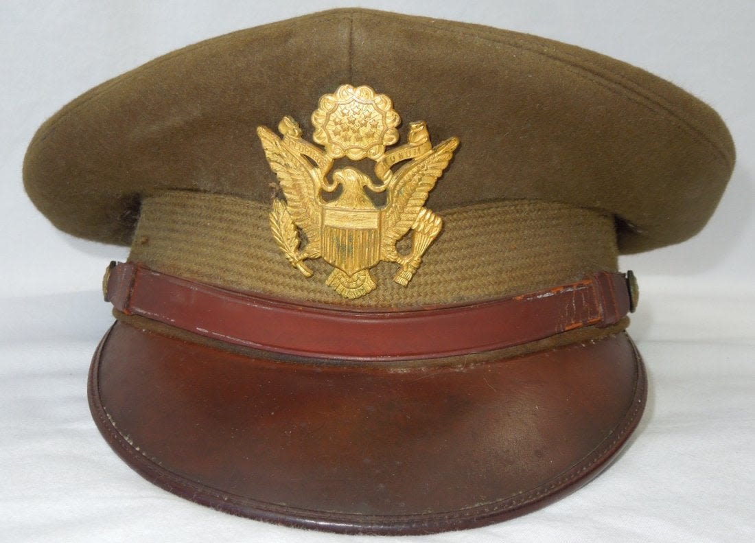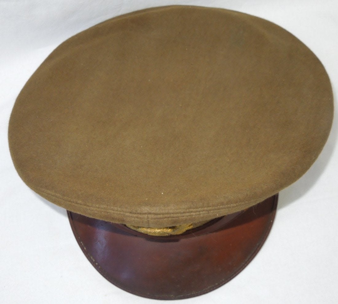 WWII US Army Air Force Officer Visor. Quality wool, brown visor with a strap and back strap. Initial C.L.C. stamped on sweat band. Luxenberg Mfg. made. In excellent condition. (II B 5)