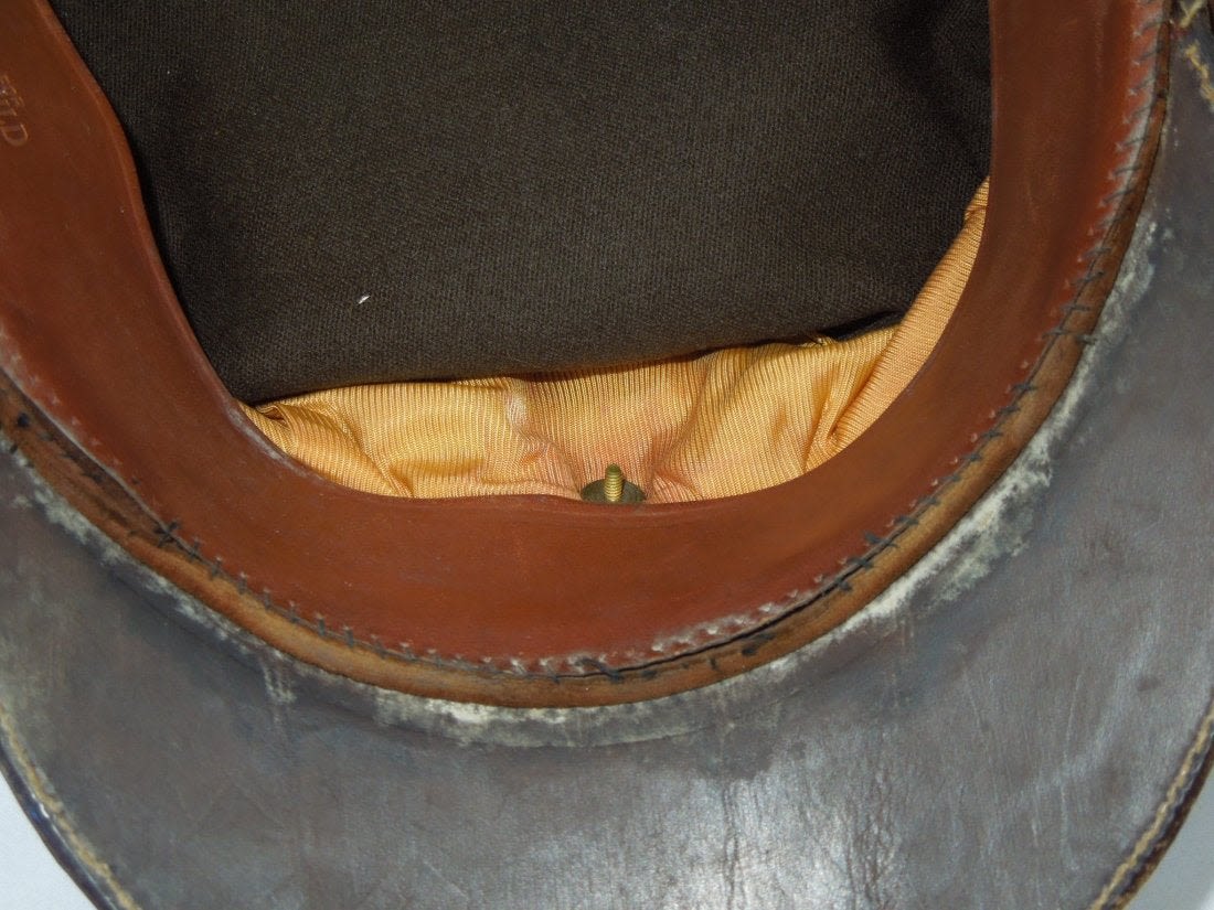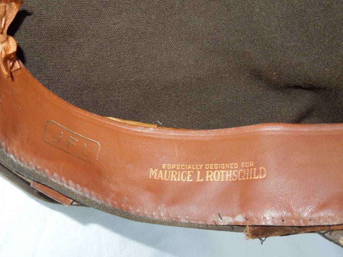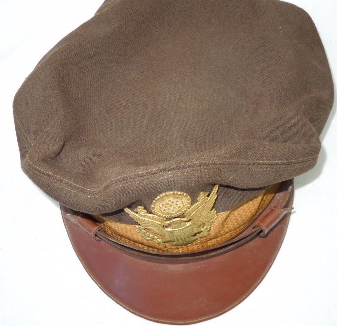 WWII US Army Air Force Crusher Like Visor. English made Visor. Olive Drab. Hop sack material with tan knobby band. Back strap and Jumbo Eagle insignia. Especially designed for Maurice L. Rothschild. There is also the initials JFL. No size given. Excellent condition. (II B 9)