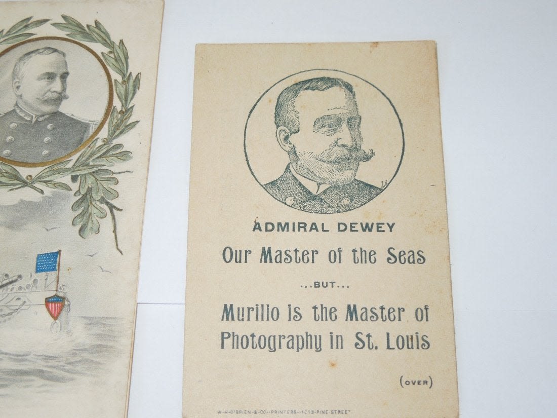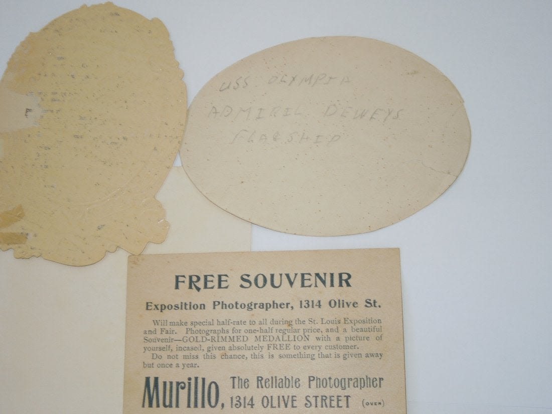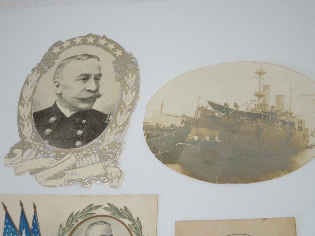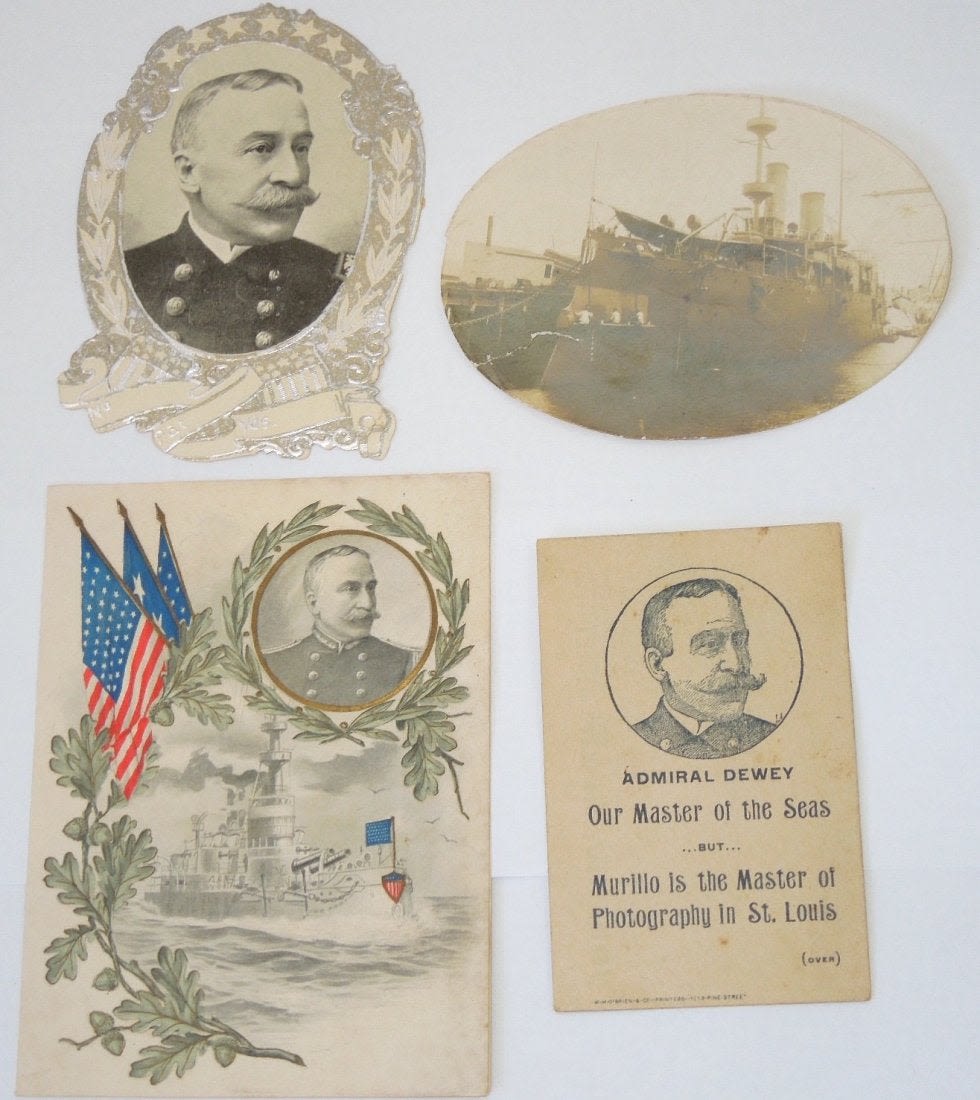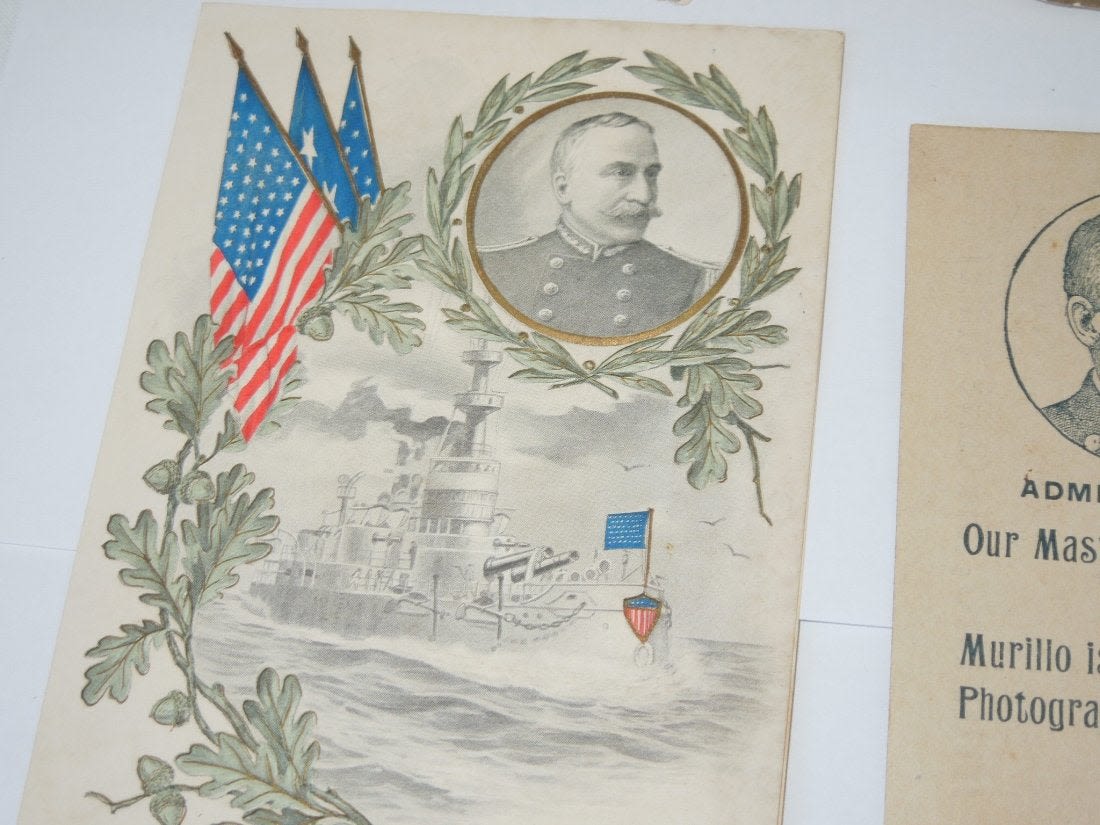 Spanish American War SAW Admiral Dewey Photos & Cards. You will receive the following 4 items. USS Olympia photo. The USS Olympia was Admirals Deweys Flagship. Size is 3 x 4 inches. There is a 1-inch tear on the left side. Admiral Dewey in a photo with a silver decoration surrounding the photo. Size is 3 x 4 inches. Admiral Dewey Our Master of the Seas. Free Souvenir Card from the 1904 St. Louis Exposition and Fair. Approximate size is 2.5 x 3.5. Good condition. Admiral Dewey unused card with picture and ship. Size is 3.5 x 5 inches. Good unused condition with a small tear at the top.
