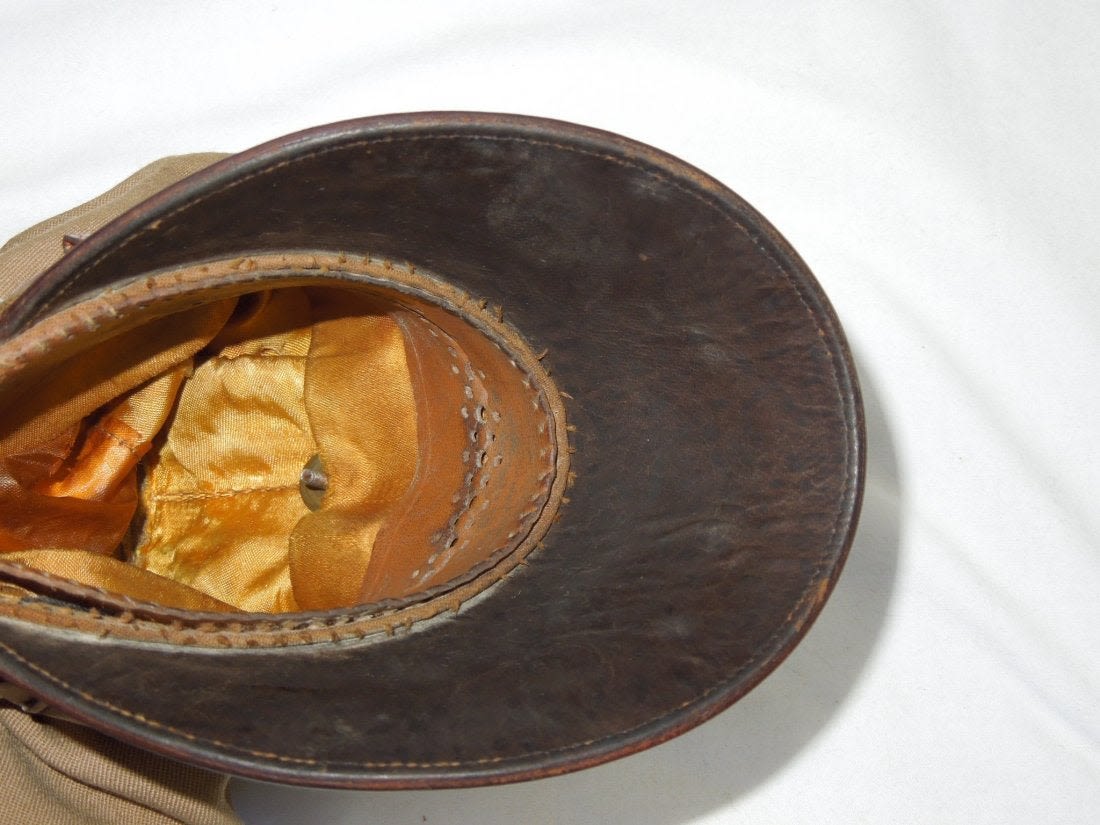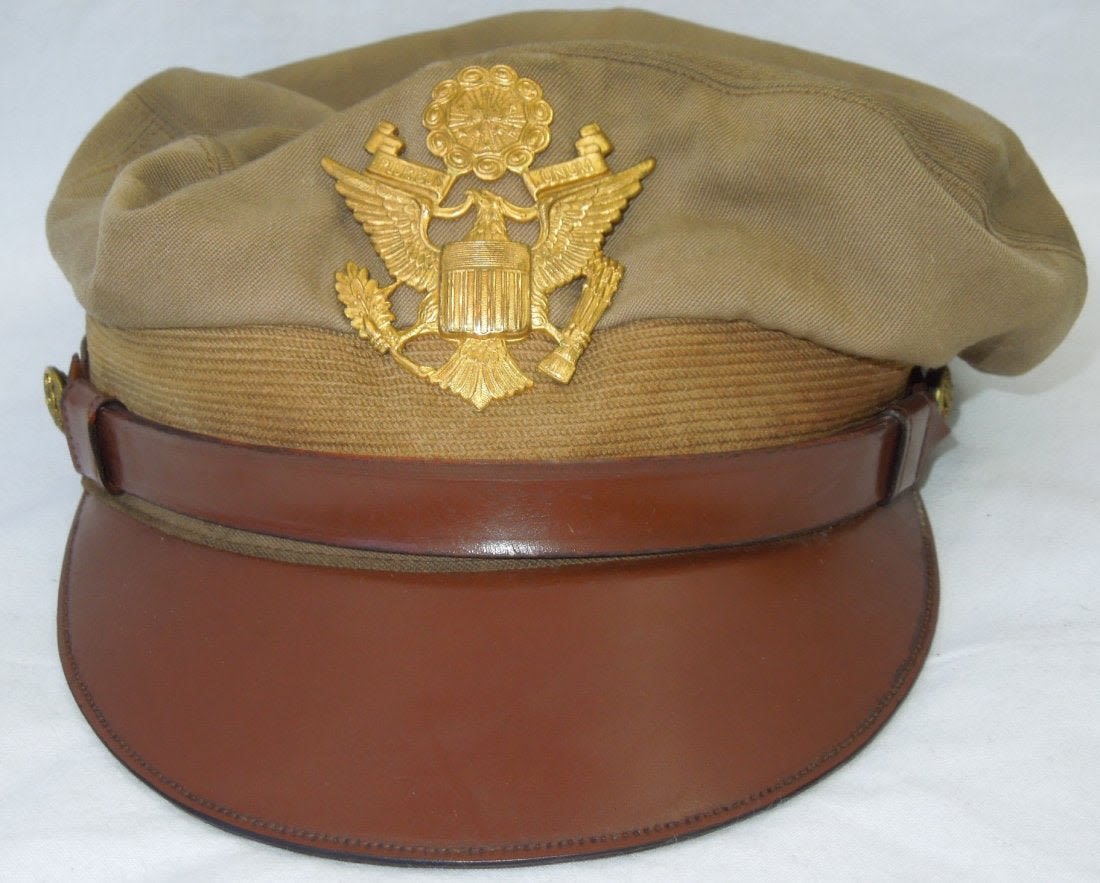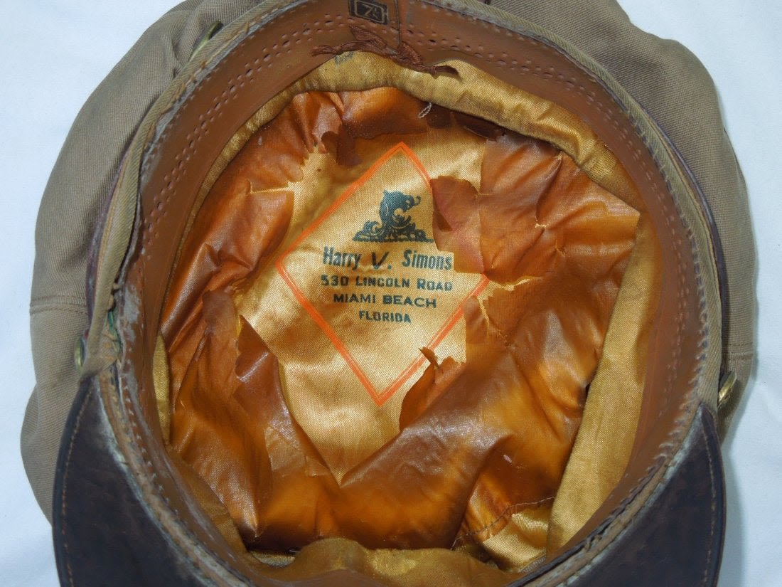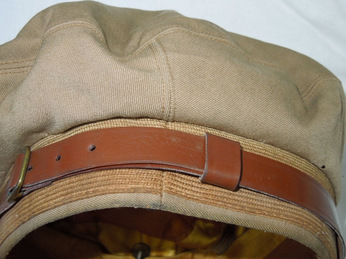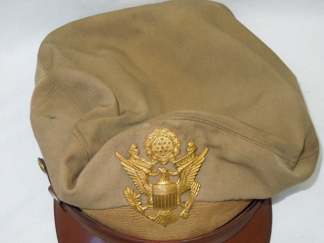 Original WWII era khaki USAAF crusher cap with a backstrap. The visor is fairly pliable as shown in the photo. Some of the lining has broken away. (II B 14)