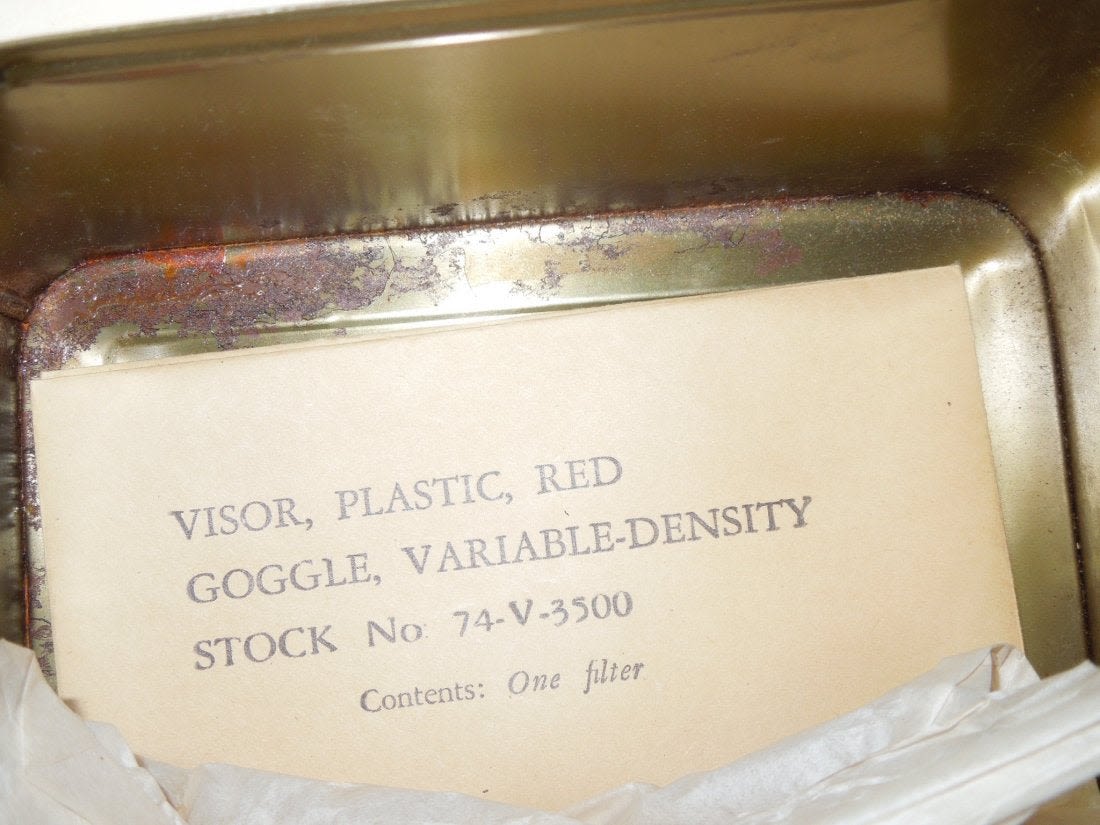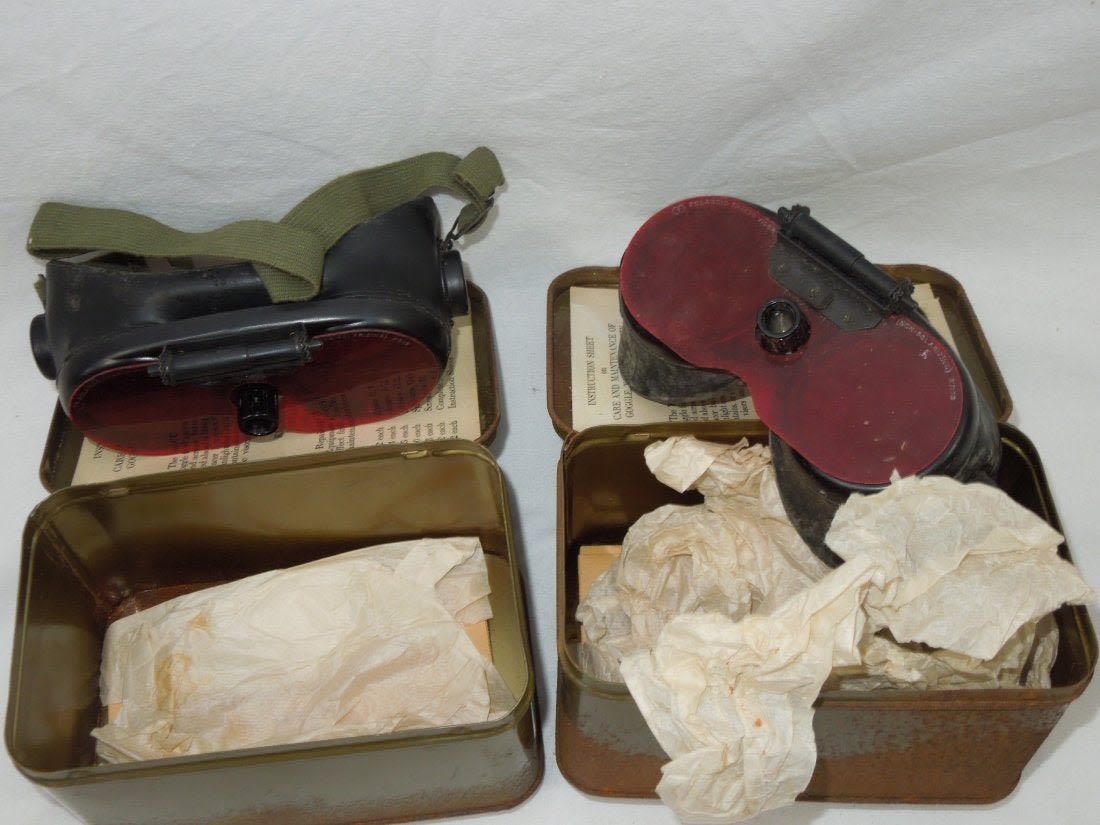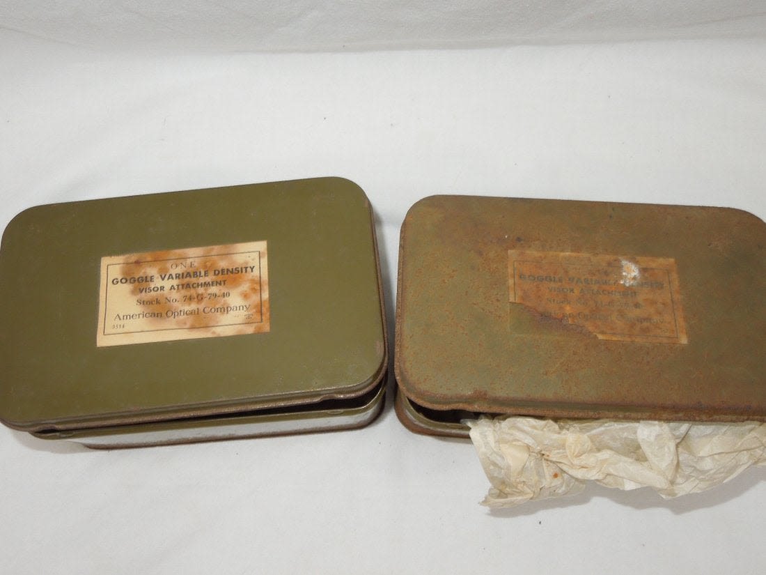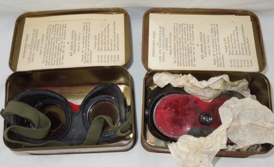 Lot of two Variable Density Goggles, in the original metal boxes, from the WWII era. The shutters on each work tinting the lenses.