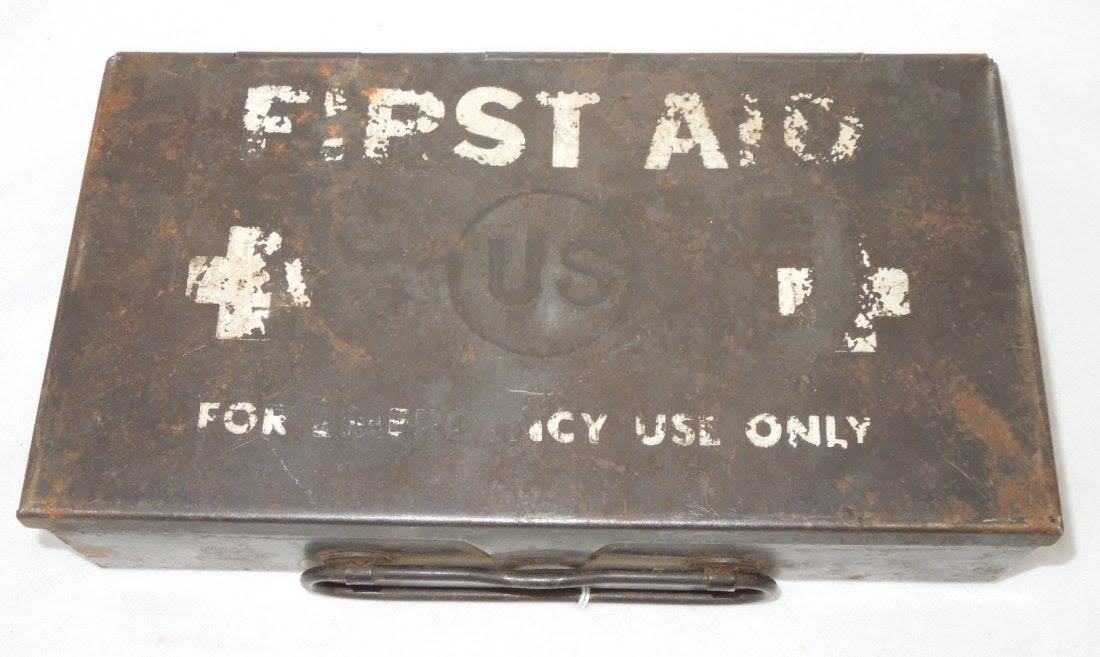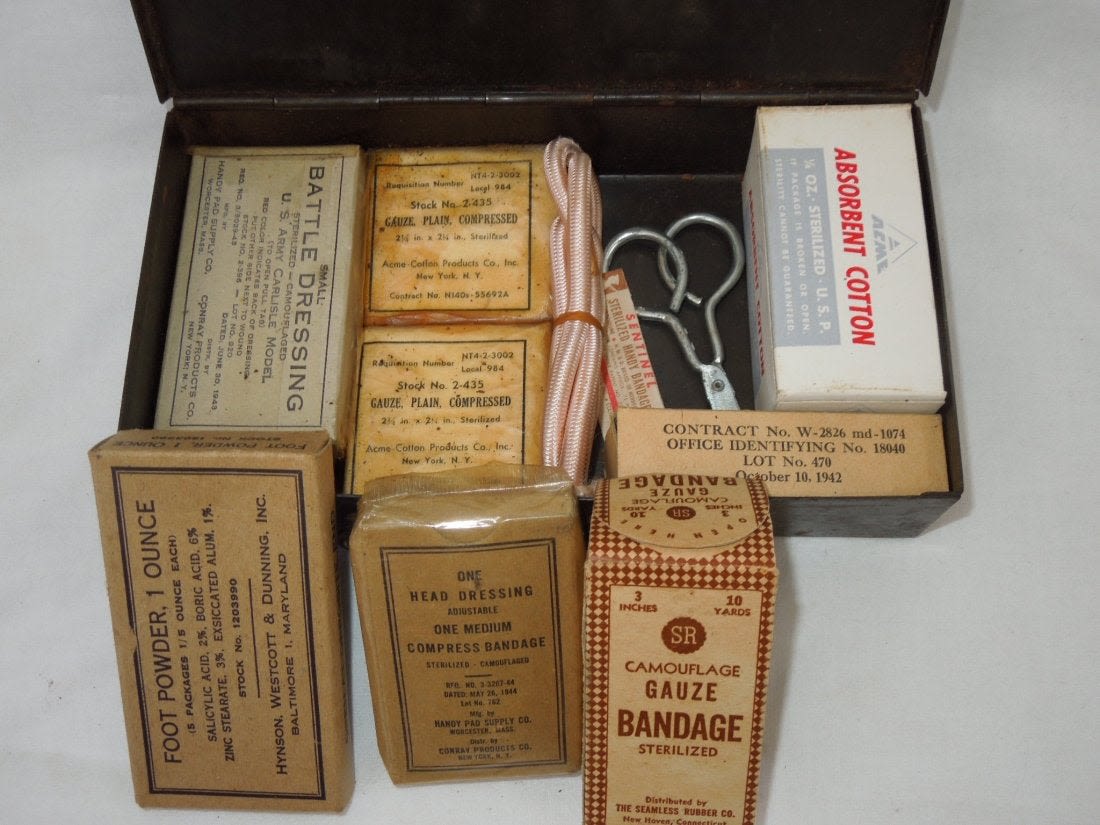 WWII First Aid Medical Kit. Metal case for use inside a vehicle. Comes with the following contents. Contents include Foot Powder, Battle Dressing (dated 1943), Head Dressing (dated 1944), Gauze (2) packs, scissors, camouflage gauze bandage, sterilized handy bandage, absorbent cotton, iodine swabs (dated 1942) and a piece of pink unidentified item. Good condition for its age. (III B 20)